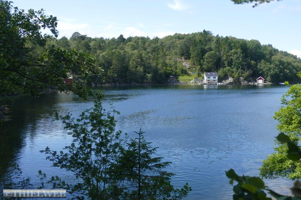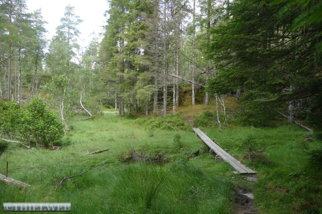 Im Anschluss fahren wir weiter nach Eikeland / Auklandshamn wo wir den 5,2 km langen Wanderweg Storavatnet nehmen. Ein hauptsächlich durch Wald führender Wanderweg, der ab und an über Stege sumpfiges Gebiet überwindet und wir haben einen schönen Blick auf das Wasser und den Bømlafjord.