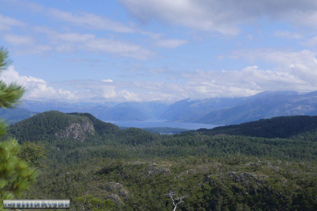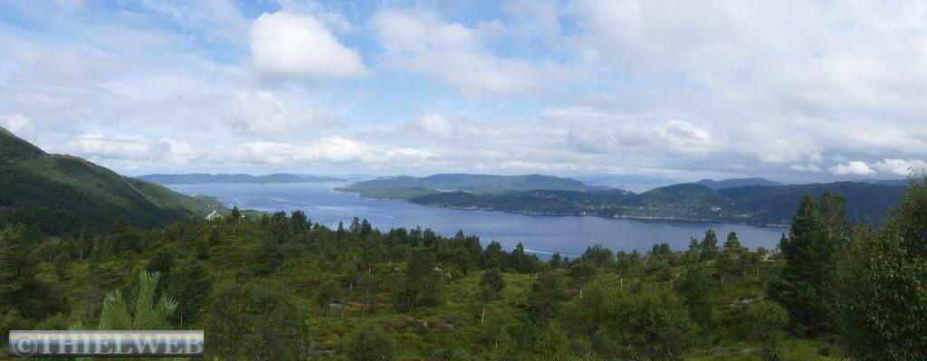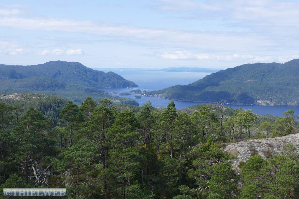 Am Morgen ist der Himmel wieder wolkenverhangen. Wir fahren ein Stück zurück zur Fähre Jektevik nach Hodnanes und setzen über auf die Insel Tysnesøya. Bei Tveitane biegen wir auf einen Weg ab, der uns zum Ausgangspunkt unserer Wanderung auf den Blånuten bringt. Vom Holzlagerplatz gehen wir auf einem Waldweg bergan. Über die morastigen Stellen sind Holzstege gelegt. Ein Bach begleitet und plätschernd am Wegesrand. Das letzte Stück wird sehr steil und über das letzte felsige Stück müssen wir die Hände zu Hilfe nehmen. Dann ist der Gipfel des Blånuten erreicht. Wir genießen die herrliche Aussicht auf die Berge Kvinnherads, den Folgefonn-Gletscher, die Os-Halbinsel, den Bjørnefjord und auf die Insel Stord.