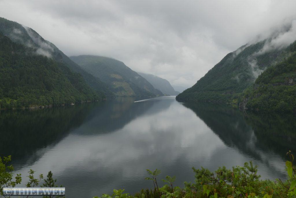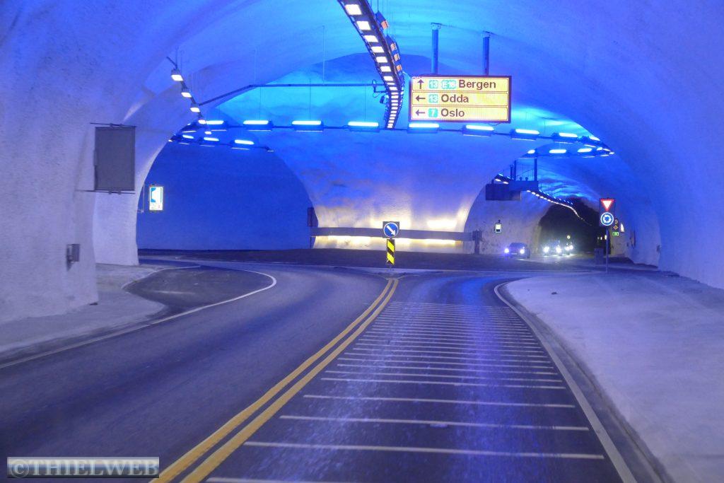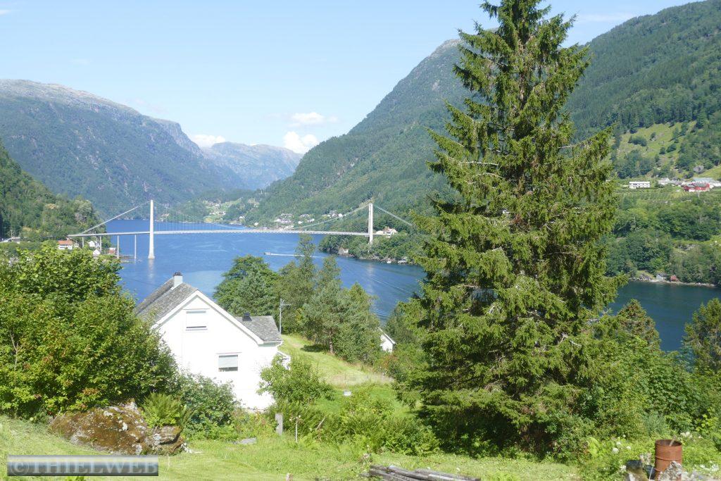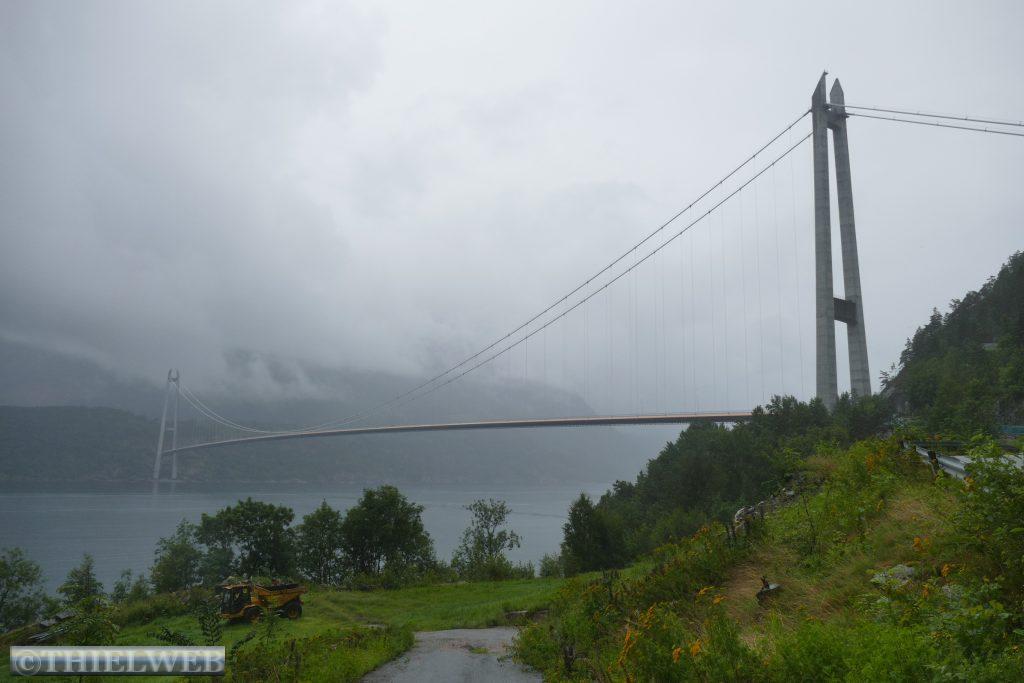Schon in der Nacht fing es an zu regnen. Wir fahren noch bis Granvin auf der Landschaftsroute Hardanger, bevor wir auf die Straße 13 abbiegen und sogleich durch den 7510 m langen, beeindruckenden Valaviktunnelen mit zwei Kreisverkehren fahren. Hier legen wir eine Pause ein, um über die Hardangerbrücke zu laufen. Sie ist mit 1380 m Länge eine der längsten Hängebrücken der Welt.