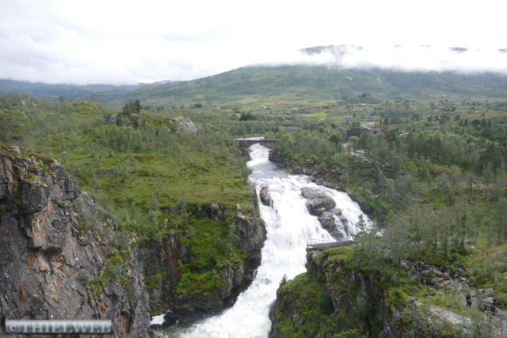 In Eidfjord liegt gerade die Aida, die wir schon am gestrigen Abend im Hardangerfjord gesehen haben. Entsprechend viele Touristen sind hier anzutreffen. Wir fahren weiter auf der Landschaftsroute Hardangervidda, die hier beginnt und bis Haugastøl auf der Straße 7 verläuft. Der Regen nimmt zu. Am Parkplatz des Norwegischen Naturzentrums Hardanger verweilen wir zu Mittag. Die anschließende Strecke durch das Tal Måbødalen vom reißenden Fluss begleitet ist wunderschön und bildet den Übergang zwischen Eidfjord und der Hardangervidda. Dies ist Nordeuropas größtes Hochgebirgsplateau mit ca. 10.000 m². Es soll hier der größte Stamm wilder Rentiere leben. Mal sehen, ob wir eines sehen. Da es immer noch regnet, beschließen wir kurz vor dem berühmtesten Wasserfall Norwegens, dem Vøringsfossen mit einer Fallhöhe von 182 m, das Wetter auszusitzen. Das Warten lohnt sich, gegen 16 Uhr hört es auf zu regnen und wir laufen zu den spektakulären Aussichtsplattformen nahe dem Fossli Hotel und der neuen Treppenbrücke über den Wasserfall-Canyon. Gewaltige Wassermassen stürzen das Måbødalen-Tal hinunter.