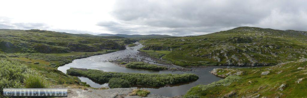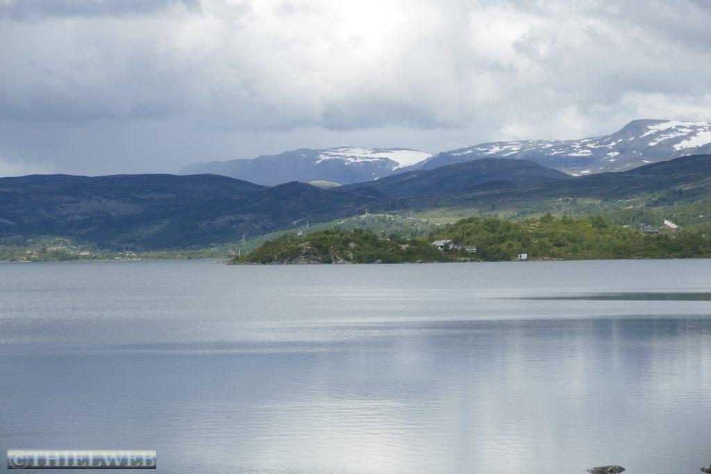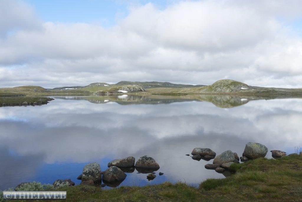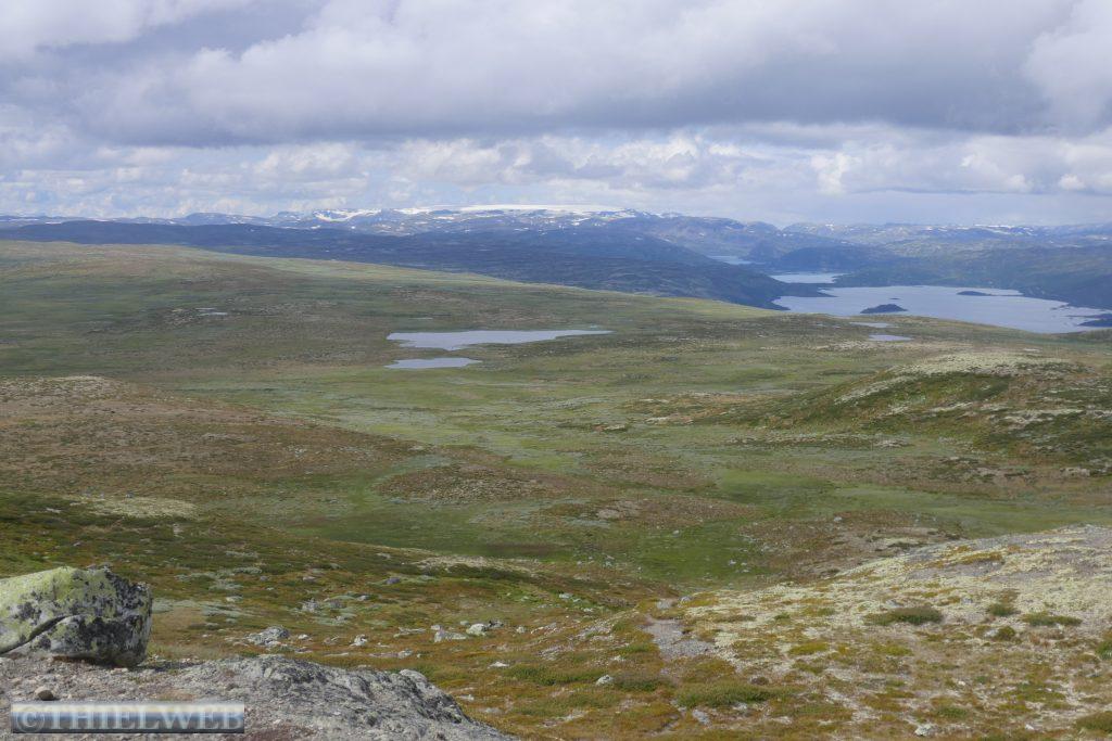 Da in unserer für heute geplante Wanderung bereits in der Beschreibung von sumpfigem Gelände die Rede war, haben wir nach dem gestrigen Regen Bedenken und fahren stattdessen weiter. Zunächst über die Hochebene Hardangervidda. Scheinbar unendliche Weiten, kein Strauch, kein Baum. Dafür Gletscher und Bergseen, wohin man schaut. Wir machen Halt in Ustetind wo wir eine Wanderung von ca. 900 m auf den 1376 m hohen Ustetind machen. Von oben haben wir eine fantastische Aussicht auf die Ebene im Süden und den Gaustatoppn sowie auf der Nordseite auf den 35 km langen Gebirgskamm des Hallingskarvet. Danach fahren wir weiter bis Torpo, unserem Schlafplatz für die Nacht.