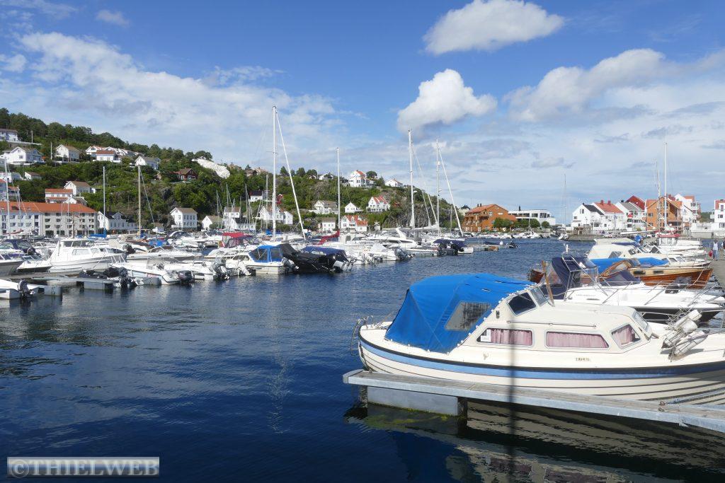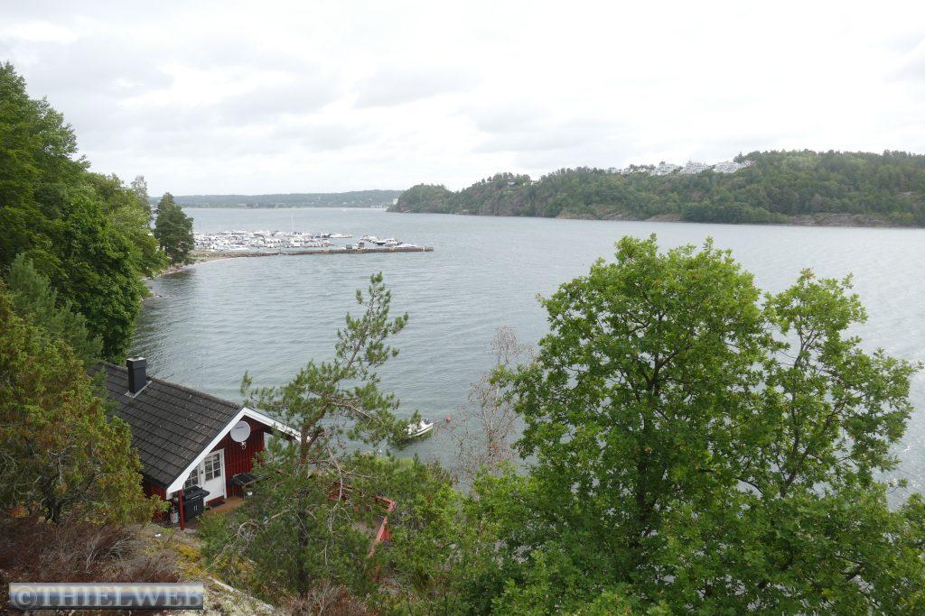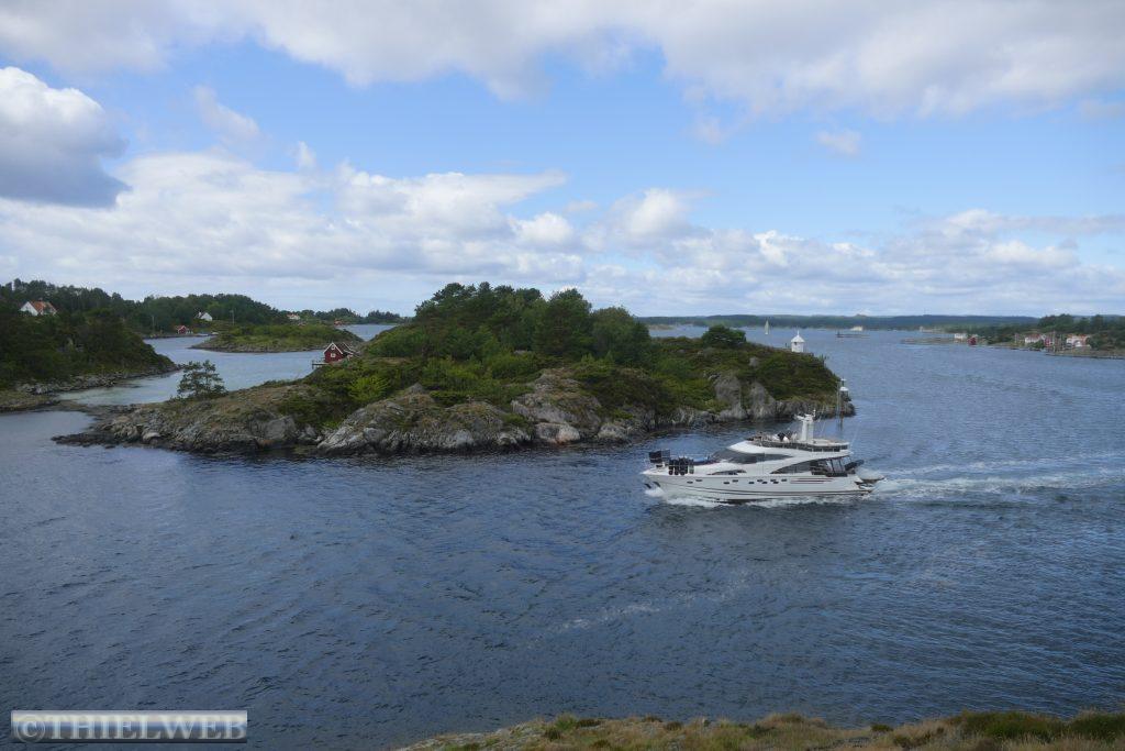 Nach einer ruhigen Nacht, in der es mehrere Male geregnet hat, fahren wir ein kleines Stück zurück um dann auf die Landzunge des Oslofjords bis nach Verdens Ende, dem Ende der Welt, mit fantastischem Blick auf Skagerrak. Der Wind peitscht kräftig und die Wellen brechen sich an hunderten kleiner Schären. Im Anschluss fahren wir 165 km weiter nach Risør. Eine abenteuerliche kleine Straße mit ordentlicher Steigung ist die Anfahrt zu unserem Parkplatz am Risørflekken. Zum Glück ist gerade noch ein Platz frei. Wir warten den erneuten kräftigen Regenschauer ab, bevor wir zum Aussichtspunkt gehen und anschließend hinunter in die Stadt mit ihren malerischen, weißen Holzhäusern. Da wir auf diesen engen Parkplatz nicht über Nacht bleiben wollen, wechseln wir zu einem etwas außerhalb gelegenen Platz an den Risørhallen.