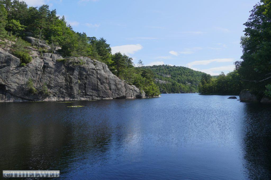 In der Nähe von Kristiansand gibt es zwei spektakulär geformte Felsformationen, den Lille Prekestolen und Lille Kjeragbolten. Sie ähneln ihren populären Geschwistern am norwegischen Lyseefjord, den Prekestolen und Kjeragbolten sind jedoch mit ca. 100 m Höhe nicht so abenteuerlich hoch und leichter zu erwandern. Wir nehmen die Wanderung in Angriff am See Fiskåvannet im Wandergebiet Vågsbygdskauen. Die Wanderung durchquert einige Täler mit steilen An- und Abstiegen zwischen Felsformationen und über Brücken überqueren wir Bäche und Flussläufe. Blaubeersträucher unterbrechen unser Wanderung immer wieder. Auf dem Plateau Prekestolen endet der Weg abrupt auf einem ca. 100 m überhängenden Felsen mit fantastischer Aussicht. Nach ca. 6 km sind wir am Wohnmobil zurück.