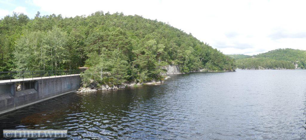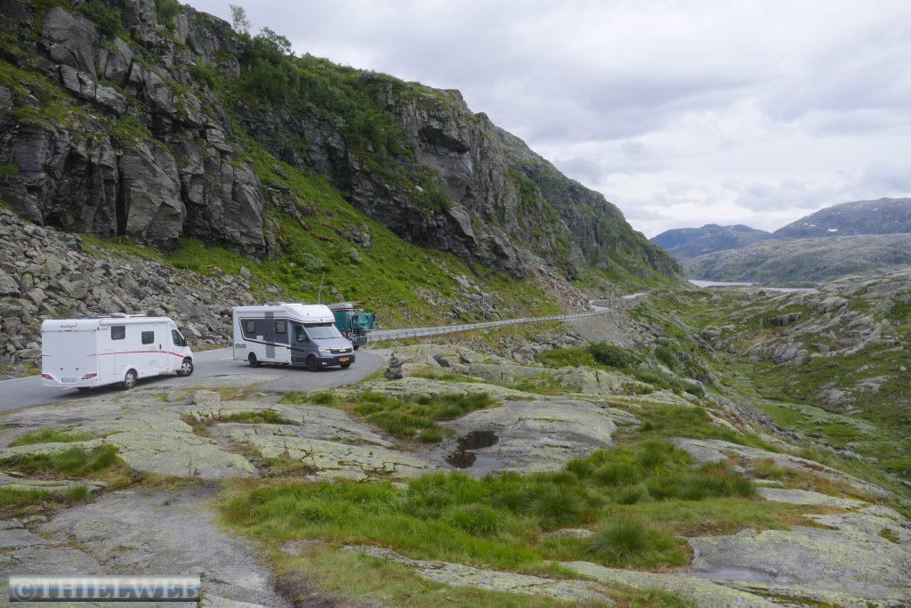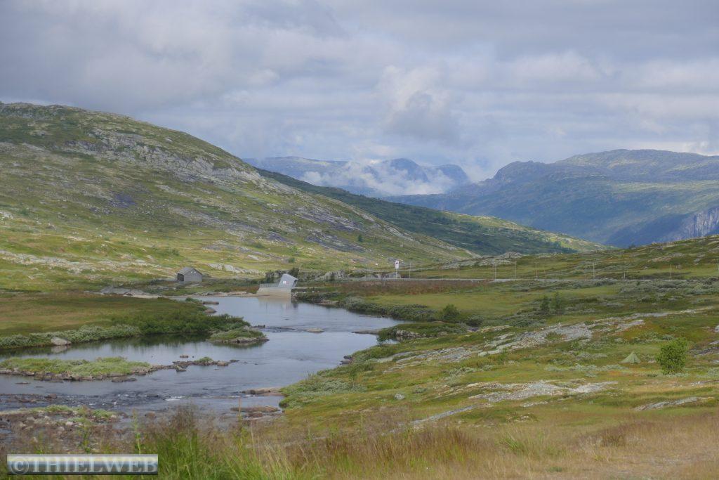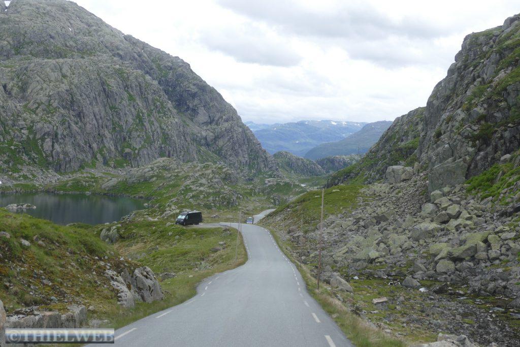 Wir setzten unsere Fahrt auf der Landschaftsroute Ryfylke fort und fahren auf dem Gebirgspass nach Røldal. Wir haben gerade Sauda hinter uns gelassen, als sich ein Steinchen in unsere Windschutzscheibe „verknallt“. Zum Glück ist diese mehrfach verklebt, sodass wir die Scheibe in Deutschland reparieren lassen können. Die Landschaft wird immer grandioser. Wir erreichen fast 1.000 Höhenmeter. Kleine Schneefelder schmiegen sich an die Berge. Danach geht es steil bergab und auf der Straße Nr. 13 Richtung Odda. Nach ein paar Kilometern biegen wir auf die Straße 134 ab und machen Stopp in Rullestad. Vom Parkplatz führt ein Rundweg um den See Rullestadvatnet. Zwei Wasserfälle stürzen von den Bergen herab. Über Wurzeln verläuft der Weg gesäumt von Heidelbeersträuchern. Mehrere kleine Bäche müssen wir über Steine queren. An einer abschüssigen Stelle hilft ein Seil. Zwischendurch schüttet sich eine Wolke aus.