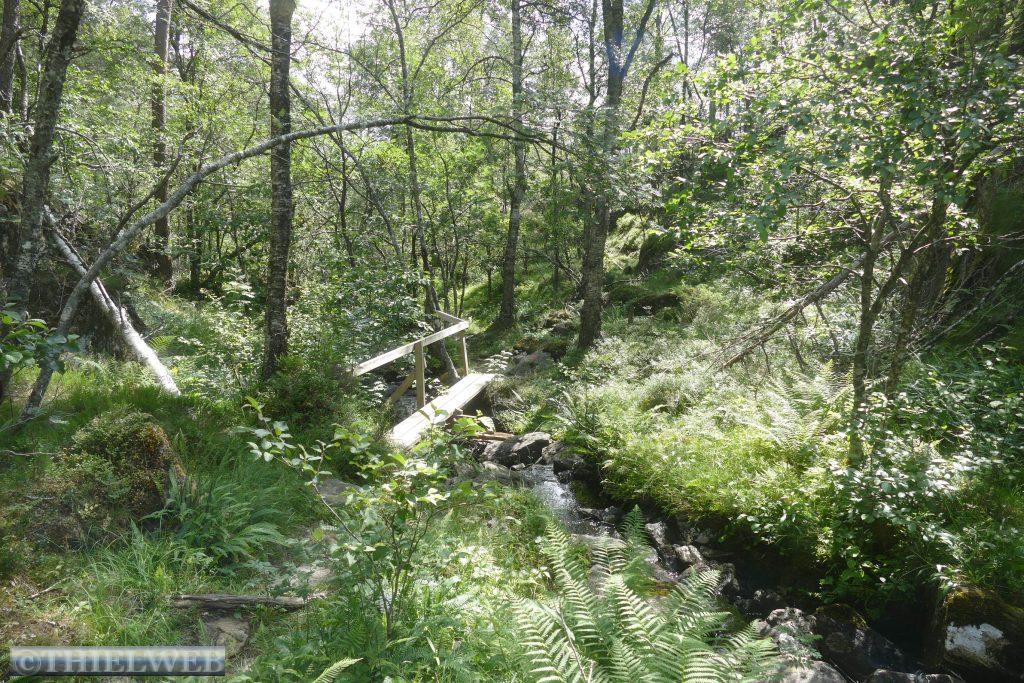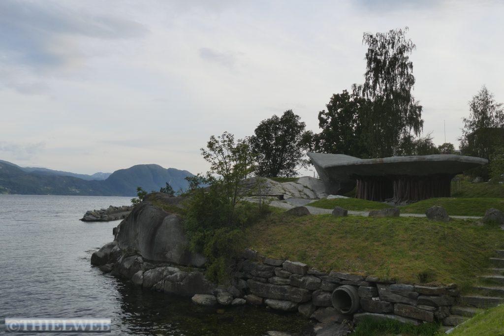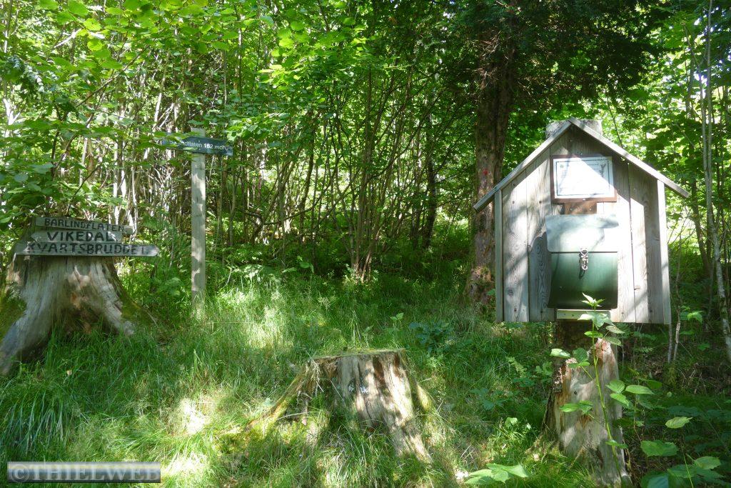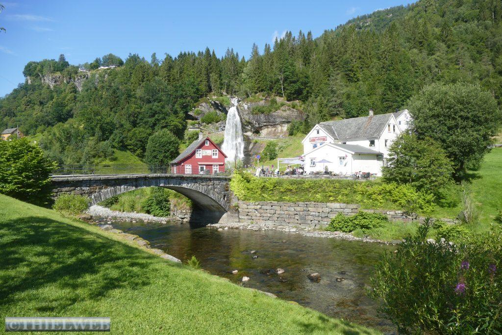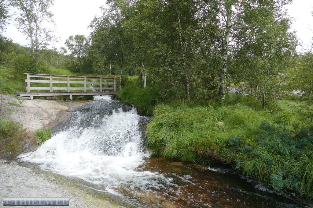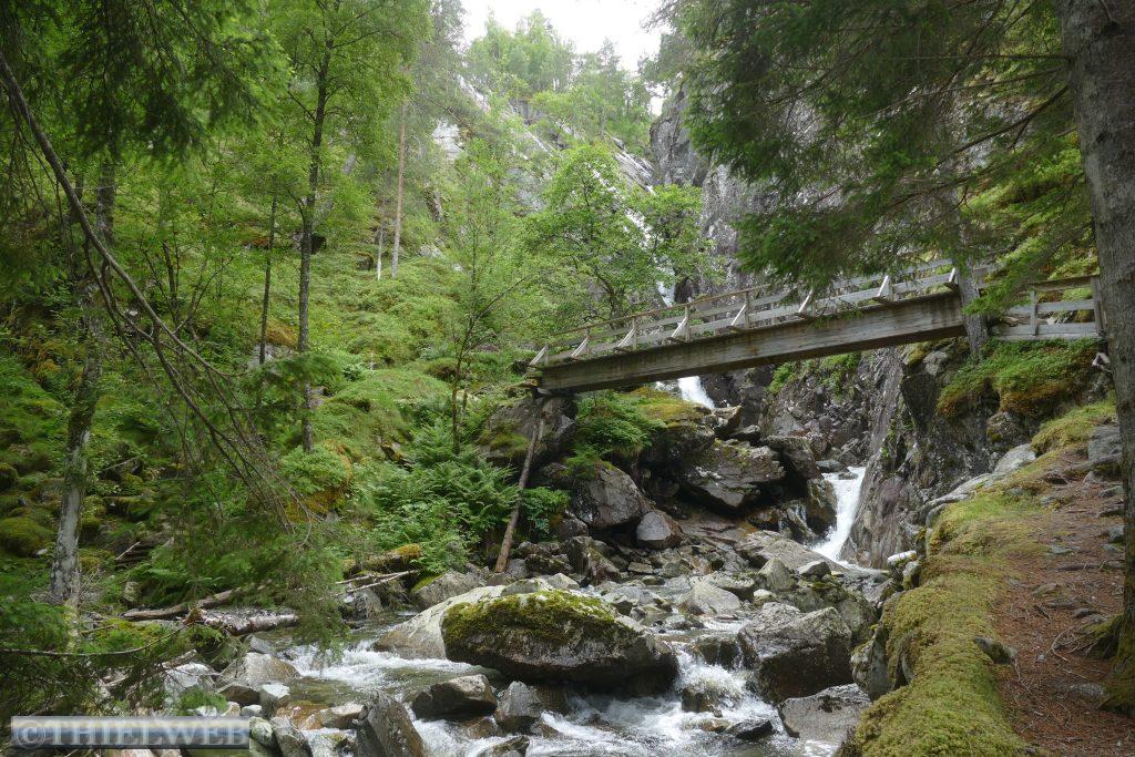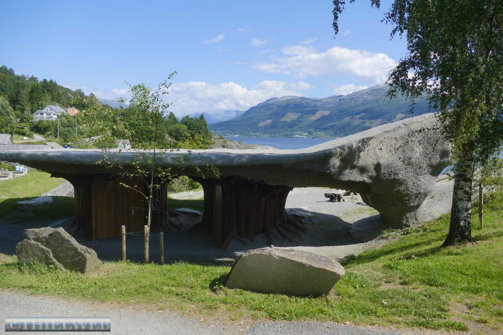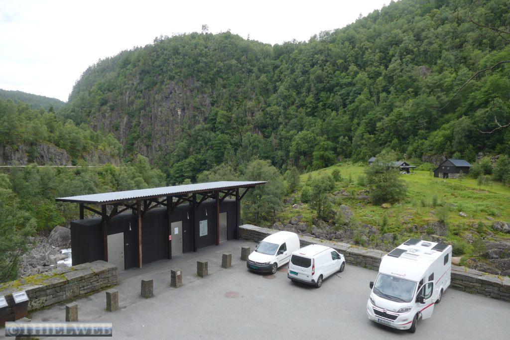 Wir setzten anschließend unsere Fahrt fort, überqueren die Brücke über den Fyksesund und kommen zum Rastplatz in Steinstøberget. Von hier blicken wir auf den Hardangerfjord und den Gletscher Folgefonna. Ein paar Kilometer weiter starten wir zu unserer zweiten Wanderung durch das Naturschutzgebiet Barlindflaten. Ein Waldweg führt uns durch uriges Gelände, wobei wir mehrere Bachüberquerungen haben. Der Rückweg erfolgt über die Straße Nr. 7. Da wir dazu keine Lust haben, fragen wir einen Norweger, ob er uns mit zurücknimmt. Er kennt den Wanderweg, den wir gegangen sind, und bringt uns bis zu unserem Parkplatz. Wir folgen der Straße noch bis zum Rastplatz Tyrvefjøra. Hier hat die Norwegische Straßenverwaltung eine Toilette errichtet, deren Gebäude aus zwei separaten Toiletten besteht. Die aus Kiefernstämmen und Beton errichtete Toilette hat ein Dach, was über der Landschaft zu schweben scheint.