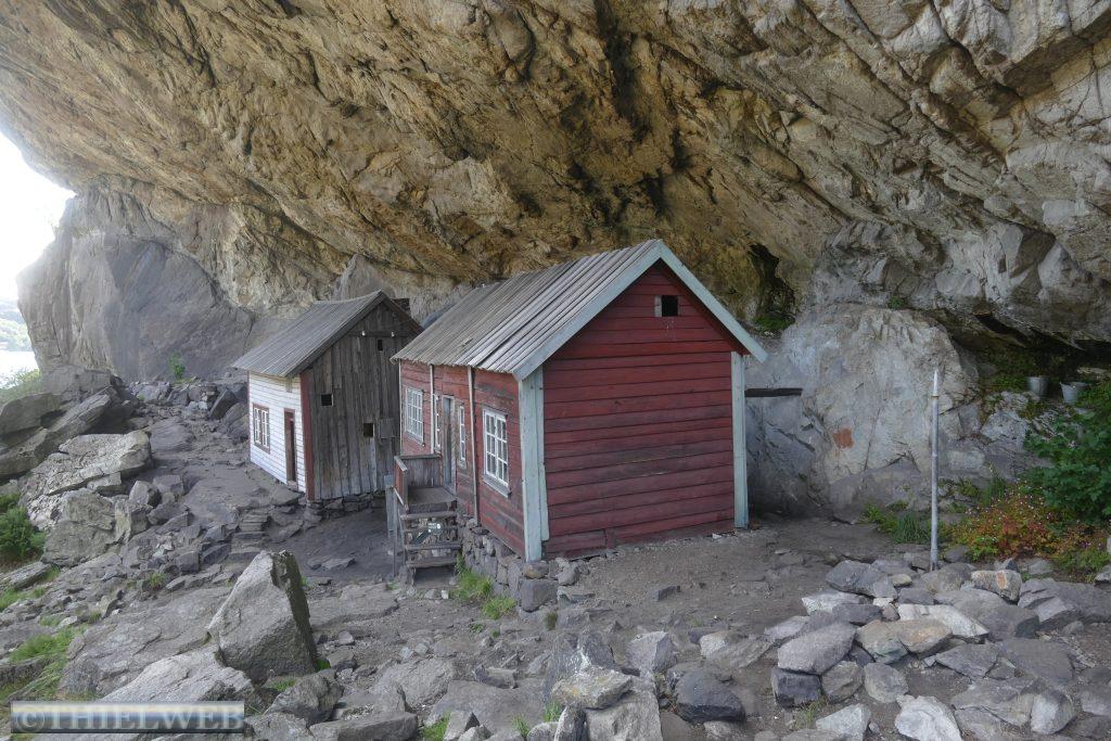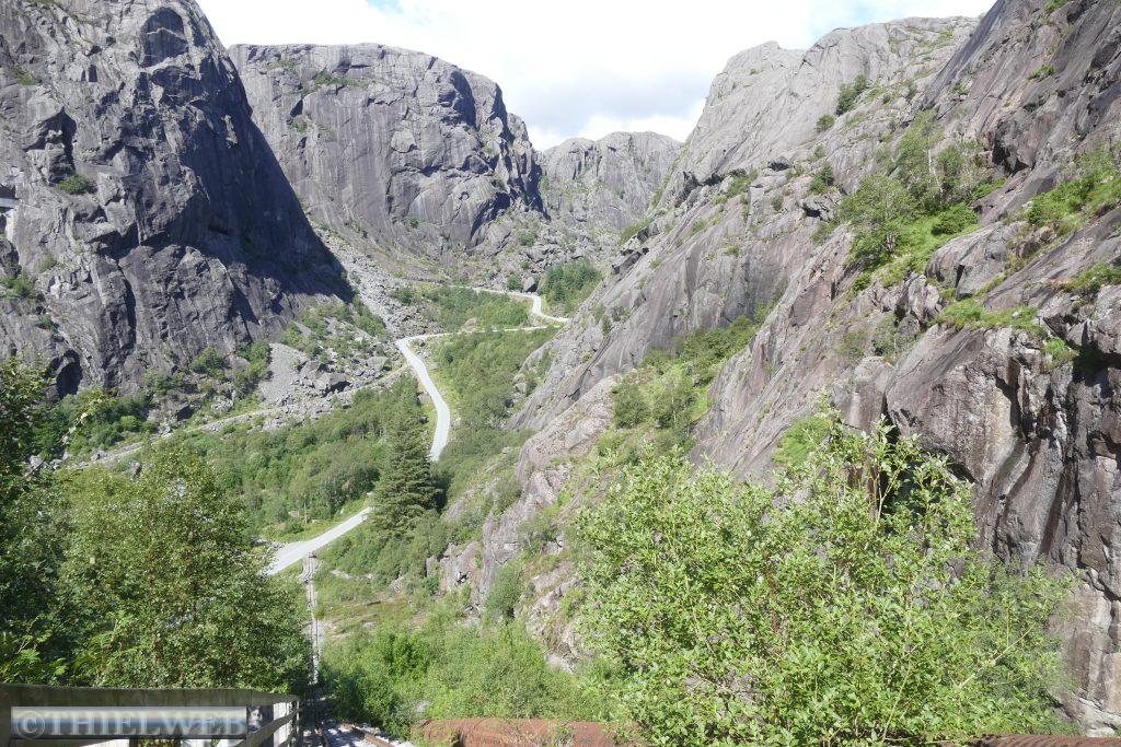 Danach fahren wir weiter durch eine fantastische Felslandschaft bis zu den beiden kleinen Häusern von Helleren, geduckt befinden sie sich unter dem grauen Gestein. Hinter dem roten Haus findet man einen Eimer, in dem seit ewigen Zeiten Tropfen aus einer Sickerquelle fallen. Um die Aussicht auf den Jøssingfjord genießen zu können, steigen wir entlang der alten Bahnstrecke auf den Fladen.