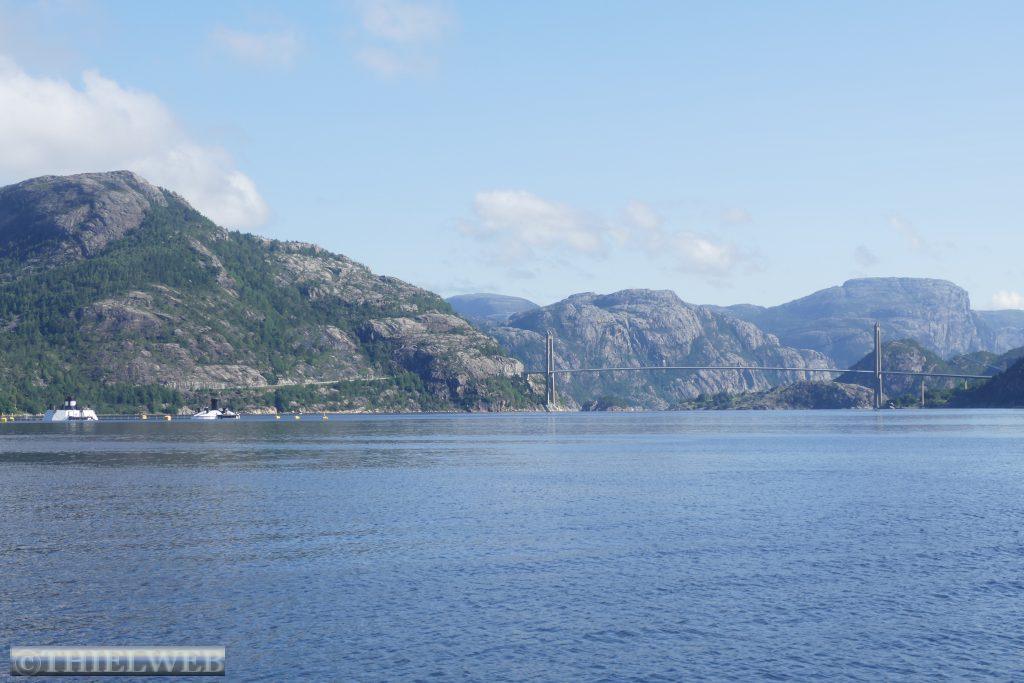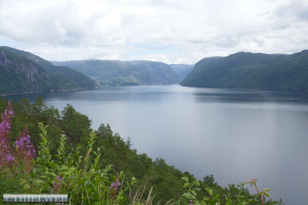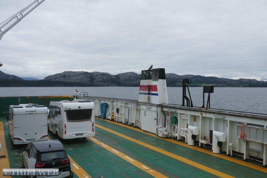 Heute wollen wir auf der Landschaftsroute Ryfylke weiter in Richtung Norden fahren. Bei Lauvvik nehmen wir heute unsere erste Fähre nach Oanes. Die Straße Nr. 13 verläuft durch das Inselreich des Lysefjords bis ins Hochland in Sauda. Kahle Hochgebirge, grüne üppig bewachsene Hügel und tiefe Fjorde mit steilen Berghängen begleiten die Straße und wir halten immer wieder für ein Foto an. Der erste Aussichtspunkt ist Høllesli mit tollem Blick auf den Lysefjord. Von Hjelmeland nach Nesvik nehmen wir die zweite Fähre. Sie fährt so ruhig und leise, dass wir erst gar nicht bemerken, dass wir bereits fahren. An der Westseite des Sandsfjords stoppen wir am Rastplatz Ostasteidn direkt hinter der Sandsfjordbrücke, bevor wir in Ropeid kurz an der Fähre, die derzeit nicht in Betrieb ist, ein Foto machen. Mit gewaltiger Kraft stürzt der Svandalsfossen in die Tiefe. Der kleine Parkplatz ist besetzt und wir warten, bis ein Auto wegfährt, bevor wir die Stufen entlang des Wasserfalls erklimmen. Anschließend suchen wir uns einen Parkplatz für die Nacht in Sauda.