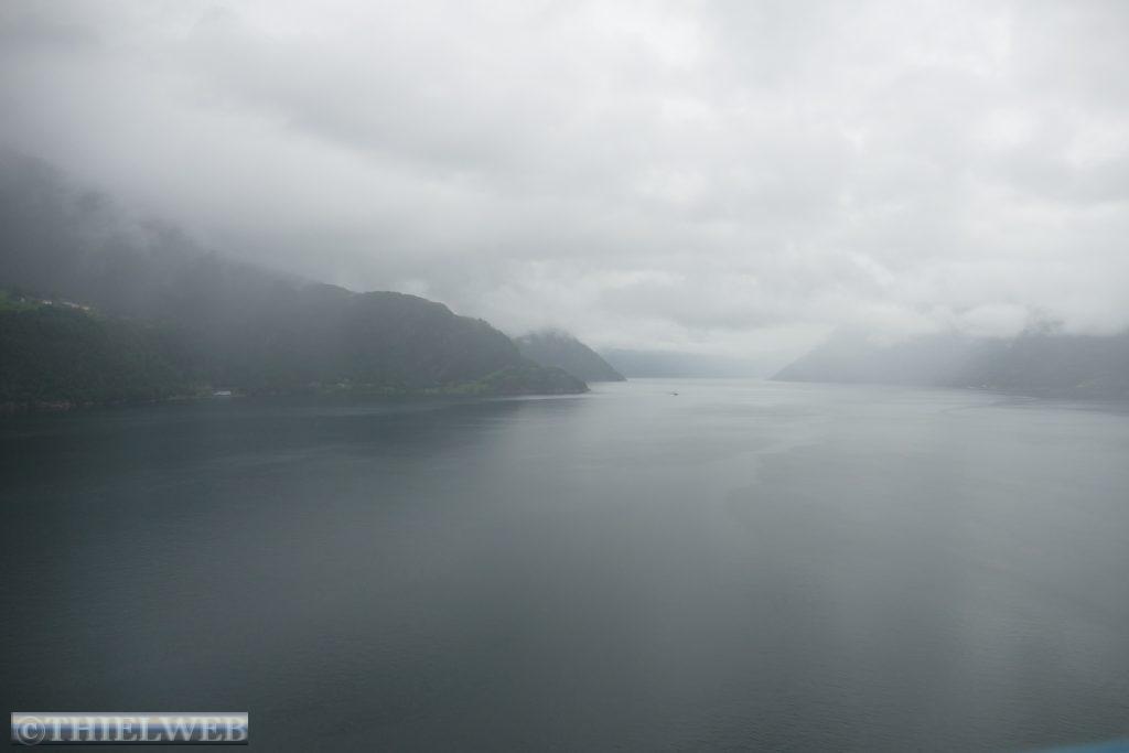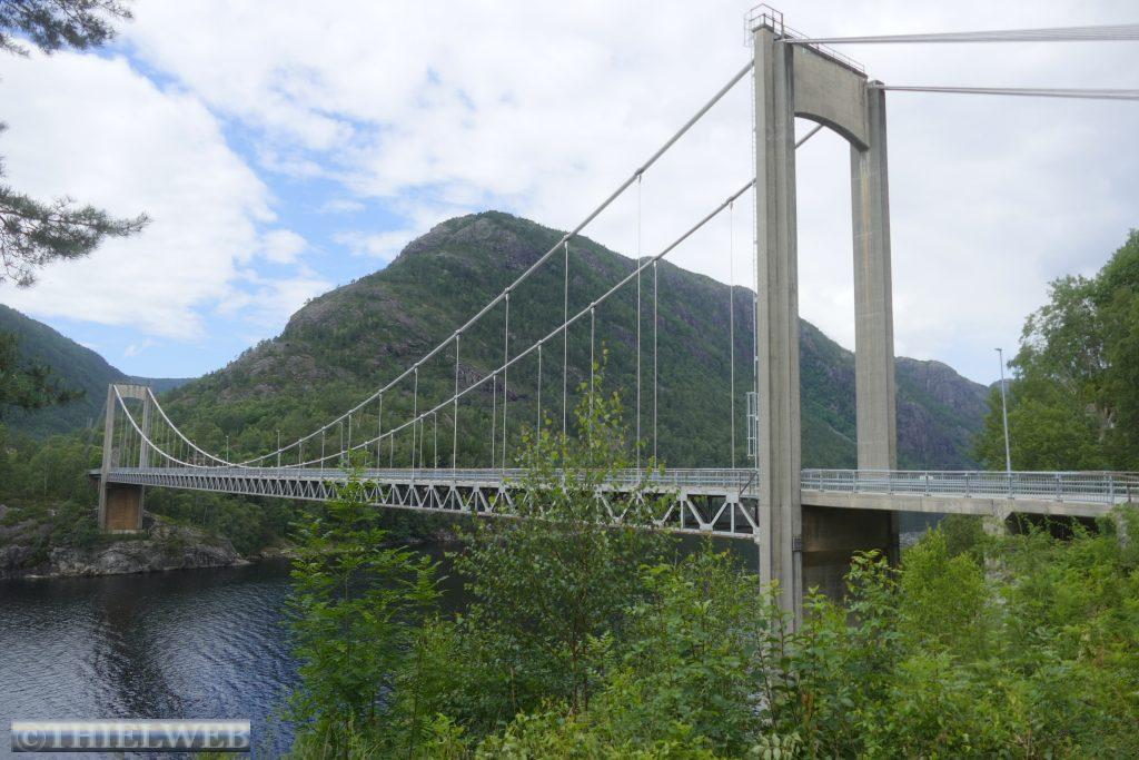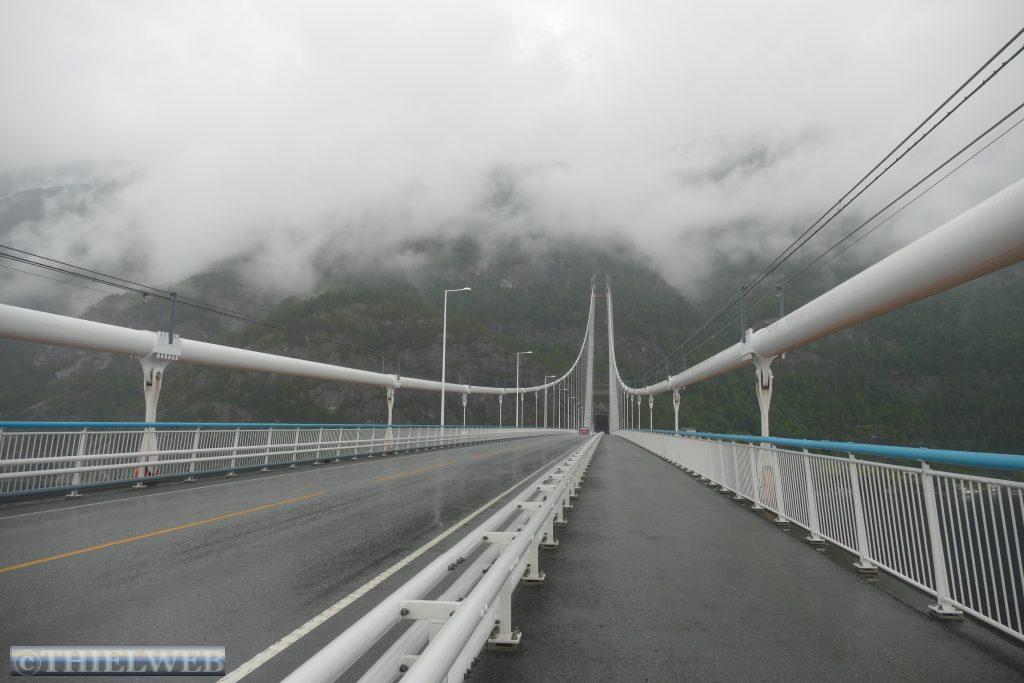 Schon in der Nacht fing es an zu regnen. Wir fahren noch bis Granvin auf der Landschaftsroute Hardanger, bevor wir auf die Straße 13 abbiegen und sogleich durch den 7510 m langen, beeindruckenden Valaviktunnelen mit zwei Kreisverkehren fahren. Hier legen wir eine Pause ein, um über die Hardangerbrücke zu laufen. Sie ist mit 1380 m Länge eine der längsten Hängebrücken der Welt.