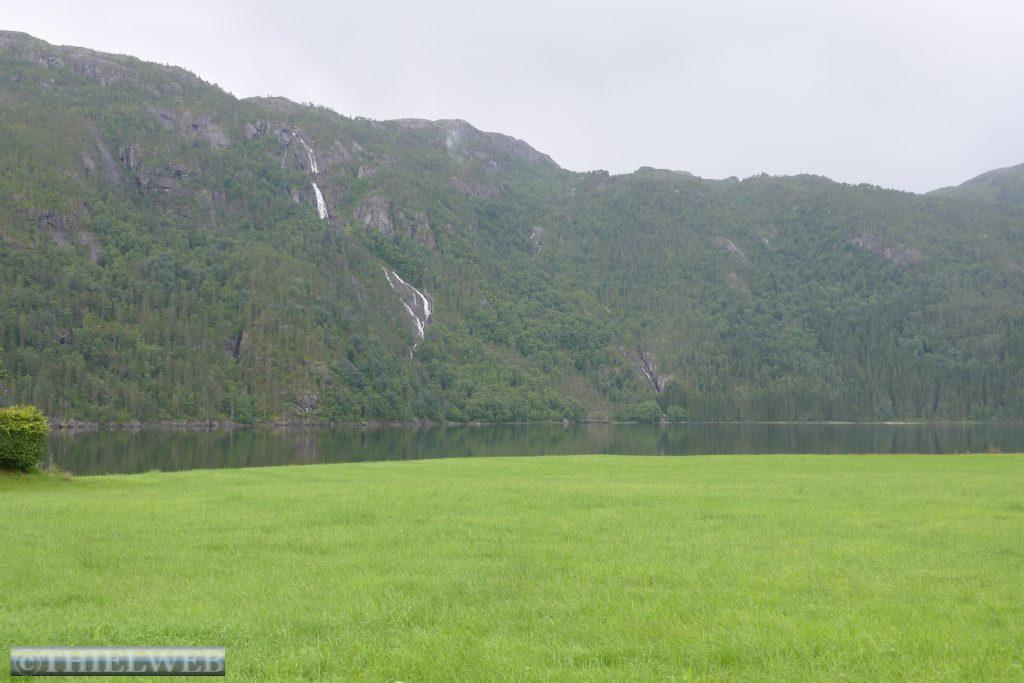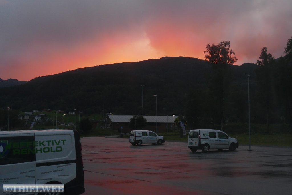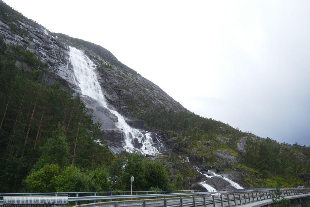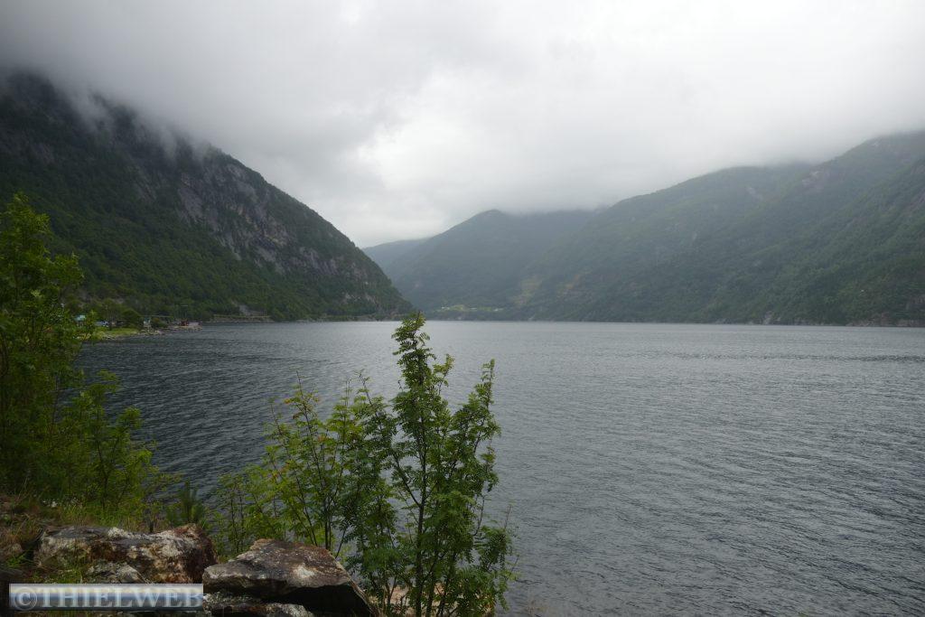 Danach fahren wir noch ein Stück weiter und suchen uns einen Platz für die Übernachtung. Schon von Weitem sehen wir eine riesigen Wasserfall aus x Metern hinunterstürzen. Wir halten am Langfoss Wasserfall, mit 612 m der fünfthöchste Wasserfall Norwegens. Danach biegen wir von der Hauptroute ab und folgen der alten Straße Åkrafjordvegen, wo wir einen traumhaften Schlafplatz finden. Schade, dass es mal wieder in Strömen regnet.