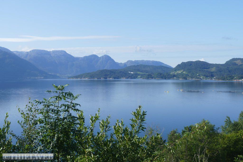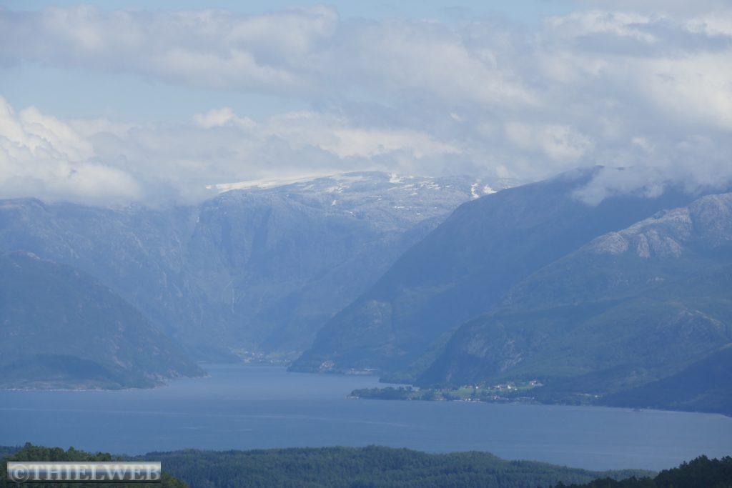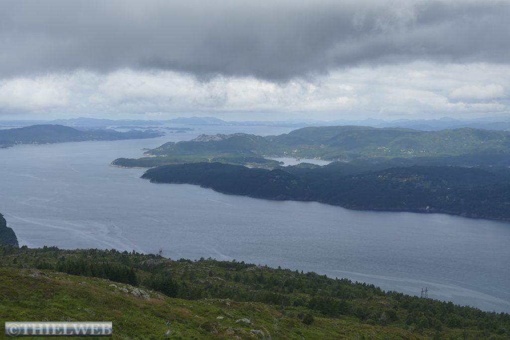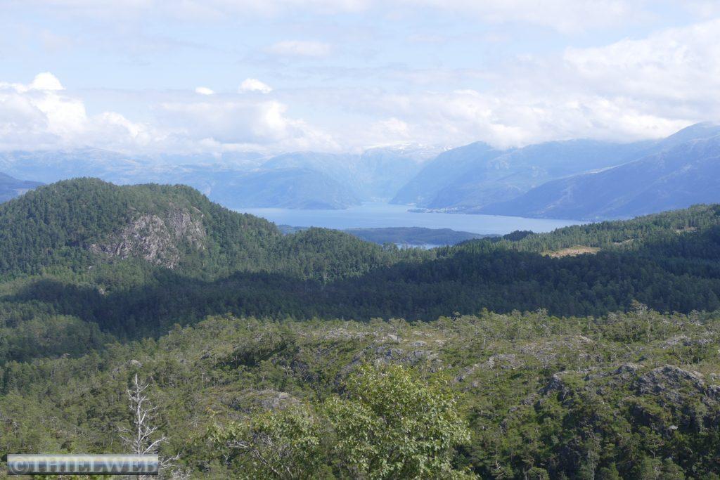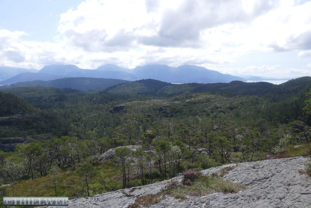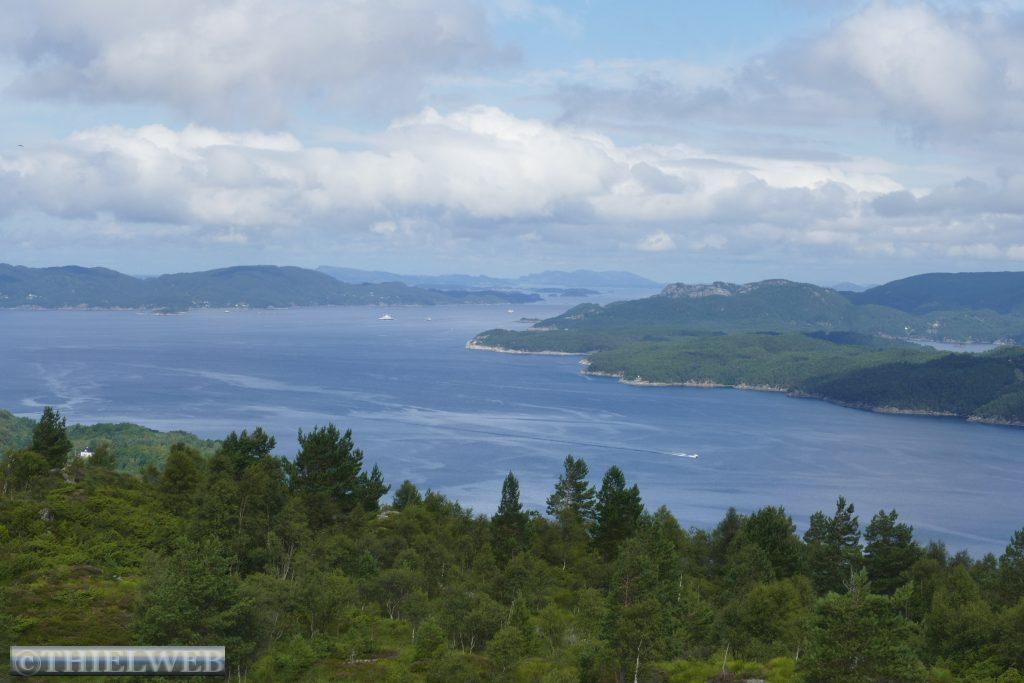 Am Morgen ist der Himmel wieder wolkenverhangen. Wir fahren ein Stück zurück zur Fähre Jektevik nach Hodnanes und setzen über auf die Insel Tysnesøya. Bei Tveitane biegen wir auf einen Weg ab, der uns zum Ausgangspunkt unserer Wanderung auf den Blånuten bringt. Vom Holzlagerplatz gehen wir auf einem Waldweg bergan. Über die morastigen Stellen sind Holzstege gelegt. Ein Bach begleitet und plätschernd am Wegesrand. Das letzte Stück wird sehr steil und über das letzte felsige Stück müssen wir die Hände zu Hilfe nehmen. Dann ist der Gipfel des Blånuten erreicht. Wir genießen die herrliche Aussicht auf die Berge Kvinnherads, den Folgefonn-Gletscher, die Os-Halbinsel, den Bjørnefjord und auf die Insel Stord.