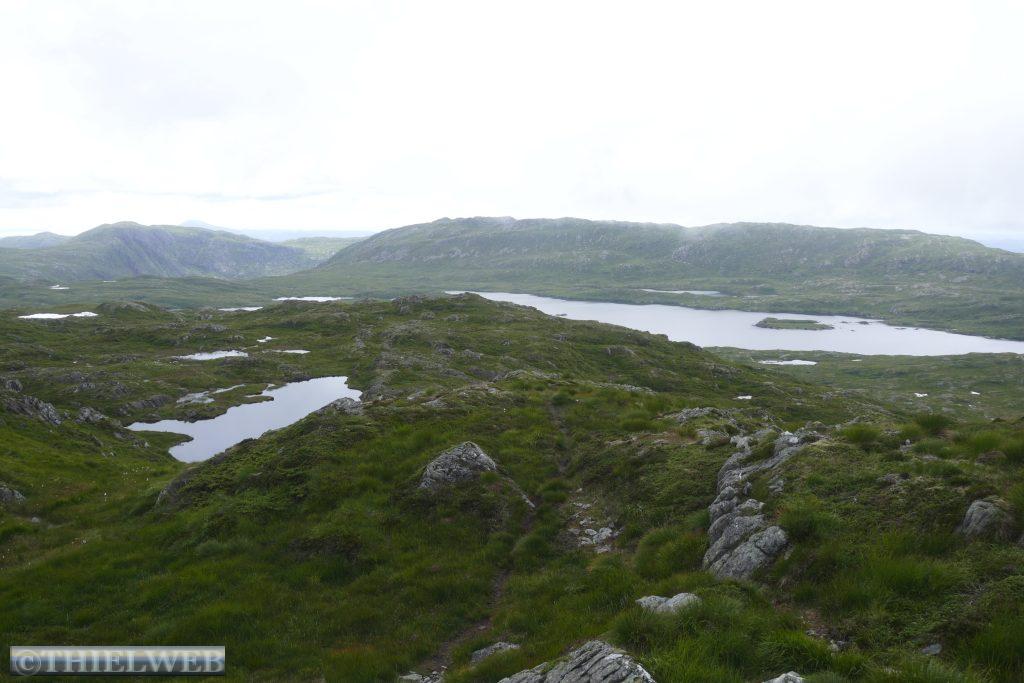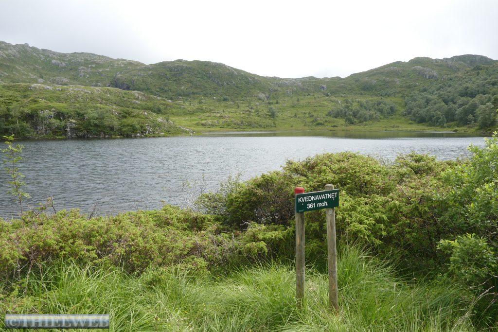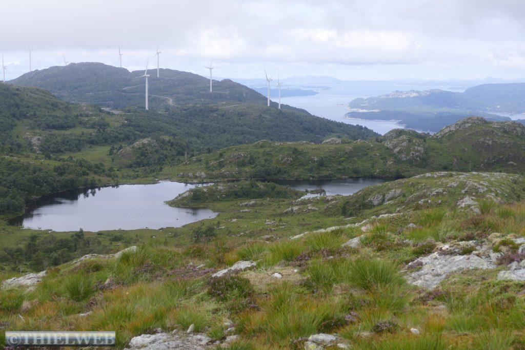 Mal wieder leichter Nieselregen am Morgen, wir fahren weiter Richtung Norden durch den Bømlafjordtunnel, der mit 7890 m zweitlängste Unterwassertunnel Norwegens. In Vistvik parken wir an der E39 und wandern von 30 m Höhe auf den Tindane mit 575 m über dem Meer. Am Anfang ist ein gewaltiger Anstieg auf einem Schotterweg bis zum Abzweig Tindane. Danach geht es gefühlt unendliche Zeit über Moor, wir müssen immer überlegen, wo wir den nächsten Schritt hinsetzen, um nicht zu versinken. Jeder rettende Stein wird genutzt. Auf den Flächen blüht gerade das Wollgras. Oben angekommen steht die kleine Steinhütte Tindaslottet von der wir eine gute Aussicht auf Teile von Sunnhordland haben. Doch da schon wieder dunkle Wolken heraufziehen, machen wir uns auf den Rückweg, wobei wir am See Svartavatnet vorbeikommen. Bergab entlang des Kvednavatnet-Sees kommen wir nach 11 km zum Wohnmobil zurück.