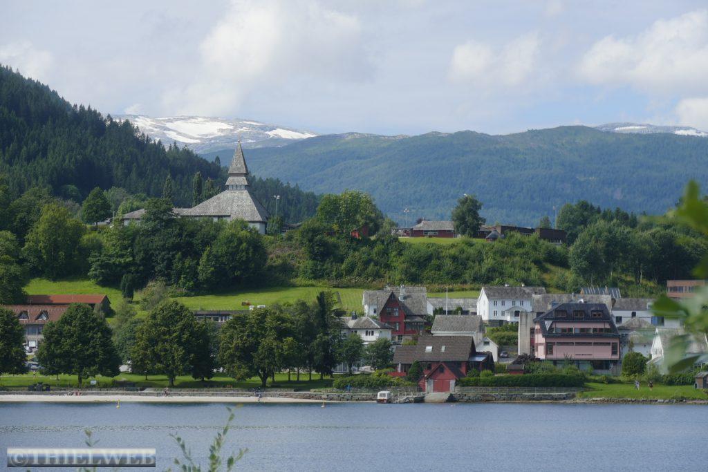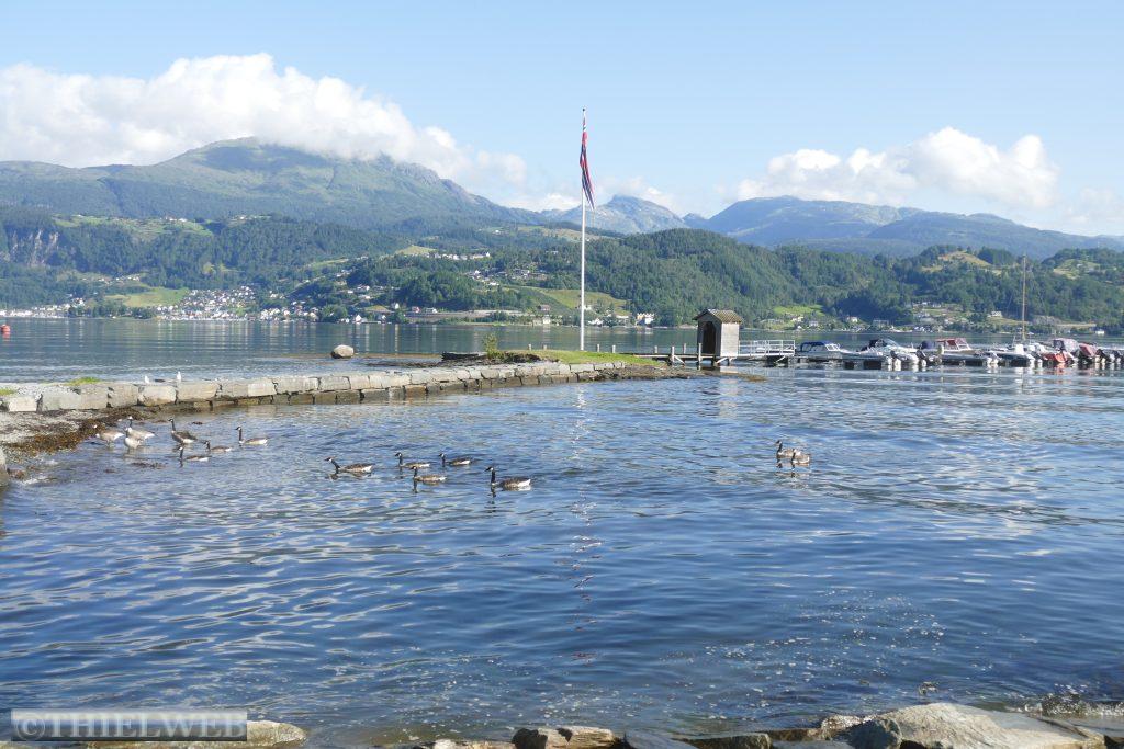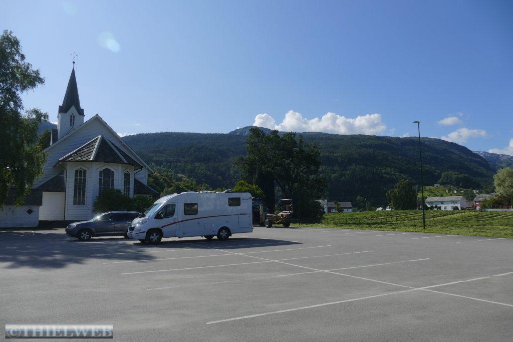 Wieder am Wohnmobil fahren wir weiter in nördliche Richtung bis Strandebarm am Hardangerfjord, wo wir neben der Kirche einen schönen Stellplatz mit Blick auf den Fjord haben.