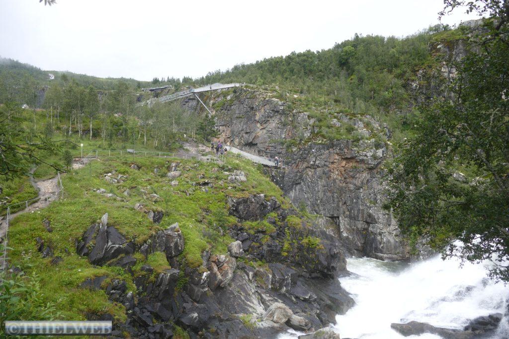 In Eidfjord liegt gerade die Aida, die wir schon am gestrigen Abend im Hardangerfjord gesehen haben. Entsprechend viele Touristen sind hier anzutreffen. Wir fahren weiter auf der Landschaftsroute Hardangervidda, die hier beginnt und bis Haugastøl auf der Straße 7 verläuft. Der Regen nimmt zu. Am Parkplatz des Norwegischen Naturzentrums Hardanger verweilen wir zu Mittag. Die anschließende Strecke durch das Tal Måbødalen vom reißenden Fluss begleitet ist wunderschön und bildet den Übergang zwischen Eidfjord und der Hardangervidda. Dies ist Nordeuropas größtes Hochgebirgsplateau mit ca. 10.000 m². Es soll hier der größte Stamm wilder Rentiere leben. Mal sehen, ob wir eines sehen. Da es immer noch regnet, beschließen wir kurz vor dem berühmtesten Wasserfall Norwegens, dem Vøringsfossen mit einer Fallhöhe von 182 m, das Wetter auszusitzen. Das Warten lohnt sich, gegen 16 Uhr hört es auf zu regnen und wir laufen zu den spektakulären Aussichtsplattformen nahe dem Fossli Hotel und der neuen Treppenbrücke über den Wasserfall-Canyon. Gewaltige Wassermassen stürzen das Måbødalen-Tal hinunter.