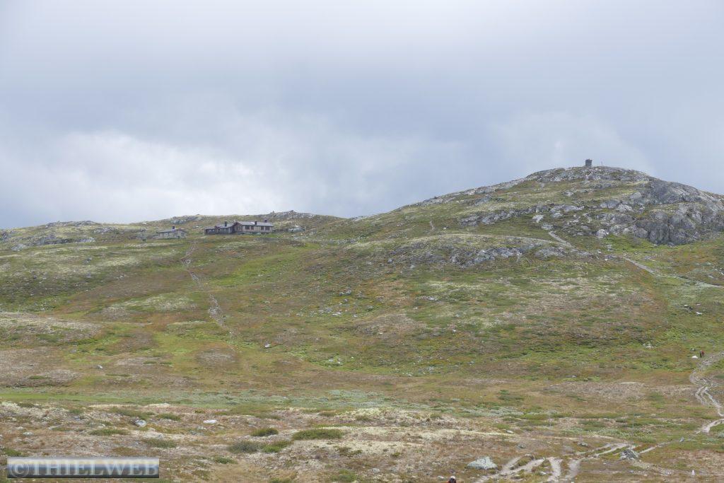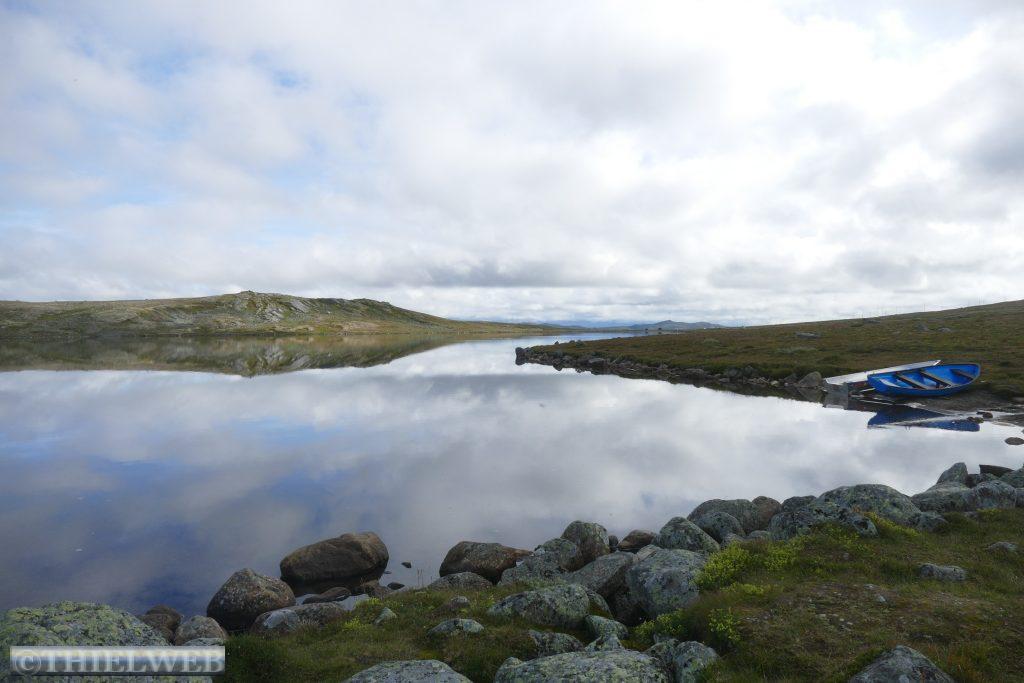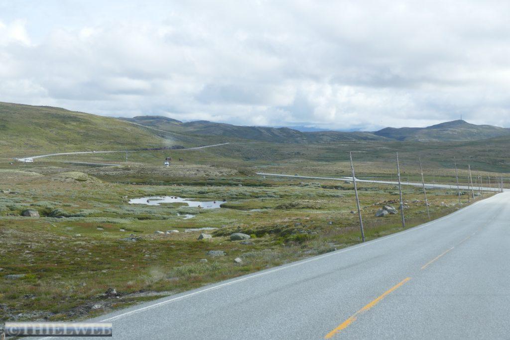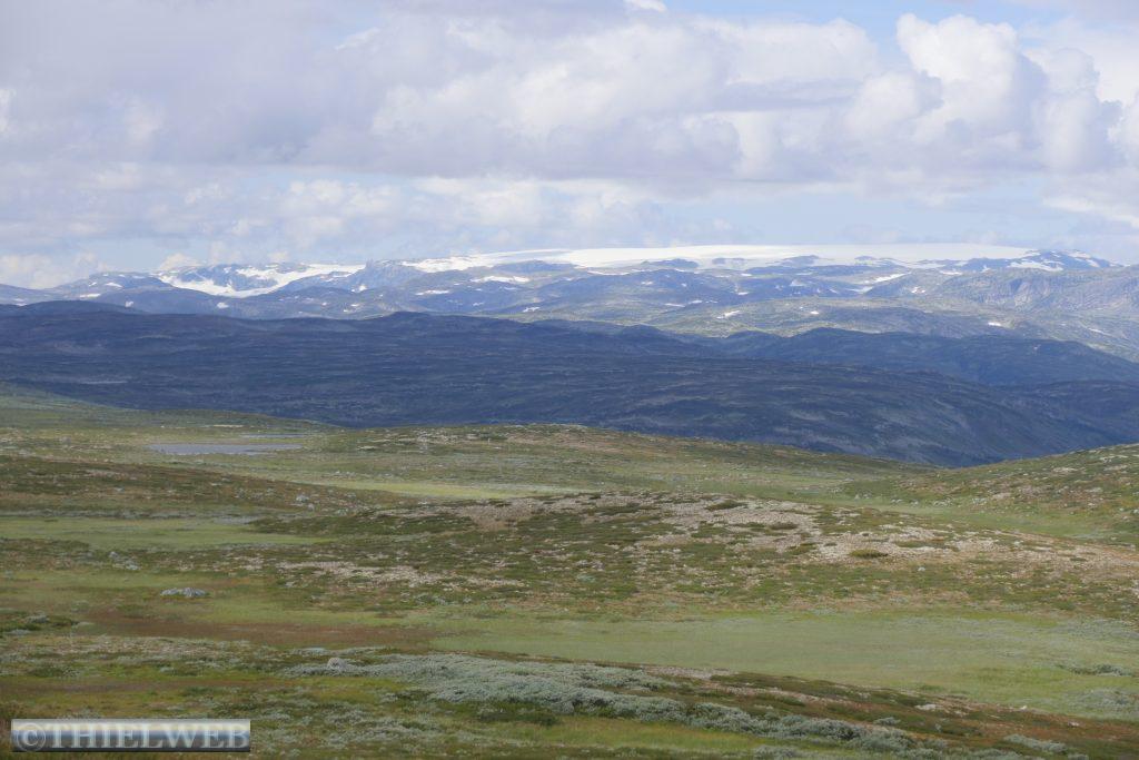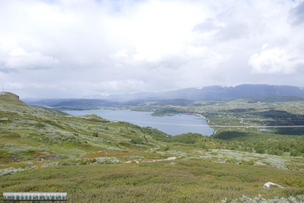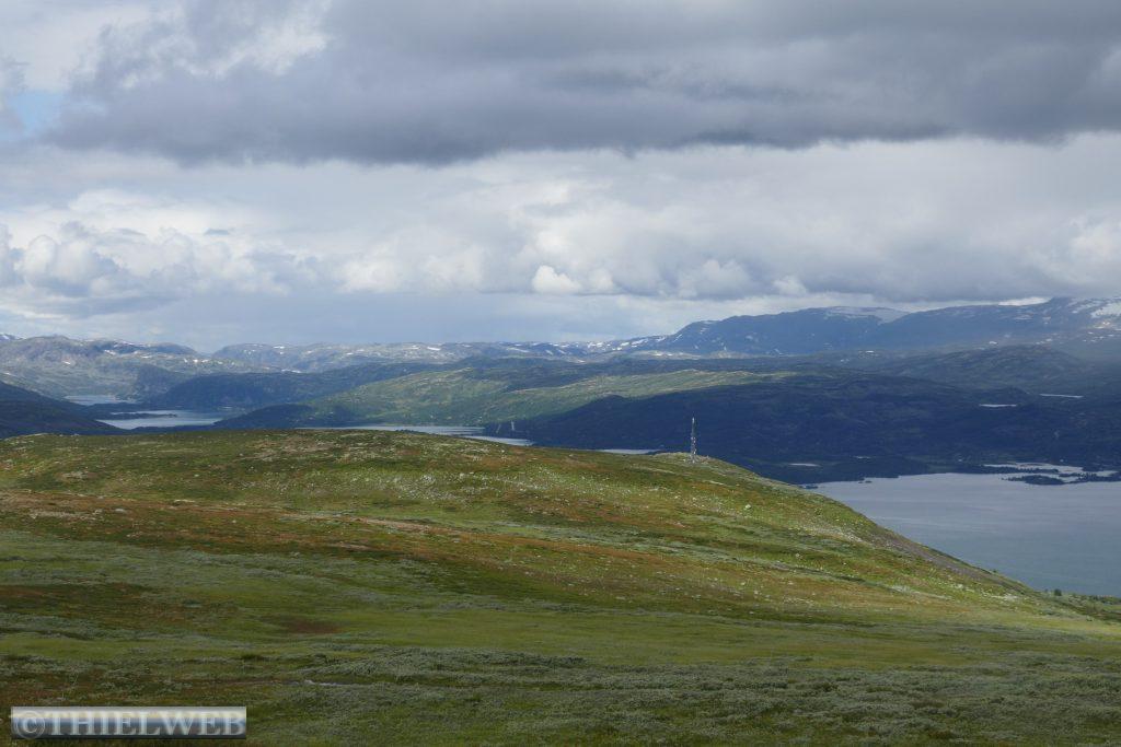 Da in unserer für heute geplante Wanderung bereits in der Beschreibung von sumpfigem Gelände die Rede war, haben wir nach dem gestrigen Regen Bedenken und fahren stattdessen weiter. Zunächst über die Hochebene Hardangervidda. Scheinbar unendliche Weiten, kein Strauch, kein Baum. Dafür Gletscher und Bergseen, wohin man schaut. Wir machen Halt in Ustetind wo wir eine Wanderung von ca. 900 m auf den 1376 m hohen Ustetind machen. Von oben haben wir eine fantastische Aussicht auf die Ebene im Süden und den Gaustatoppn sowie auf der Nordseite auf den 35 km langen Gebirgskamm des Hallingskarvet. Danach fahren wir weiter bis Torpo, unserem Schlafplatz für die Nacht.