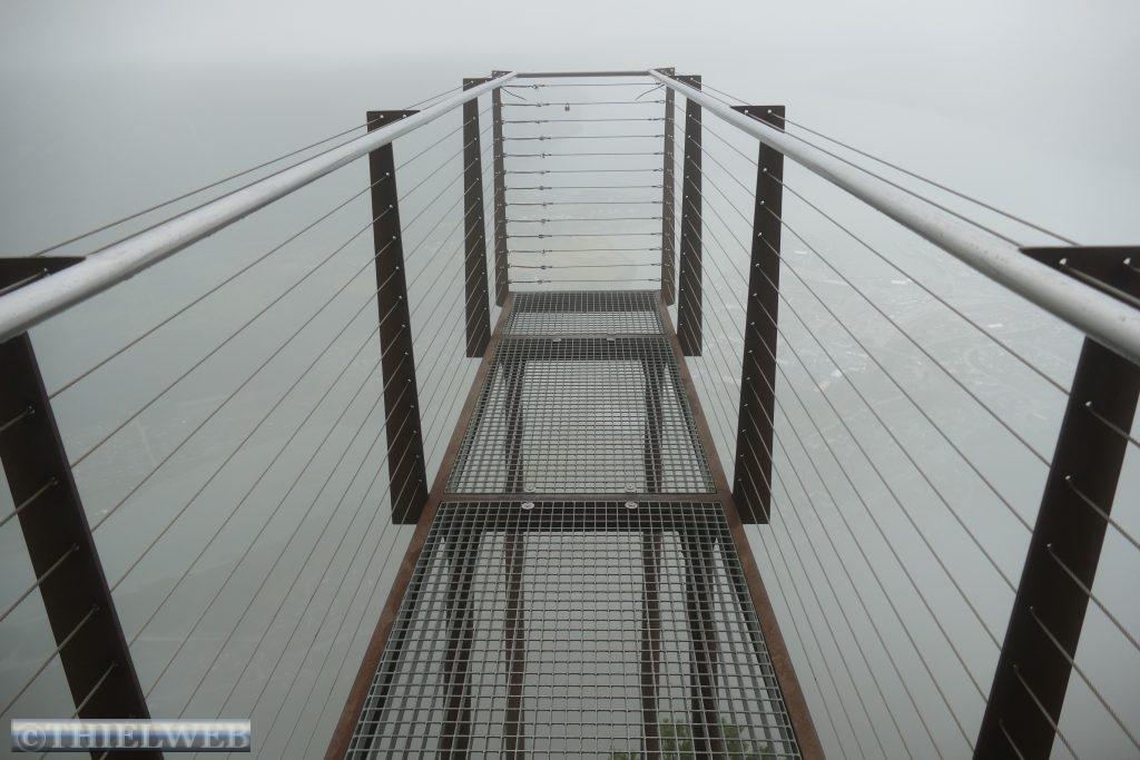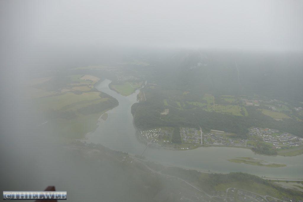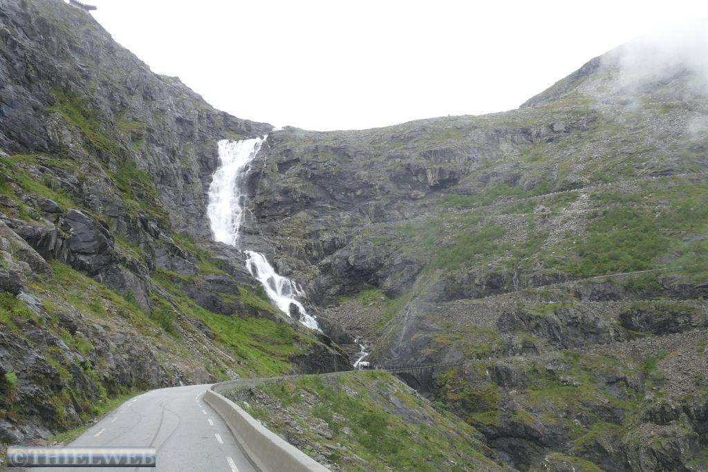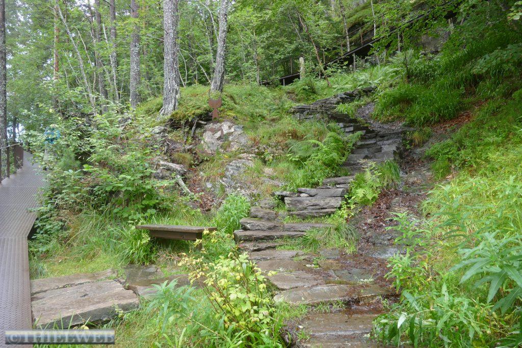 Und wieder hat es die ganze Nacht geregnet, was auch bis in den Vormittag anhält. Die Wolken hängen tief in den Bergen und überall sieht man Wasserfälle, die Berghänge hinunter rauschen. Wir setzten unsere Fahrt nach Åndalsnes fort. Der Ort liegt im nördlichen Teil von Fjord Norwegen und ist berühmt für seine hohen Gipfel und seine lange Bergsteigergeschichte. Zuerst fahren wir noch zur 1732 erbauten Grytten Kirche. Danach erledigen wir die Entsorgung und tanken Adblue. Nach dem Mittag wagen wir den spektakulären Aufstieg über die Romsdal-Treppe zum Aussichtspunkt Rampestreken. Noch verhüllen die Wolken den Gipfel. Der erste Abschnitt bis Nesaksla ist noch ohne Treppen und geht über eine Eisenrampe. Hier haben wir eine gute Aussicht auf Åndalsnes. Stetig steigt der Weg über Wurzeln und Treppen, die von Sherpas aus Nepal gebaut wurden, an. Nach ca. 1 Stunde erreichen wir auf 537 m die 20 Meter lange Stahlrame, von der die letzten acht Meter frei in der Luft zu schweben scheinen. Hier sollten wir Aussicht auf Romsdalen und die Berge in Isterdalen und bei schönem Wetter bis Trollstigen haben. Leider sehen wir nur eine milchige Wand vor uns und nur schemenhaft Åndalsnes unter uns. Der Rückweg ist nicht weniger anstrengend.