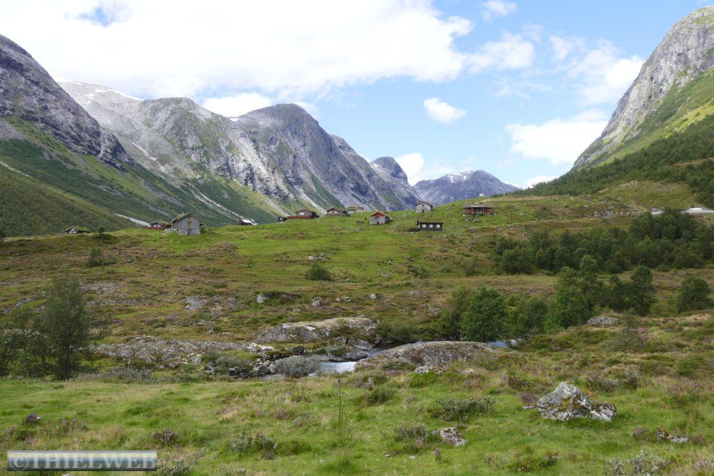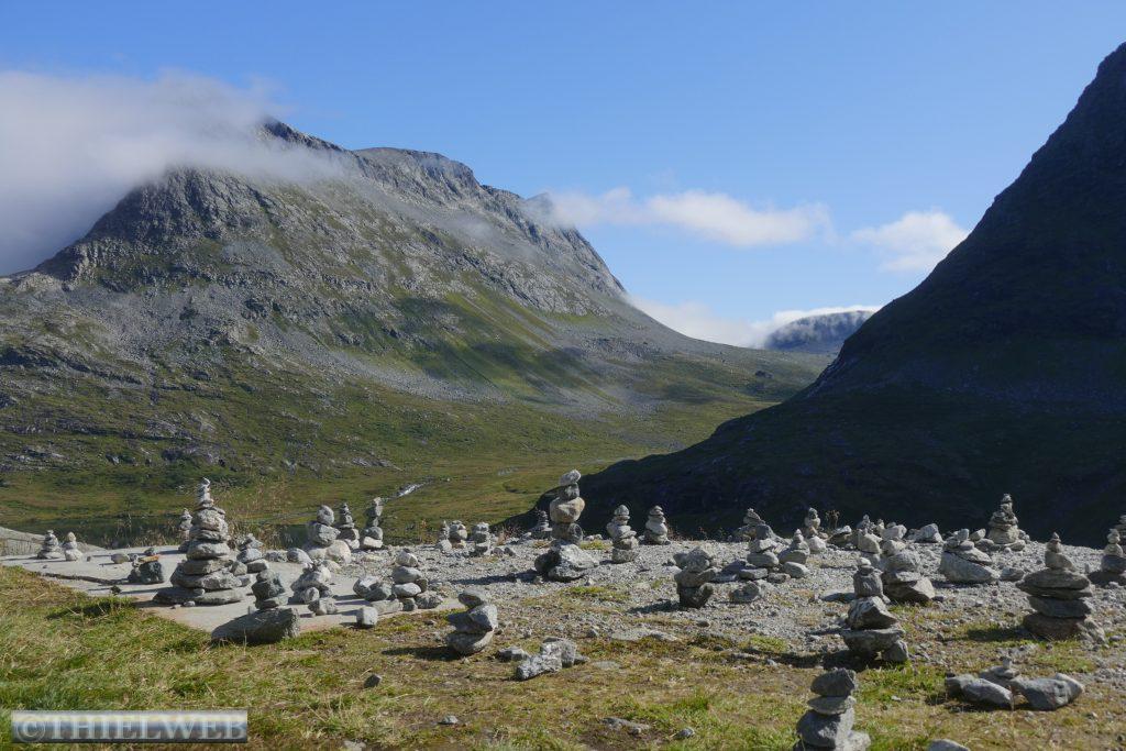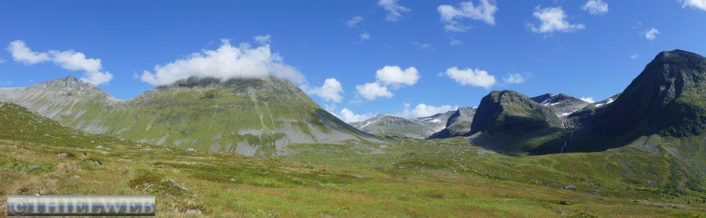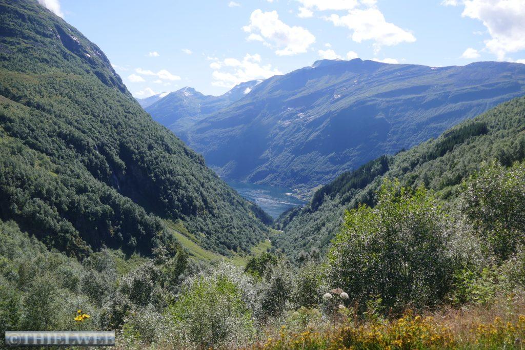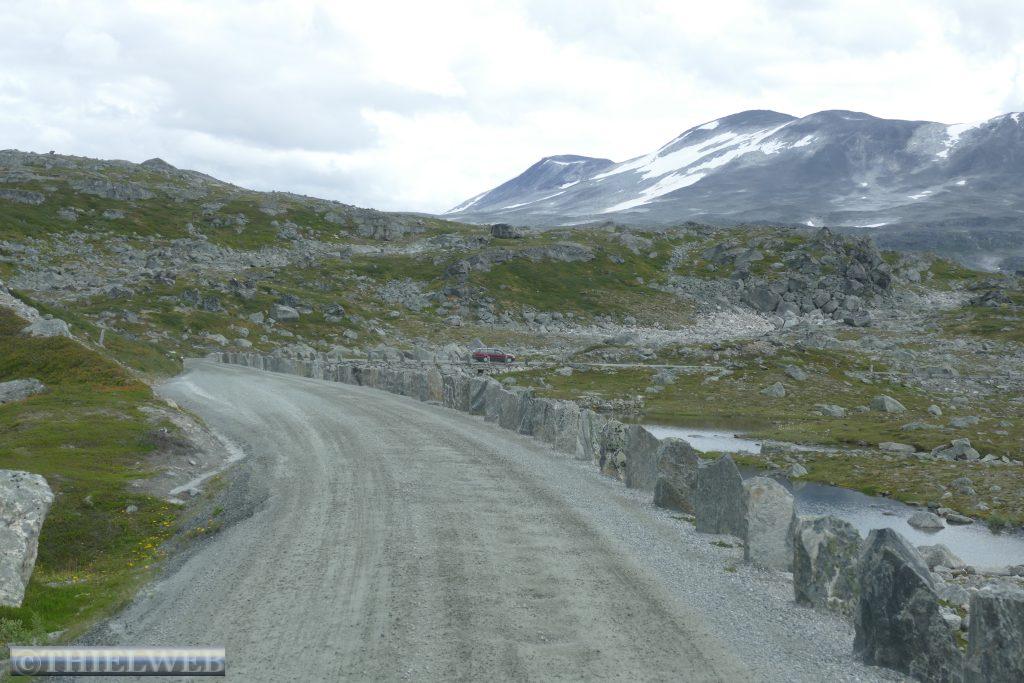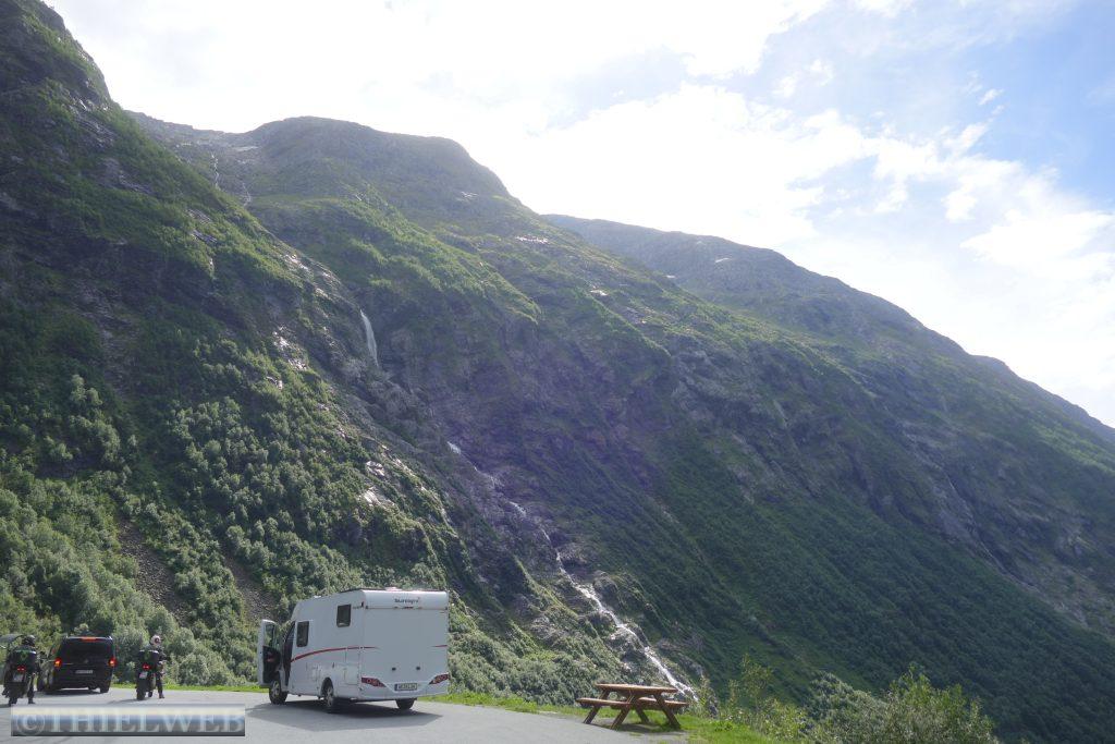 Am Morgen sind es nur noch 1,5 km, bis wir die 11. Haarnadelkurve über den Geiranger erreichen. Hier befindet sich der Aussichtspunkt Ørnesvingen bzw. Adlerschwinge mit seinem originellen Wasserfall. Wir blicken auf Geiranger, den Geirangerfjord, die Wasserfälle „Die sieben Schwestern“ und den Bergbauernhof Knivsflå. Nun geht es die Haarnadelkurven hinunter. Der Puls beschleunigt sich, aufpassen, dass die Bremsen nicht wieder qualmen. Wir schauen uns in Geiranger ein wenig um. Zum Glück liegt heute kein Kreuzfahrtschiff im Hafen. Wir gehen zur Stabkirche von Geiranger, einem historischen und kulturellen Highlight und sehen den Fossevandring Wasserfall. Entlang des angelegten Steges steigen wir wieder hinab zum Hafen. Dann setzten wir unsere Fahrt fort. Am Ende des Geirangerfjords, an einem steilen Berghang befindet sich der Rastplatz Flydalsjuvet, der letzte Aussichtspunkt auf dieser Landschaftsroute. Von hier sehen wir die Berge Laushornet (1502 m) und Eidshornet (1629 m). Die Straße klettert weiter in die Höhe. Immer wieder müssen wir anhalten, um die Landschaft zu genießen. Waren wir in Geiranger auf fast 16 m ü.M. sind wir bereits am Abzweig Dalsnippa auf über 1.000 Höhenmetern. Wir bleiben auf der Straße Fv63 bis zum Abzweig auf die Straße Nr. 15. Am Aussichtspunkt Langvatnet machen wir den letzten Fotostopp bevor es durch 3 Tunnel auf der neuen Verbindungsstraße zwischen Grotli und Hjelle weiter geht. Am Øvstefoss Wasserfall bewundern wir die Wassermassen, die herabstürzen. Hier ist auch der Abzweig auf die Landschaftsroute Gamle Strynefjellsvegen, die alte Autostraße zwischen östlicher und westlicher Richtung ist ein reines Museumserlebnis und steht unter Denkmalschutz. Die Straße war bis Ende des 19. Jahrhunderts ausschließlich von Hand erbaut worden. Alte, von Hand errichtete Mauern aus sorgfältig zurecht geschlagenen Steinen und langen Reihen aus Kantsteinen zeugen noch von der damaligen Ingenieurskunst. Am Aussichtspunkt am Videfossen halten wir an. Hier sieht man aus nächster Nähe die Wassermassen, die den Berg hinabstürzen sowie das Tal und das Skålafjell in 1848 m ü.d.M. Ringsum stürzen Wasserfälle entlang der Straße herab. Ab dem Skizentrum wird die Straße eine unbefestigte Schotterpiste mit entsprechend vielen Schlaglöchern. Doch die Landschaft auf mittlerweile wieder über 1100 Höhenmetern verändert sich ständig. Blaugrüne Bergseen werden von kargen grauen Hängen mit Gletschern und Schneeresten gesäumt. Dann kommen wir wieder etwas tiefer und die Landschaft wird grün und mit Bergblumen durchwachsen. Diese Landschaftsroute endet in Grotli nach 27 km, wo wir uns einen Übernachtungsplatz suchen.