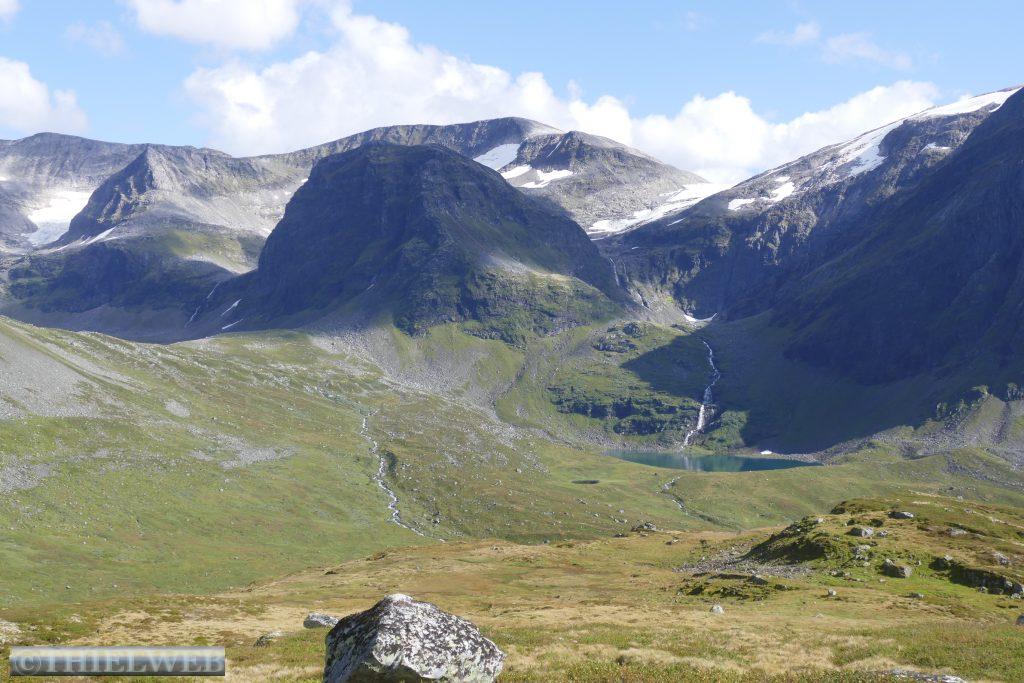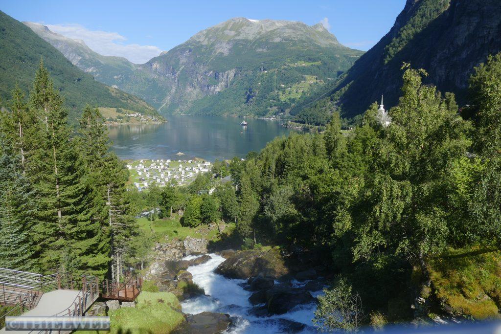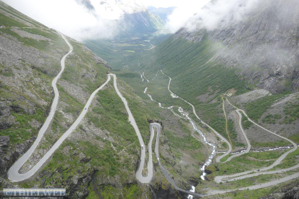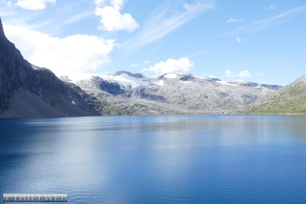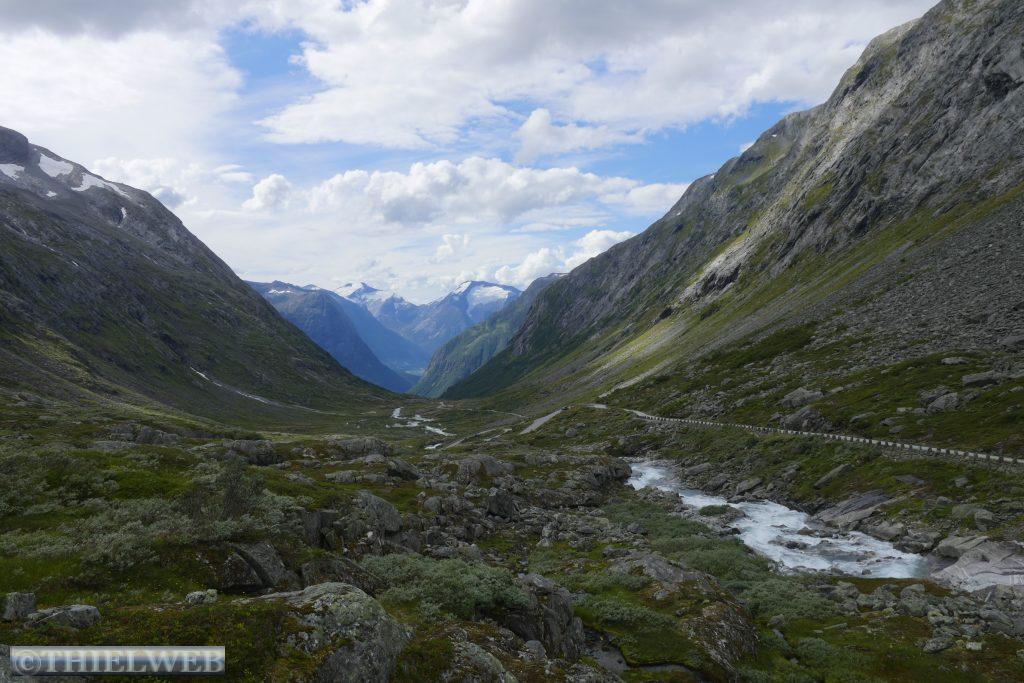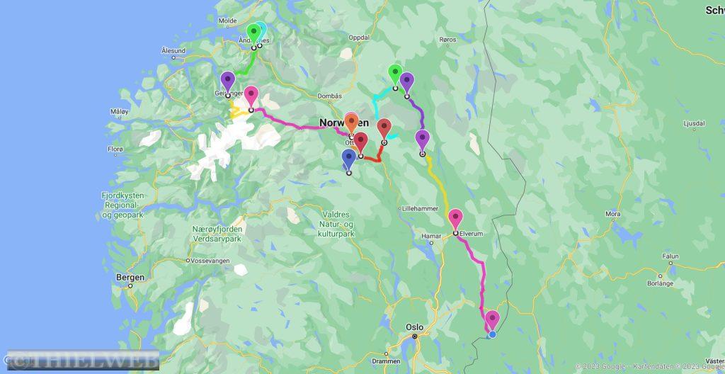 Am Morgen sind es nur noch 1,5 km, bis wir die 11. Haarnadelkurve über den Geiranger erreichen. Hier befindet sich der Aussichtspunkt Ørnesvingen bzw. Adlerschwinge mit seinem originellen Wasserfall. Wir blicken auf Geiranger, den Geirangerfjord, die Wasserfälle „Die sieben Schwestern“ und den Bergbauernhof Knivsflå. Nun geht es die Haarnadelkurven hinunter. Der Puls beschleunigt sich, aufpassen, dass die Bremsen nicht wieder qualmen. Wir schauen uns in Geiranger ein wenig um. Zum Glück liegt heute kein Kreuzfahrtschiff im Hafen. Wir gehen zur Stabkirche von Geiranger, einem historischen und kulturellen Highlight und sehen den Fossevandring Wasserfall. Entlang des angelegten Steges steigen wir wieder hinab zum Hafen. Dann setzten wir unsere Fahrt fort. Am Ende des Geirangerfjords, an einem steilen Berghang befindet sich der Rastplatz Flydalsjuvet, der letzte Aussichtspunkt auf dieser Landschaftsroute. Von hier sehen wir die Berge Laushornet (1502 m) und Eidshornet (1629 m). Die Straße klettert weiter in die Höhe. Immer wieder müssen wir anhalten, um die Landschaft zu genießen. Waren wir in Geiranger auf fast 16 m ü.M. sind wir bereits am Abzweig Dalsnippa auf über 1.000 Höhenmetern. Wir bleiben auf der Straße Fv63 bis zum Abzweig auf die Straße Nr. 15. Am Aussichtspunkt Langvatnet machen wir den letzten Fotostopp bevor es durch 3 Tunnel auf der neuen Verbindungsstraße zwischen Grotli und Hjelle weiter geht. Am Øvstefoss Wasserfall bewundern wir die Wassermassen, die herabstürzen. Hier ist auch der Abzweig auf die Landschaftsroute Gamle Strynefjellsvegen, die alte Autostraße zwischen östlicher und westlicher Richtung ist ein reines Museumserlebnis und steht unter Denkmalschutz. Die Straße war bis Ende des 19. Jahrhunderts ausschließlich von Hand erbaut worden. Alte, von Hand errichtete Mauern aus sorgfältig zurecht geschlagenen Steinen und langen Reihen aus Kantsteinen zeugen noch von der damaligen Ingenieurskunst. Am Aussichtspunkt am Videfossen halten wir an. Hier sieht man aus nächster Nähe die Wassermassen, die den Berg hinabstürzen sowie das Tal und das Skålafjell in 1848 m ü.d.M. Ringsum stürzen Wasserfälle entlang der Straße herab. Ab dem Skizentrum wird die Straße eine unbefestigte Schotterpiste mit entsprechend vielen Schlaglöchern. Doch die Landschaft auf mittlerweile wieder über 1100 Höhenmetern verändert sich ständig. Blaugrüne Bergseen werden von kargen grauen Hängen mit Gletschern und Schneeresten gesäumt. Dann kommen wir wieder etwas tiefer und die Landschaft wird grün und mit Bergblumen durchwachsen. Diese Landschaftsroute endet in Grotli nach 27 km, wo wir uns einen Übernachtungsplatz suchen.