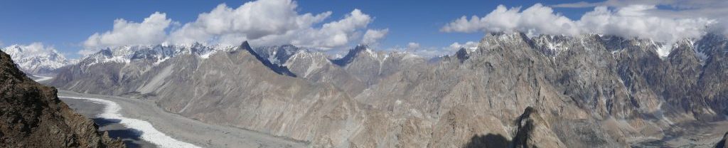 Da es auf der Alm Patundas in diesem Jahr kein Wasser mehr gibt, ist ein Camp dort nicht möglich. So steigen wir am nächsten Morgen ohne Gepäck hinauf zur Alm. Je mehr wir an Höhe gewinnen, desto grandioser wird die Aussicht. Welch ein Anblick, als wir die Alm erreichen. Der Shispare zeigt sich und der Gulmit mit Wolkenschleier. Auf der anderen Talseite schlängelt sich fast endlos der Batura Gletscher vom Passu Gar bis zum Passu Lake. Dazwischen die Passu Corns. Noch ein Foto und noch eines. Ausgiebig genießen wir den Ausblick auf 5 Siebentausender. Mit unseren Trägern haben wir diesmal eine recht lustige Truppe. Und so wird Musik vom Handy gespielt und dazu getanzt. Es ist verrückt, das zu erleben.