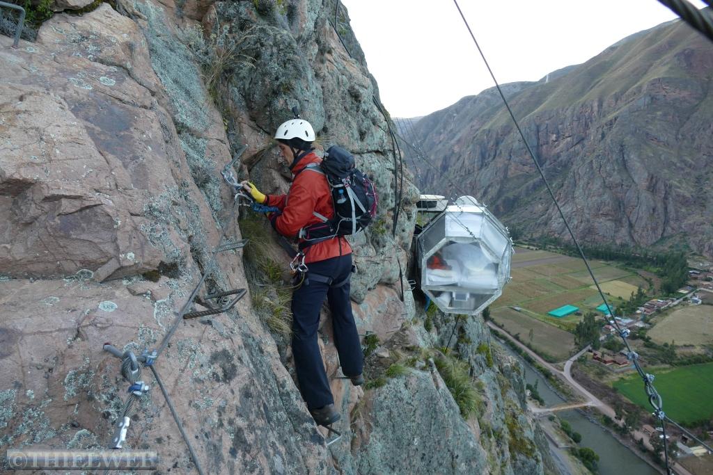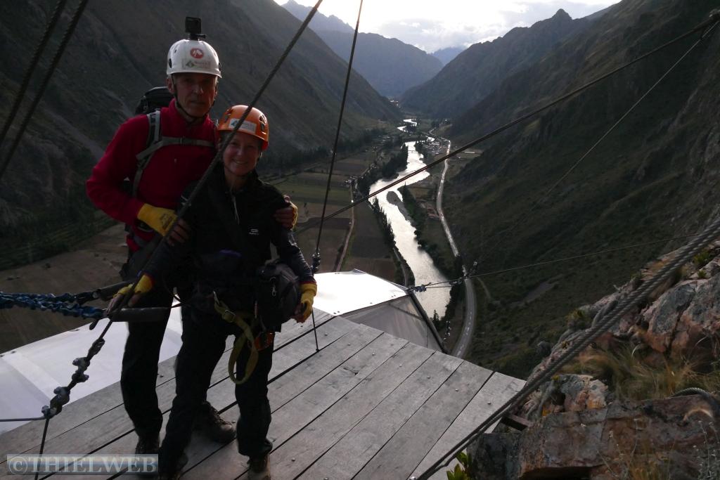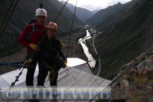 Am frühen Nachmittag werden wir abgeholt und in das Heilige Tal gefahren. Unterwegs holen die Guides unsere Verpflegung ab. Unterhalb der Skylodge bekommen wir die Kletterausrüstung und eine kurze Einweisung. Dann geht es auch schon los 400 m fast senkrecht die Feldwand hinauf. Zwischendurch sind eine Art Haken eingeschlagen, um guten Halt zu haben. Dann kommt die „Brücke“ auf der wir ins Tal blickend hinübergehen müssen. Der Wind weht mittlerweile stark und wir sind erleichtert, als wir die Skylodge erreichen. Es ist einmalig. Eine Kapsel vollständig aus Plexiglas hängt hoch über dem Tal. Hier können wir wie der Kondor, der König der Lüfte, übernachten. Zum Schlafen kommen wir doch wenig. Unter dem Sternenhimmel zählen wir unzählige Sternschnuppen.