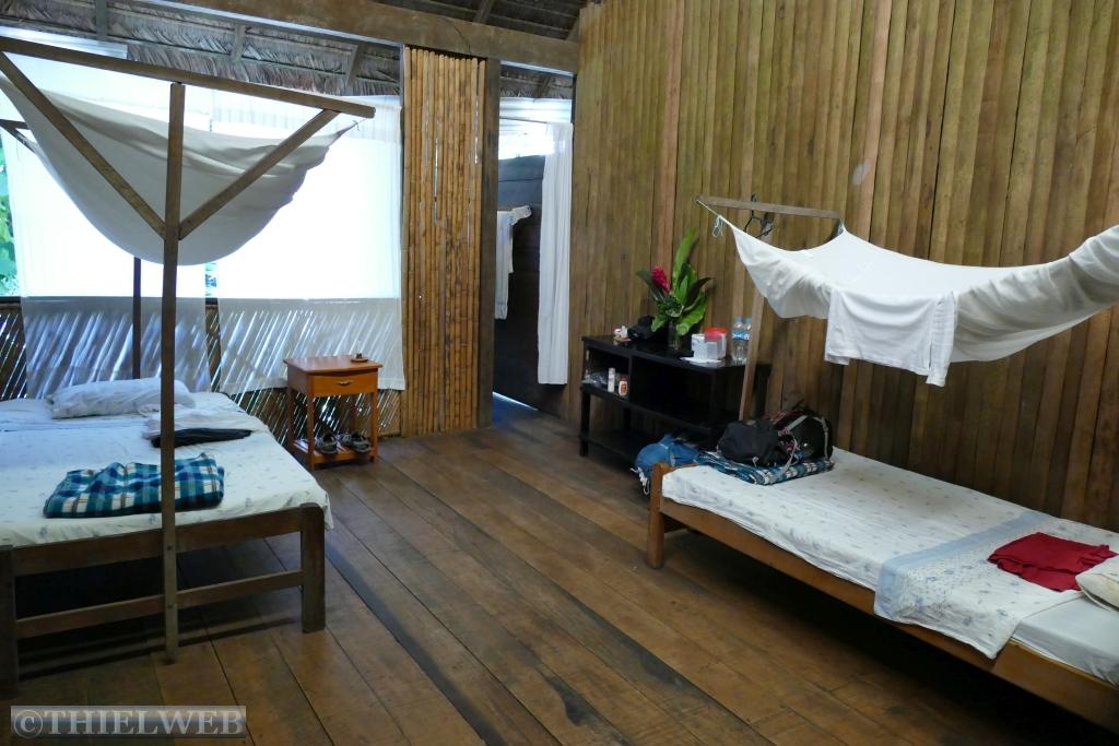 Heute gehen wir früh schlafen, am nächsten Morgen geht es nämlich früh los. Die familiengeführte Lodge liegt nur wenige Schritte vom Tambopata Fluss entfernt. Wir schätzen sehr, dass die Lodge mitten im unendlichen Dschungel liegt & in der Umgebung nur ein paar Bauern leben. Die Konstruktion wurde mit einheimischen Materialien gefertigt. Die Zimmer sind sehr einfach ausgestattet, statt Türen gibt es meist nur Vorhänge. Das macht den Aufenthalt im Dschungel jedoch noch spezieller und authentischer. Über den Betten hängt ein großes Moskitonetz. Die Zimmer werden mit Kerzen erleuchtet, Strom gibt es nur stundenweise am Abend.