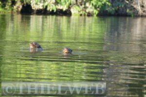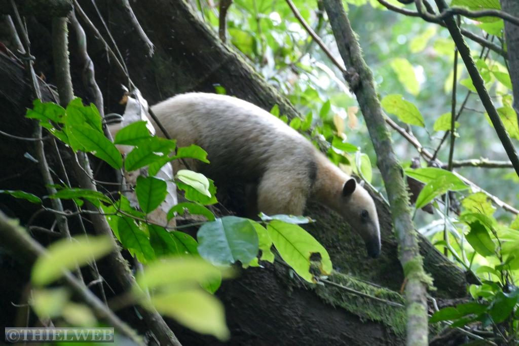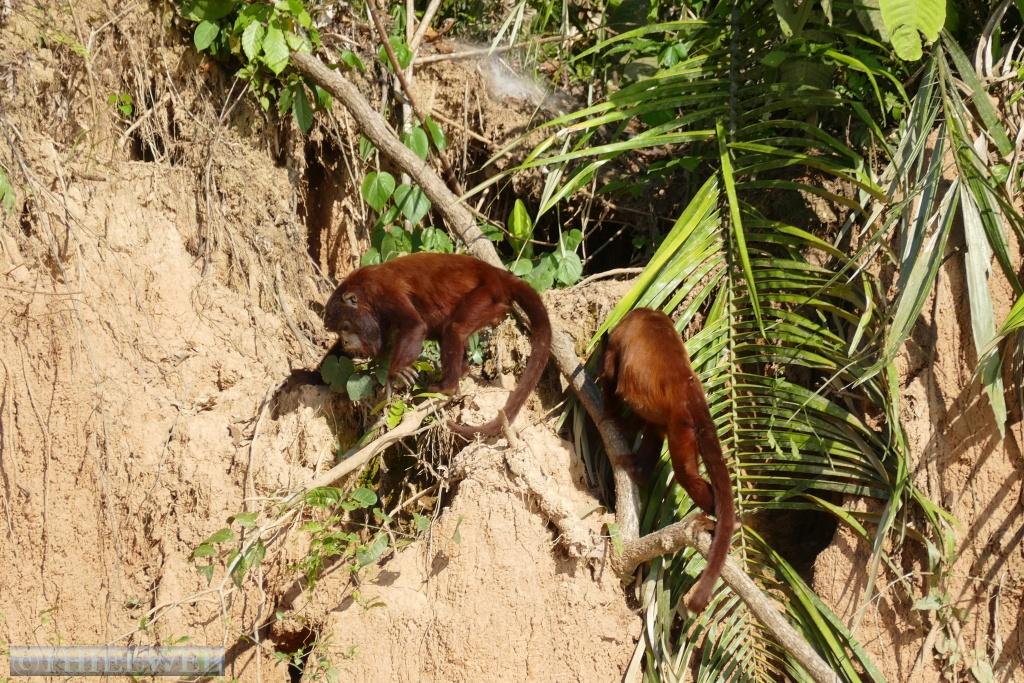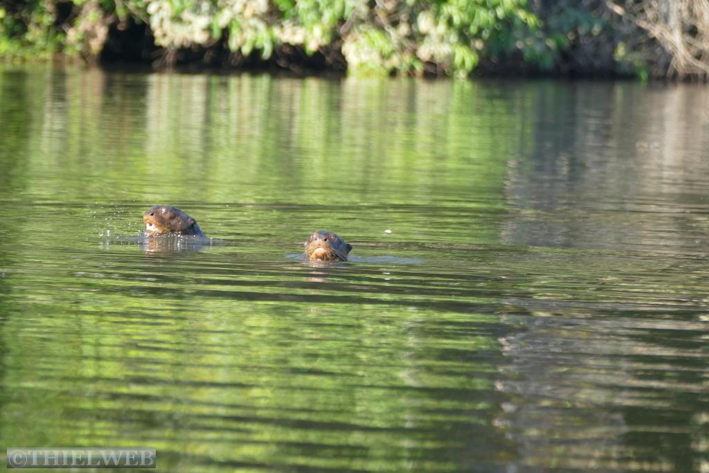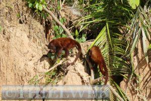 Unser heutiger Ausflug findet in Kooperation mit den Bewohnern der La Torre Gemeinschaft statt. Nach dem Frühstück fahren wir ca. fünfzehn Minuten flussaufwärts wo wir uns mit unserem Guide der ONG AMTUSET treffen. Er kennt das Gebiet und seine Pfade, die zu den Seen und Salzlecken führen. Wir überqueren einen Nebenfluss, um zu den Dschungellagunen Cocha Montes, Cocha Pato und Cocha Lagarto zu gelangen. Die Wanderung dauert etwa vier Stunden und wird von Schritt zu Schritt interessanter während wir der Beschreibung der Pflanzen und deren verschiedenen medizinischen und praktischen Anwendungen lauschen begegnet uns ein Nasenbär. An der Lagarto Cocha steigen wir in ein Boot und fahren auf den See. Eine Riesenotter Familie ist gerade beim Fischen. Es ist schwierig, die flinken Tiere vor die Kamera zu bekommen.
