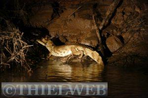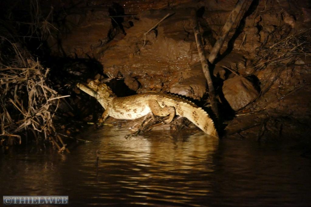 Da die Wanderung bei der Hitze anstrengend ist, können wir uns nach dem Mittagessen ein paar Stunden Erholung in den Hängematten gönnen. Nach dem Abendessen startet ein weiteres Abenteuer. Entlang des Tambopata Flusses gehen wir auf Kaiman suche. Kaimane sind eine Unterart der Krokodile und gewöhnlich etwas kleiner als die „Echten Krokodile“. Nachts wenn die Tiere schlafen, leuchten ihre Augen rot, knapp über der Wasseroberfläche.