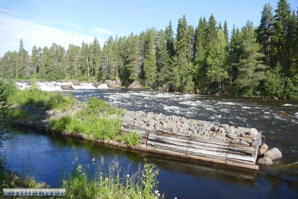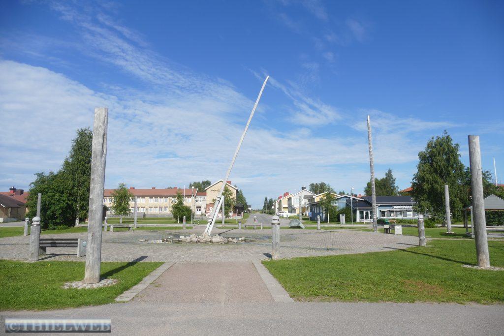 Nach 20 km kommen wir nach Pajala, unserem letzten Ort in Schweden. Wir tanken nochmal zum günstigsten schwedischen Preis von 1,565 €/l und sehen uns die größte Sonnenuhr der Welt an. Sie hat einen Durchmesser von 38,33 Metern und befindet sich 70 km nördlich des Polarkreises. Der Pfahl in der Mitte liegt parallel zur Erdachse und zeigt in Richtung Nordstern.