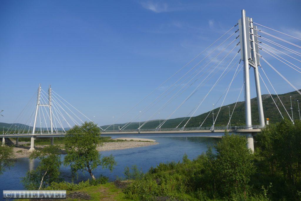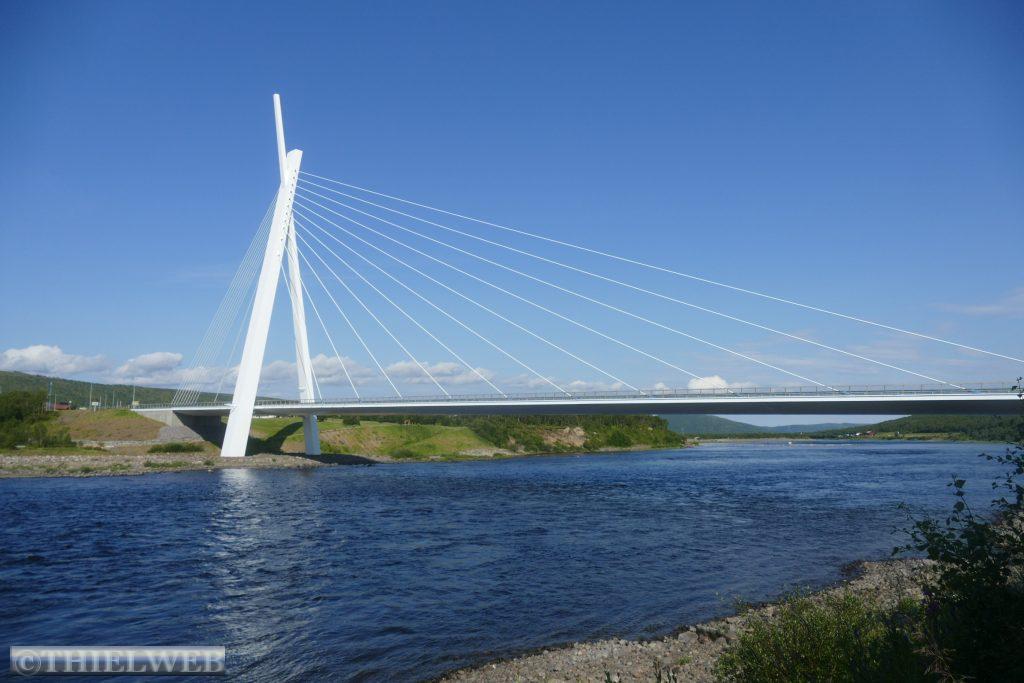 Denselben Weg nehmen wir dann zurück und fahren noch bis zur finnisch norwegischen Grenzort Utsjoki. Wir parken direkt am Fluss mit Blick auf die Sápmi Brücke.