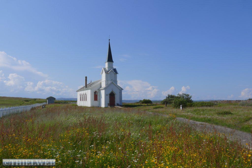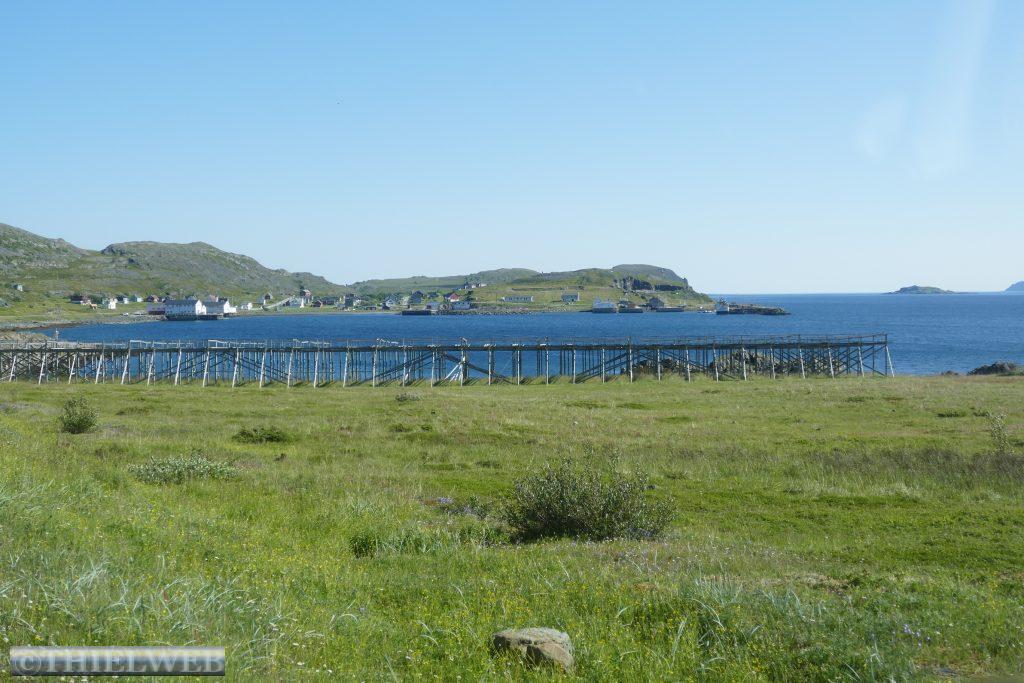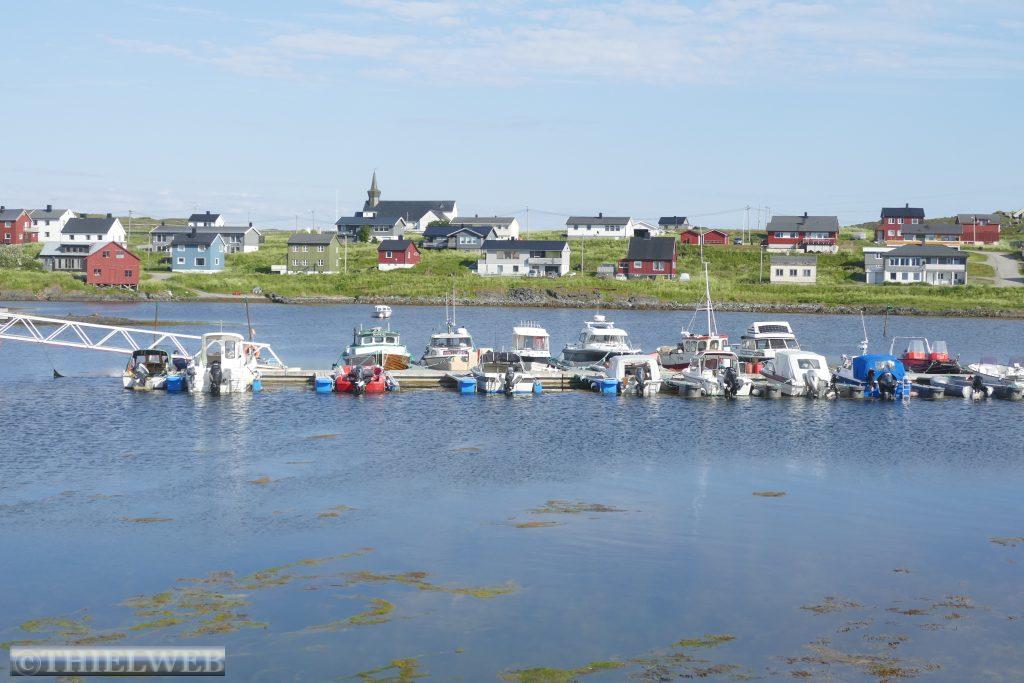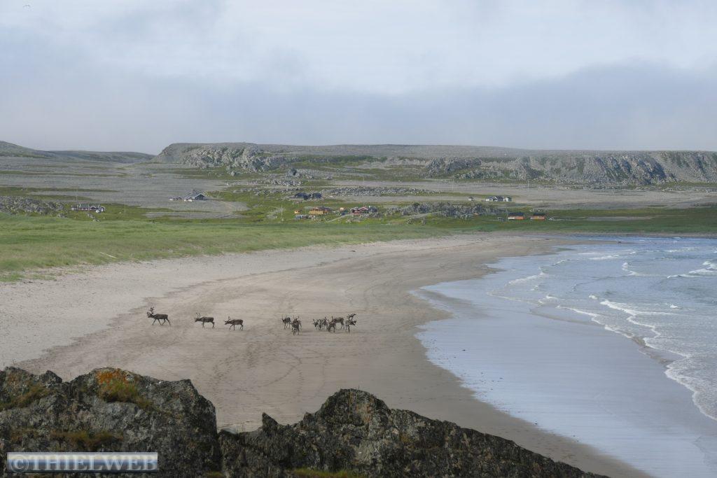 Am Morgen fahren wir über die Grenze nach Norwegen und weiter bis Tana Bru dem größten Ort im Osten der Provinz Finnmark. Er erhielt seinen Namen von der Brücke über den Fluss Tanaelva. Sie ist die einzige über den Tanaelv auf seinen ca. 100 km. Mittlerweile sind es angenehme 24° C, wir gehen einkaufen und tanken bevor wir auf der Landschaftsroute Varanger weiterfahren. Am Aussichtspunkt auf die Stromschnellen des Tana Flusses machen wir ein Foto. Der erste Stopp auf der Landschaftsroute ist am Rastplatz Gornitak bevor wir in Nesseby einen kurzen Spaziergang zur Kirche am Fjord machen. Sie hat beim Rückzug der deutschen Armee die Taktik der verbrannten Erde als einziges Gebäude überstanden. Die Barendssee ist spiegelglatt und hat gerade Ebbe. Dann schlängelt sich die Landschaftsroute immer entlang der Küste bis zum Rastplatz mit der Attraktion Mortensnes mit Museum. Wir gehen ein Stück auf dem Kulturpfad bis zum Steinblock „Transteinen“ und dem alten Torfhaus. Ein längeres Stück Fahrt und wir erreichen den nächsten Rastplatz, den Berg Domen, an dem sich nach alten Volksglauben die Hexen mit Satan trafen. Die einzigartige Aussicht auf den Fjord wird uns durch den berüchtigten, plötzlich aufziehenden Nebel versperrt. Die Temperatur ist mittlerweile auf 11° C gefallen und die Landschaft hat sich total verändert, karg und weitläufig. An der Insel Vardø entscheiden wir uns, die Landschaftsroute bis zum Ende zu fahren und auf dem Rückweg die Insel Vardø zu besuchen. Immer spektakulärer wird die Landschaft. 30 km auf einer 3 m breiten Straße fordern neben den Rentieren die volle Aufmerksamkeit. Auch müssen wir immer wieder einen Fotostopp machen, so grandios ist es. Haben wir noch vor kurzem weiße Punkte am Horizont gesehen, so wissen wir nun, dass es doch einige Schneereste sind. Endpunkt der Varanger Landschaftsroute ist der Vogelbeobachtungsposten Hamningberg. Die Varanger gehört zu den besten Vogelbeobachtungsgebieten weltweit. Wir beschließen, hier zu übernachten und sehen uns noch den kleinen Ort an, der sich irgendwie wie das Ende der Welt bzw. Europas anfühlt.