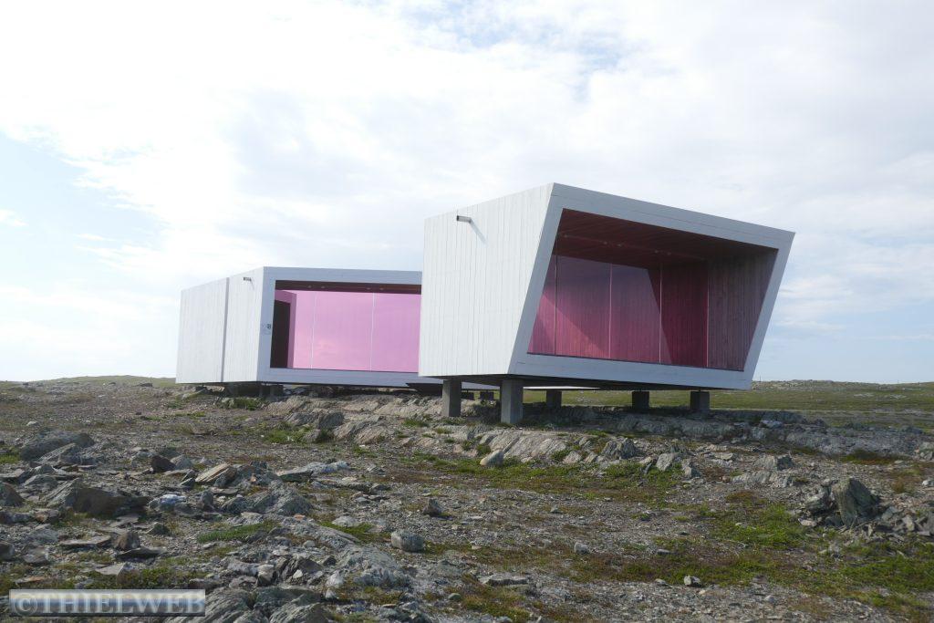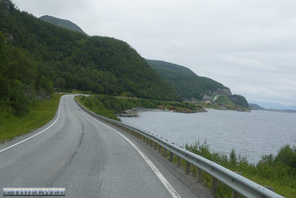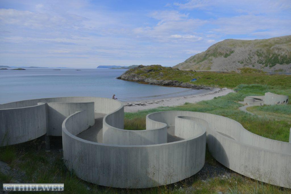 Nach ca. 20 km auf der E69 biegen wir bei Smørfjordauf auf die 889 ab. Unser Ziel ist heute die Landschaftsroute Havøysund. Der erste Rastplatz Storberget liegt idyllisch oberhalb des Flusses Russelva. Hier erreichen wir den Fjord und den Arktischen Ozean. Nach einer kurzen Pause fahren wir bis zum Ende des Fjordarms und gleichzeitig der Hälfte der Landschaftsroute zum Rastplatz Lilleford. An der Fußgängerbrücke über den Fosseelva beginnt ein Wanderweg, der am Fluss entlang führt. Wir nutzen die kurze Wanderung bis zum Wasserfall. Anschließend fahren wir weiter bis zur Stelle, wo der Snefjordelva in den Snefjord mündet. Die Straße wird landseitig flankiert von bizarren Felsformationen, gegenüber blicken wir auf das Eismeer. Dann erreichen wir den höchsten Punkt mit 220 m. Am Ufer von Selvika befindet sich die geschützte Sandbukra mit einladendem Sandstrand. Ein Weg schlängelt sich zum Grillplatz am Strand hinunter. Wir lassen den letzten Rastplatz mit der Kunstinstallation erst einmal links liegen und fahren zu unserem Stellplatz in Havøysund. Von hier aus wandern wir hinauf zum Windpark und weiter bis zum Arctic View, der sich über einer 200 m hohen Klippe mit Blick gegen den Nordpol befindet. Der Himmel hat sich binnen kurzer Zeit verdunkelt und wir hören ein Brummeln. Schnell machen wir uns auf den 5 km langen Rückweg. Der Himmel wird immer bedrohlicher und taucht die Landschaft in ein unwirkliches Licht. Erste Blitze zucken am Himmel. Da kommt ein Auto, dass auf unser Winken anhält und uns bis zum Parkplatz mit zurücknimmt. Kaum sind wir im Wohnmobil beginnt es kräftig zu regnen. Die Temperatur fällt auf 14° C, welch ein Glück wir hatten.