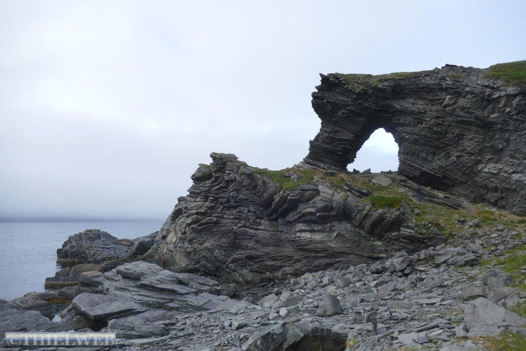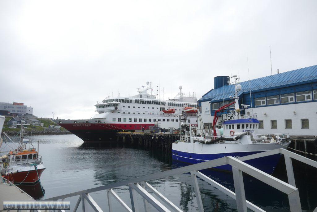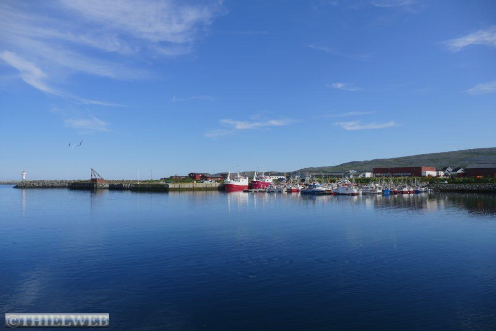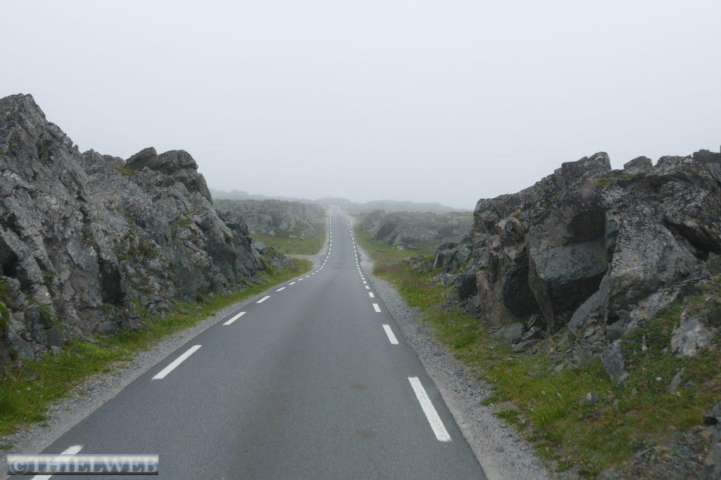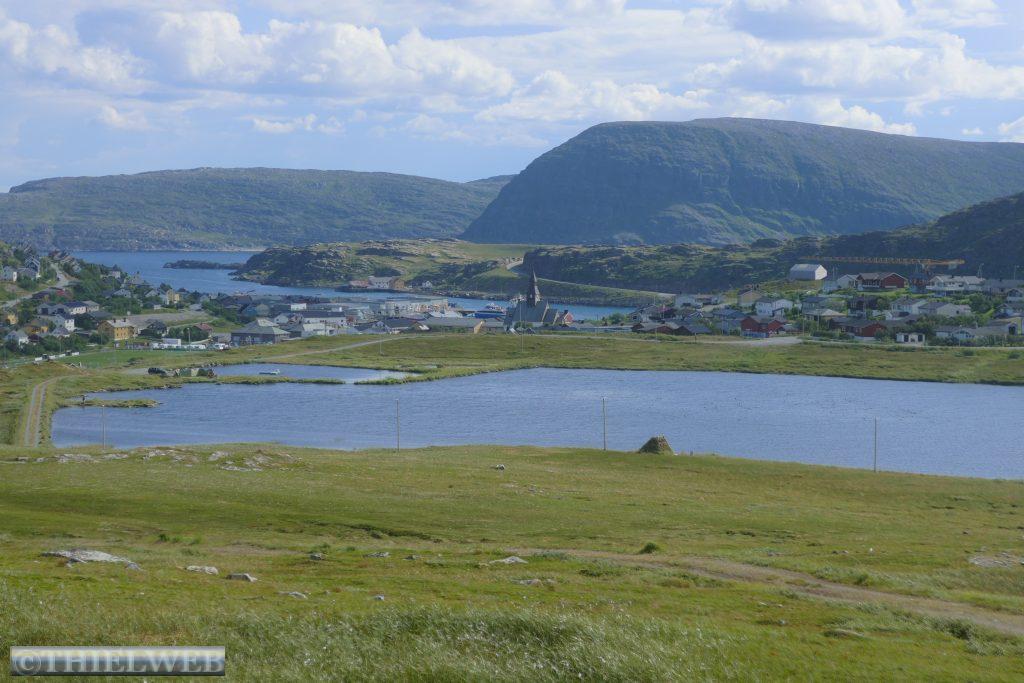 Dann folgen wir auf der E69 zur Nordkap-Insel Magerøya, der Heimat des Nordkaps. Nach ca. 115 km erreichen wir den Nordkaptunnel, mit einer Steigung von 9 % liegt er an der tiefsten Stelle 212 m unter dem Meeresspiegel und ist mit einer Länge von 6.875 m der drittlängste Unterwassertunnel Europas. In Honningsvag sehen wir uns den zentralen Anlaufhafen der Hurtigruten an. Schließlich fahren wir noch ein Stück nordwärts und parken in Skarsvåg, wo hinter der kleinen weißen Kirche der 2,5 km lange Wanderweg zu den spektakulären Felsformationen Kirkeporten beginnt, dem Felsen mit dem riesigen Loch. Bei klarem Wetter kann man durch die mehrere Meter breite Öffnung das Nordkap-Horn sehen, aber leider nicht heute bei dem Nebel.