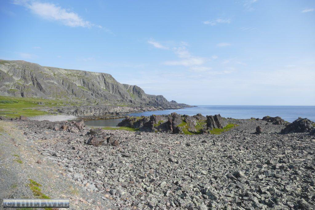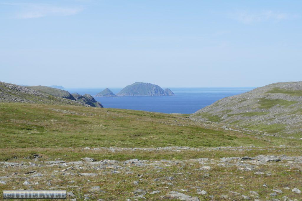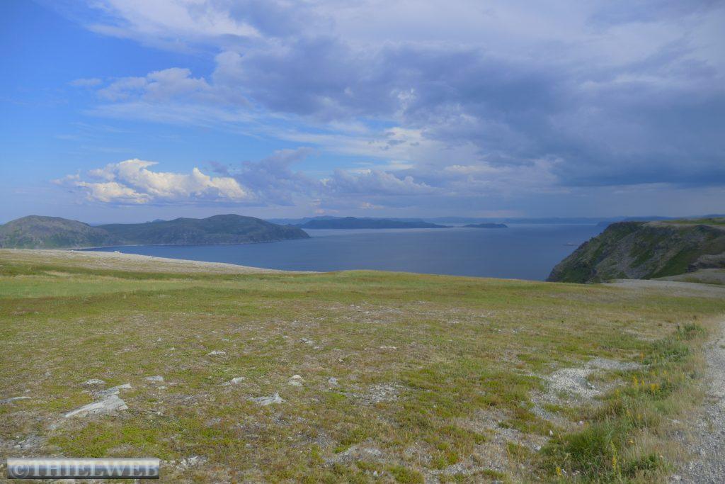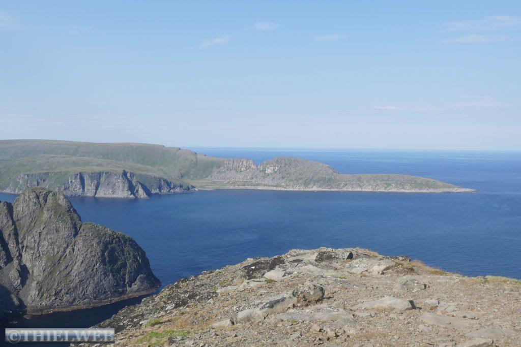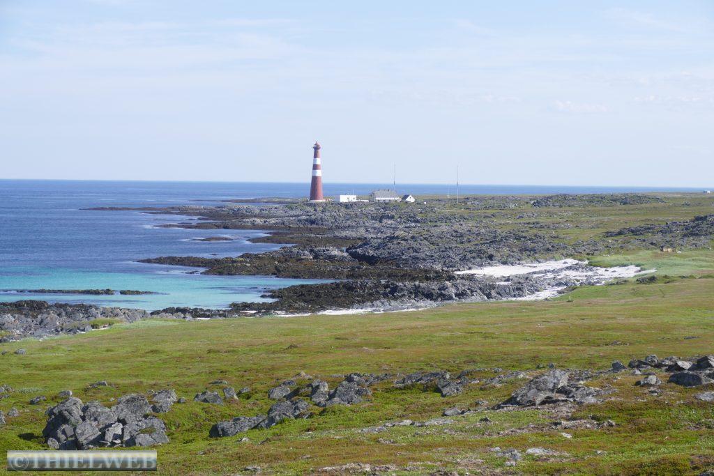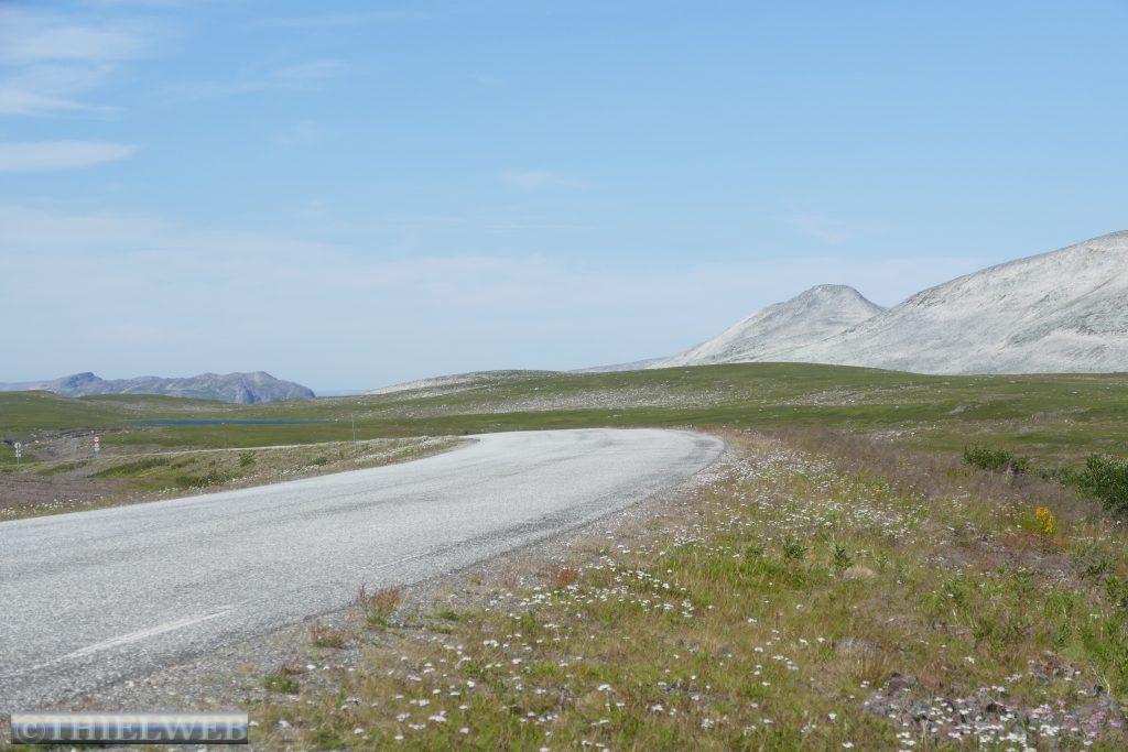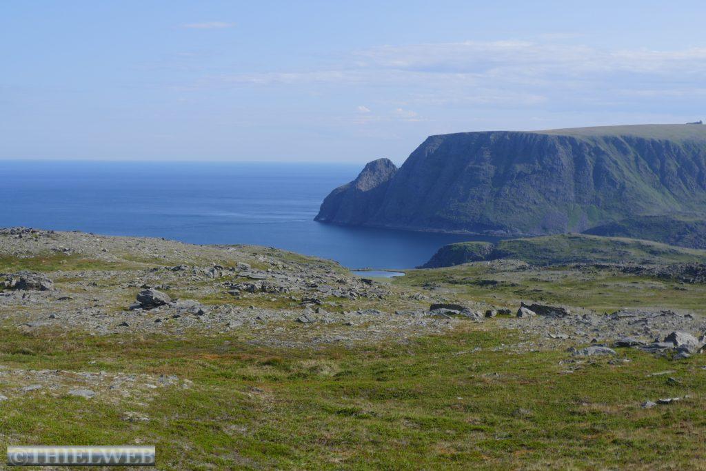 Eine tropische Nacht liegt hinter uns mit 20° C! Wir fahren auf der 890 zurück bis Tana. Erledigen die gewohnten Dinge und machen uns auf die Fahrt auf die nächste Halbinsel in Richtung Norden. Bis Kalak verläuft die Straße entlang der Küstenlinie, bevor wir auf die Slettfjellet Hochebene kommen. Die Straße schraubt sich auf 300 Höhenmeter. Kein Baum, kein Strauch, unendliche Weiten voller Steine, kleine und große Seen, dazwischen ein wenig grün. Eine unwirkliche Landschaft. In Mehamn erreichen wir die Küste. Nun sind es noch ca. 20 km bis zum nördlichsten Leuchtturm des europäischen Festlandes, den Slettnes Fyr in Gamvik inmitten eines imposanten Naturreservates. Der Leuchtturm wurde 1905 erbaut, 1944 zerstört und in den Jahren 1945 bis 1948 wieder aufgebaut. Das Wetter bleibt beständig bei 29° C, mit einer guten Brise, die die Mücken fernhält. So machen wir uns auf eine kleine schöne Wanderung auf einem markierten Weg durch das Naturreservat. In der Ferne erkennen wir die Küstenlinie des „wahren Nordkap“ sowie dahinter das Nordkap Horn.