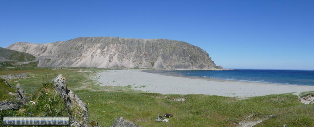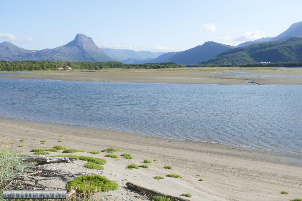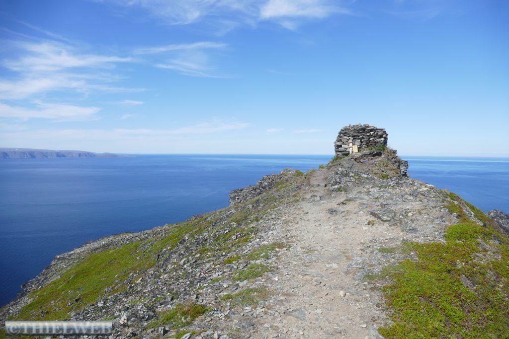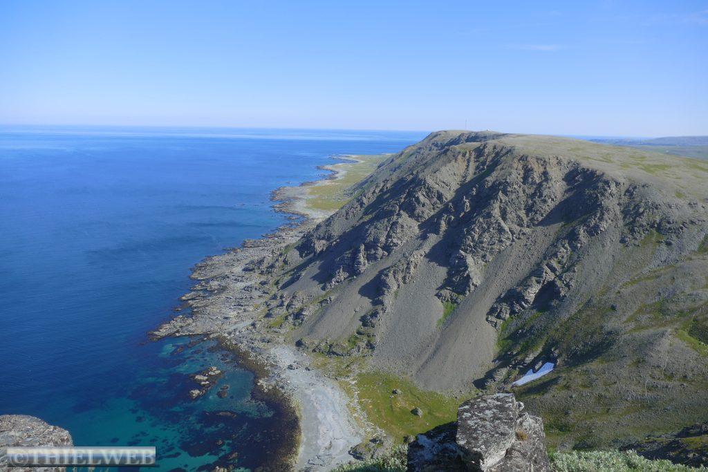 Am Morgen tanken wir noch einmal voll und besorgen frische Lebensmittel. Dann fahren wir auf der Varanger Halbinsel in Richtung Norden auf der Eismeer-Straße (890) nach Berlevåg. Bevor wir die Hochebene Juladalen überqueren, führt die Straße am Fjordufer und der Mündung des Tanaelva mit riesigen Sandbänken entlang. Ab Kongsfjord folgen wir der Küstenlinie, mächtige Berge mit bizarren Felsformationen, auf der anderen Seite blicken wir auf das Meer. Bevor wir Berlevåg erreichen, kommen wir am Leuchtturm Kjølnes Fyr vorbei, der den Seefahrern den Weg durch die berühmt-berüchtigte tückische Barentssee weist. Zuerst wollen wir jedoch die populäre Rundwanderung entlang der Küste hinauf zum Tanahorn unternehmen. Oben angekommen stehen wir vor dem alten samischen Opferplatz auf 266 m Höhe und haben einen umwerfenden Blick auf die Eismeer-Küste von Nordnorwegen und den Tanafjord. Der Wind weht kräftig, doch ist es bei 28° C recht angenehm. Wir fahren wieder ein Stück zurück zum Kongsfjord und suchen uns einen schönen Platz mit Blick zum Fjord für die Nacht. Als wir für unseren Kaffee Wasser nehmen wollen, kommt keines – oh Schreck. Zum Glück hatte sich nur die Wasserpumpe gelöst.