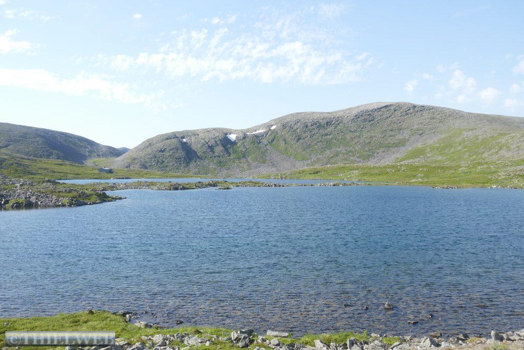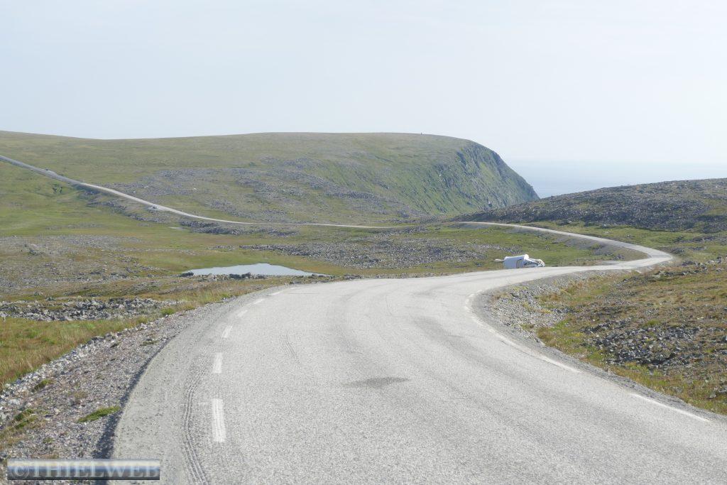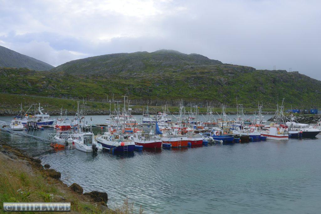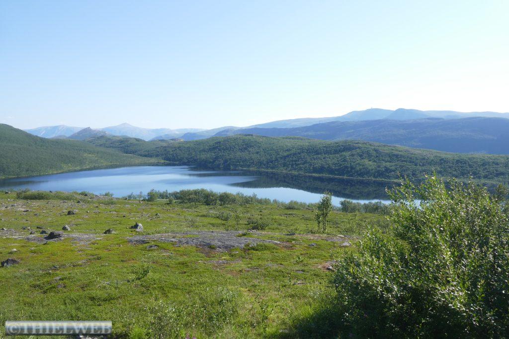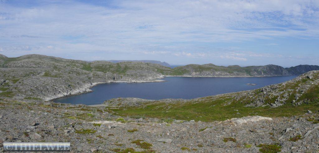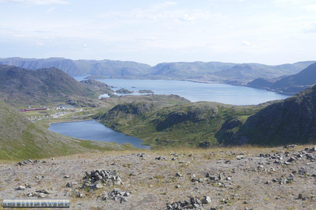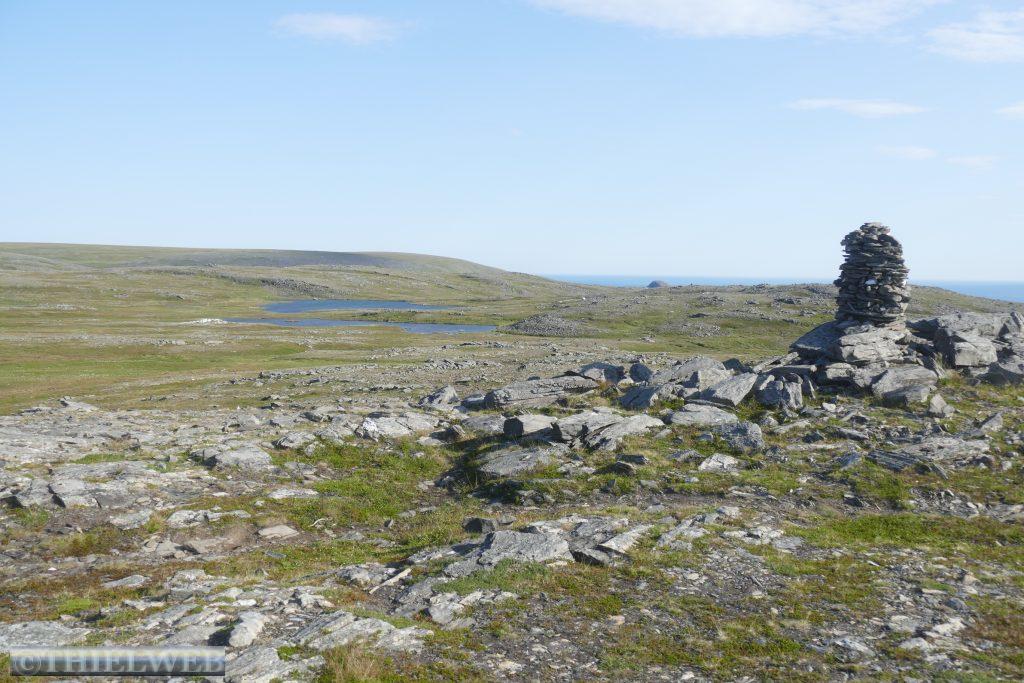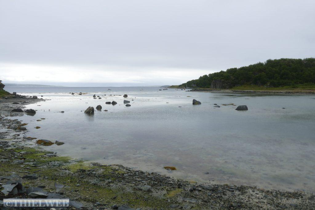 Heute wollen wir zum wirklich nördlichsten Punkt der Insel Magerøya wandern. Der Name der Landzunge ist Knivskjellodden und sie liegt 4,18 km westlich des Nordkaps und 1.400 m weiter nördlich. Da sie im Gegensatz zum Nordkap flach ins Meer hinausragt, ist sie weniger spektakulär. Der Weg ist flach, doch es geht immer weiter bergab. Der steinige Untergrund erfordert die volle Konzentration, obwohl der Blick in die Weite mit kleinen Seen und das Nordmeer schweifen will. Steinmännchen markieren den Weg. Der nördlichste Punkt ist durch eine Markierung gekennzeichnet. Wir können bis zur Nordkap-Kugel blicken. Dann tragen wir uns noch in das kleine Büchlein ein, bevor es nun immer bergan zurückgeht. Nach ca. 5 Stunden sind wir zurück am Parkplatz und fahren wieder Richtung Süden, wieder durch den Nordkaptunnel und weiter bis zum Stellplatz Skarvbergvika.