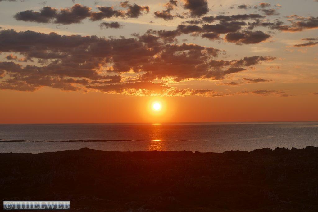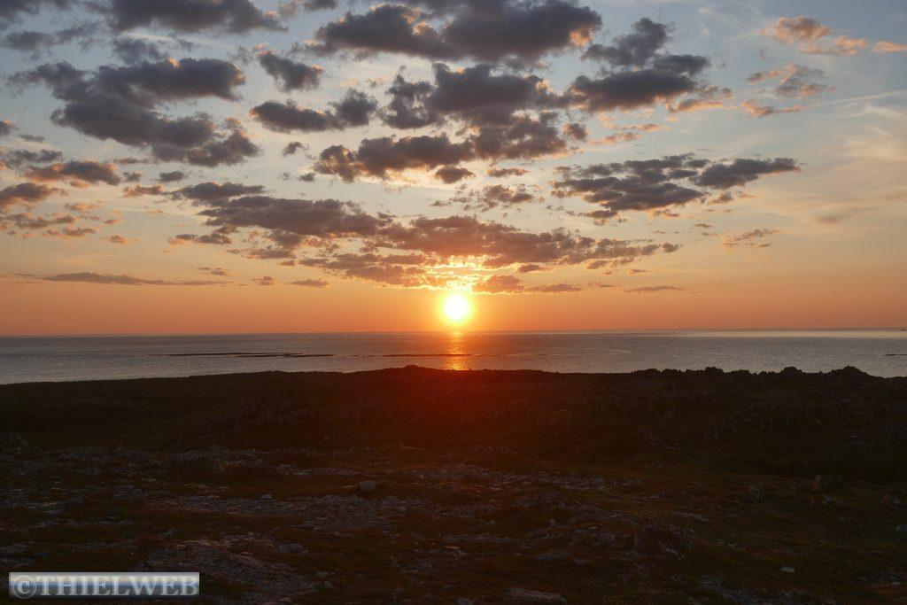 Es war gestern Abend so gegen 24 Uhr, als unsere norwegischen Nachbarn anklopften, damit wir uns das Schauspiel der Mitternachtssonne ansehen können. Das Wetter und die Umgebung waren perfekt und die Temperatur mit 20° C genial. Ein unvergessliches Erlebnis. Dabei konnten wir auch das Schiff der Hurtigruten „Trollfjord“ in der Ferne beobachten.