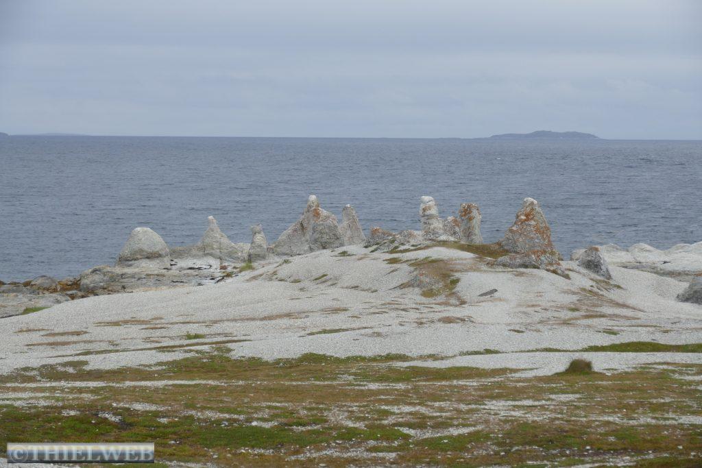 Eine Gruppe Trolle wanderte nachts über die Finnmarksvidda, um in Porsanger eine Schatzkiste zu vergraben. Sie wurden jedoch beobachtet und zogen weiter zum nahegelegenen Fjord. Doch die aufgehende Sonne ließ sie zu Stein erstarren und so stehen sie noch heute als Steinformationen am Fjordufer von Trollholmsund in der Region am Eismeer. Wir wandern vom Parkplatz in Trollholmsund über die Klippen hinunter zu den bizarren halbkreisförmigen weißen Dolomit Formationen der versteinerten Trolle der alten samischen Sage. An die abrupten kühleren Temperaturen von 13° C und dazu Wind müssen wir uns erst gewöhnen.