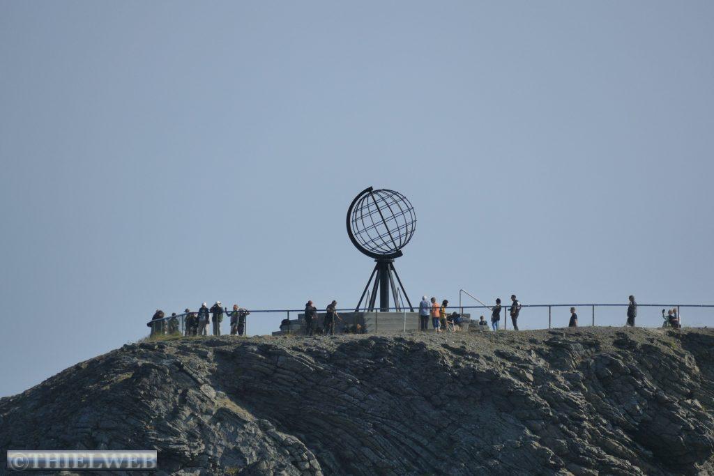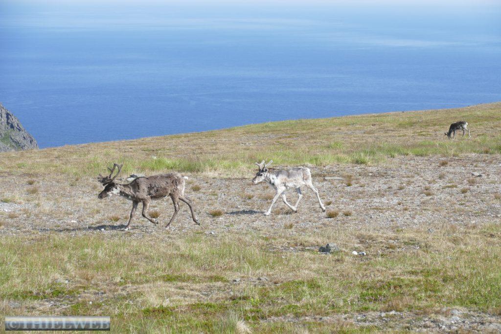 Aufgrund des Bryggefestivals in Skarsvåg war die ganze Nacht laute Musik und ließ uns kaum schlafen. Der Morgen sieht mit 18° C und wenigen Wolken vielversprechend aus. Wir fahren die letzten 13 km durch die typische arktische Landschaft und sehen unterwegs immer wieder Rentierherden. Kurz vor dem Nordkap parken wir auf einem Wanderparkplatz an der E69. Einmal am nördlichsten Punkt Europas zu stehen, ist auch unser Traum, obwohl die Touristenströme schon abschreckend sind. Die 6,5 km bis dorthin müssen wir auf der Straße zurücklegen, einen Wanderweg gibt es leider nicht. Doch wir werden auf dem 307 m hohen Nordkapfelsen über dem Eismeer mit einem traumhaften Panoramablick auf die Klippen des Knivskjelodden, die berühmte Weltkugel und das Nordkapdenkmal belohnt. Nun trennen uns nur noch 2.100 km vom Nordpol. Kein Wölkchen am Himmel und 23° C am Nachmittag, den wir zur Erholung von der Nacht nutzen. Wir haben vom Start unserer Reise bis hierher 5.280 km zurückgelegt.