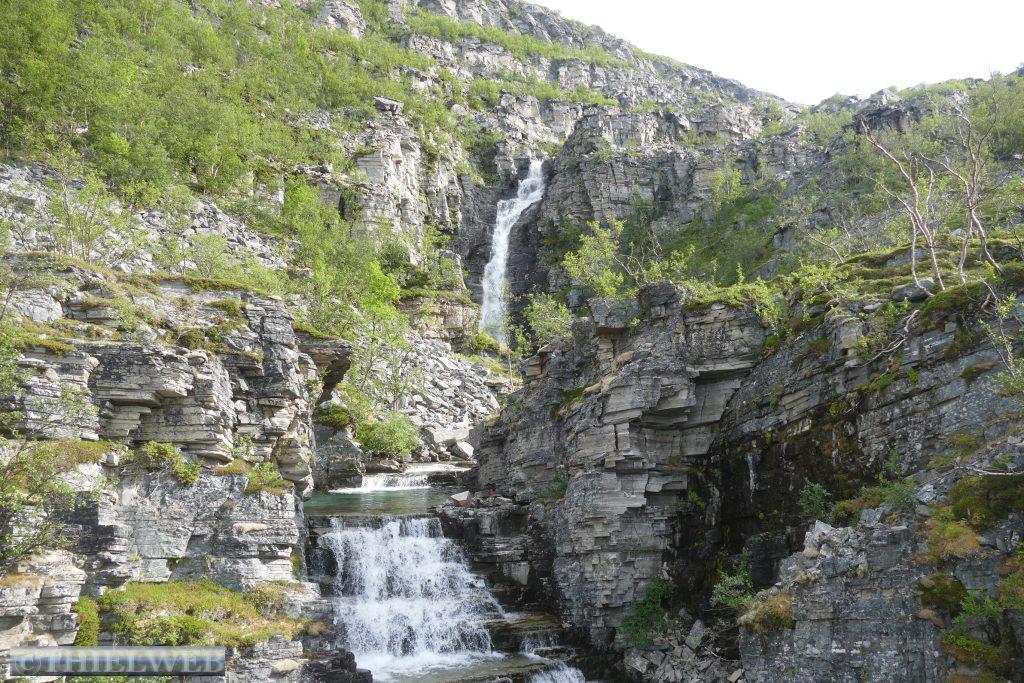 Der heutige Tag steht unter dem Motto der drei Wasserfälle. Erster Anlaufpunkt ist der Navitfossen dessen Wassermassen sich circa 15 Meter tief direkt in den Kvænangenbotn ergießen. Hier parken wir und machen uns zu einer ca. 1 km langen Wanderung auf einem schönen Waldweg hinauf zum Røykfossen. Schon von weitem hören wir das Tosen der Wassermassen, die sich etwa 30 m herabstürzen. Eine Wasserwolke hängt über dem spektakulären Wasserfall, die ihm seinen Namen Rauchwasserfall gibt. Danach fahren wir weiter auf der E6 bis zum Hinweisschild auf den Fosselvfossen. Ein sehr steiler Wanderweg bringt uns immer weiter hinauf, begleitet von dem Rauschen des Baches. Unterwegs verliert sich unser Pfad, doch zum Glück kommt eine norwegische Familie, die uns die Richtung zeigt. Dann stehen wir oberhalb der Baumgrenze auf 230 Höhenmetern und nach ca. 1,6 km vor dem Wasserfall, der sich 64 Meter in die Tiefe stürzt. Schneereste liegen in geschützten Stellen. Der Blick auf den Straumfjord begleitet uns auf dem Weg hinunter zum Parkplatz. Danach suchen wir uns einen schönen Wanderparkplatz kurz vor Storslett im Reisautløpet Naturreservat.