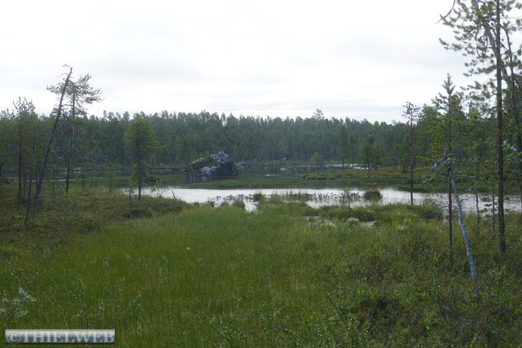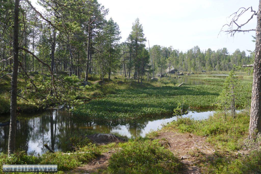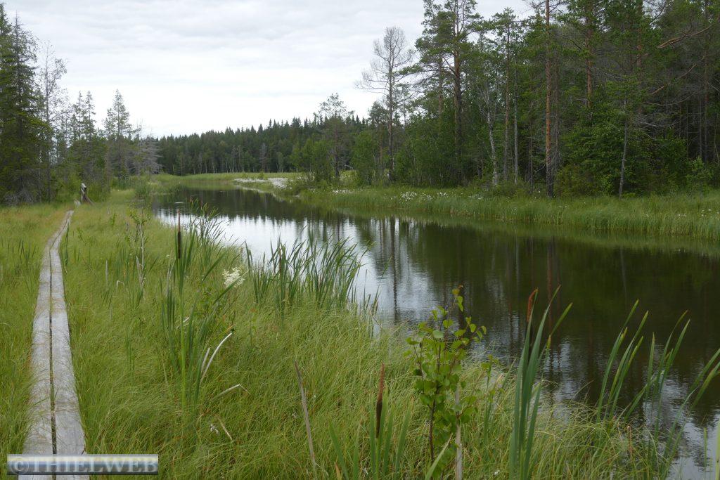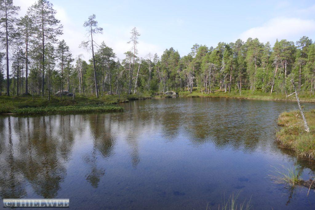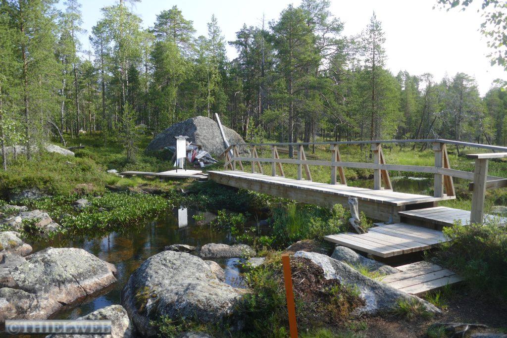 Nach dem gestrigen langen Fahrtag wollen wir heute eine kleine Wanderung durch die sagenhafte nordfinnische Natur zur Pielpajarvi Wildniskirche machen. Sie ist eine ganz besondere Kirche, die 1760 auf dem ursprünglichen Winterdorf der halbnomadischen Samen errichtet wurde. Ein gut markierter Wanderweg über Wurzeln und Steine, an Seen vorbei über Stege und eine Brücke führt zur kleinen Holzkirche.
