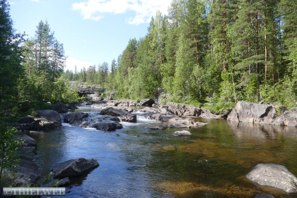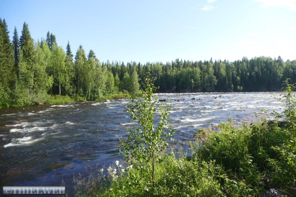 Denselben Weg nehmen wir dann zurück und fahren noch bis zur finnisch norwegischen Grenzort Utsjoki. Wir parken direkt am Fluss mit Blick auf die Sápmi Brücke.