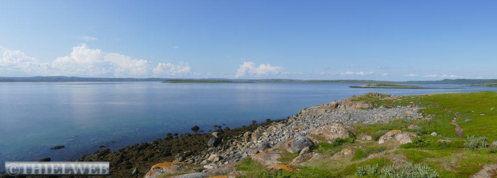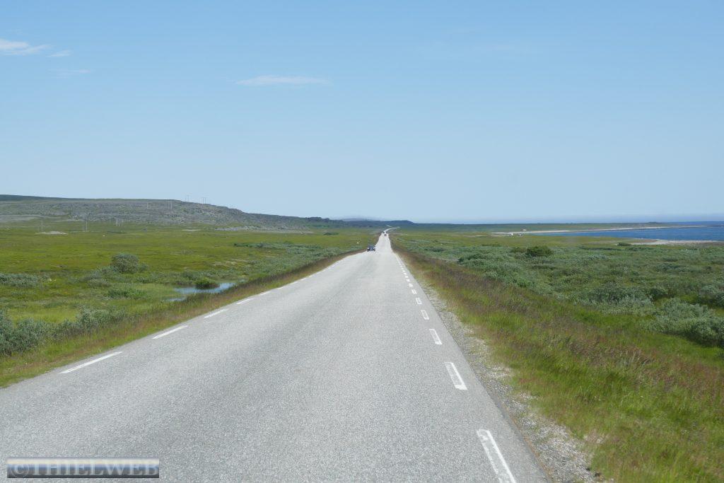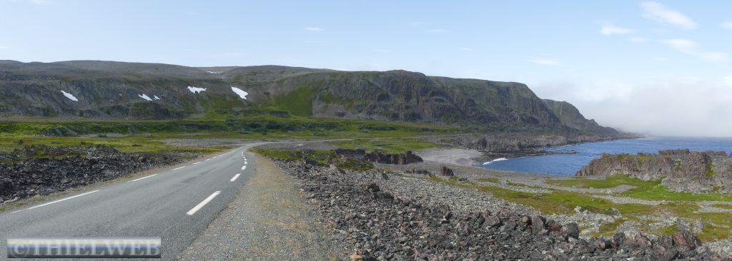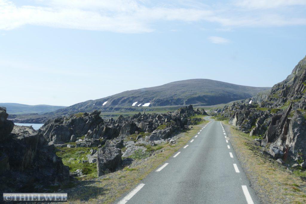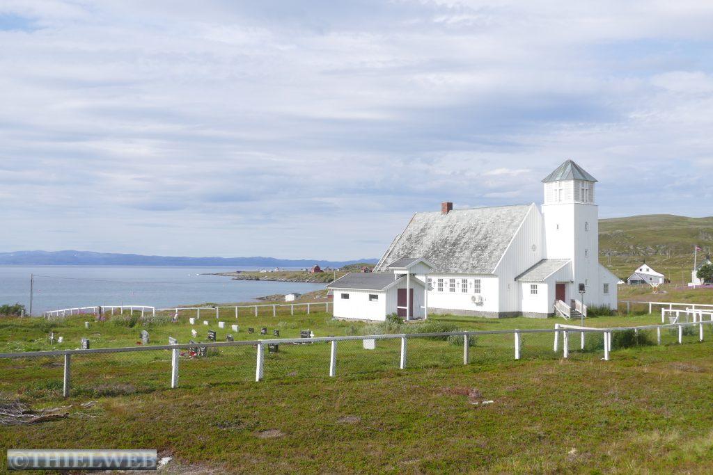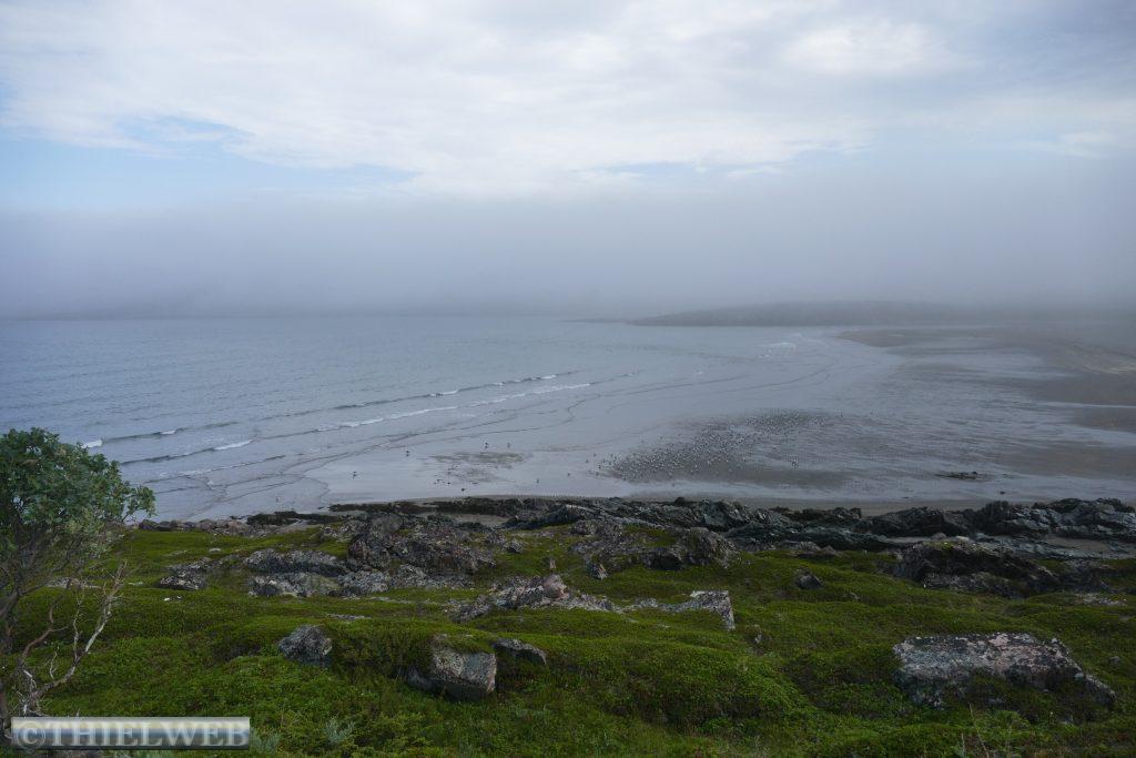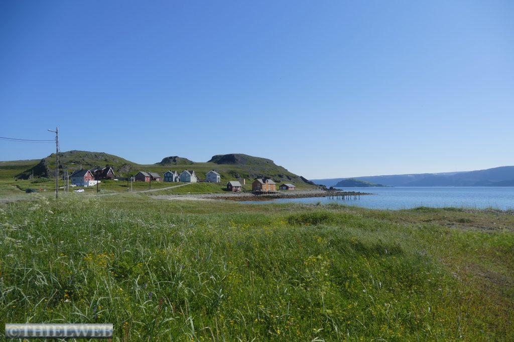 Am Morgen fahren wir über die Grenze nach Norwegen und weiter bis Tana Bru dem größten Ort im Osten der Provinz Finnmark. Er erhielt seinen Namen von der Brücke über den Fluss Tanaelva. Sie ist die einzige über den Tanaelv auf seinen ca. 100 km. Mittlerweile sind es angenehme 24° C, wir gehen einkaufen und tanken bevor wir auf der Landschaftsroute Varanger weiterfahren. Am Aussichtspunkt auf die Stromschnellen des Tana Flusses machen wir ein Foto. Der erste Stopp auf der Landschaftsroute ist am Rastplatz Gornitak bevor wir in Nesseby einen kurzen Spaziergang zur Kirche am Fjord machen. Sie hat beim Rückzug der deutschen Armee die Taktik der verbrannten Erde als einziges Gebäude überstanden. Die Barendssee ist spiegelglatt und hat gerade Ebbe. Dann schlängelt sich die Landschaftsroute immer entlang der Küste bis zum Rastplatz mit der Attraktion Mortensnes mit Museum. Wir gehen ein Stück auf dem Kulturpfad bis zum Steinblock „Transteinen“ und dem alten Torfhaus. Ein längeres Stück Fahrt und wir erreichen den nächsten Rastplatz, den Berg Domen, an dem sich nach alten Volksglauben die Hexen mit Satan trafen. Die einzigartige Aussicht auf den Fjord wird uns durch den berüchtigten, plötzlich aufziehenden Nebel versperrt. Die Temperatur ist mittlerweile auf 11° C gefallen und die Landschaft hat sich total verändert, karg und weitläufig. An der Insel Vardø entscheiden wir uns, die Landschaftsroute bis zum Ende zu fahren und auf dem Rückweg die Insel Vardø zu besuchen. Immer spektakulärer wird die Landschaft. 30 km auf einer 3 m breiten Straße fordern neben den Rentieren die volle Aufmerksamkeit. Auch müssen wir immer wieder einen Fotostopp machen, so grandios ist es. Haben wir noch vor kurzem weiße Punkte am Horizont gesehen, so wissen wir nun, dass es doch einige Schneereste sind. Endpunkt der Varanger Landschaftsroute ist der Vogelbeobachtungsposten Hamningberg. Die Varanger gehört zu den besten Vogelbeobachtungsgebieten weltweit. Wir beschließen, hier zu übernachten und sehen uns noch den kleinen Ort an, der sich irgendwie wie das Ende der Welt bzw. Europas anfühlt.