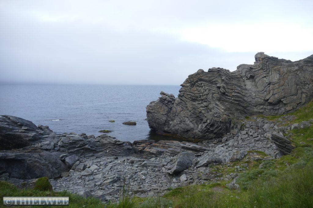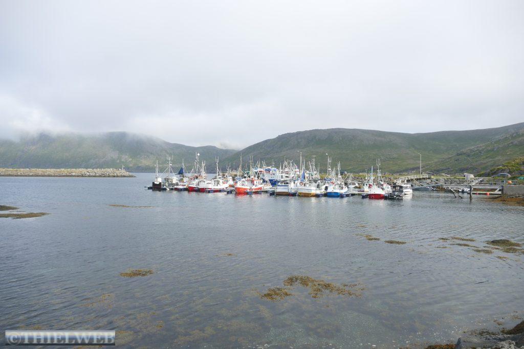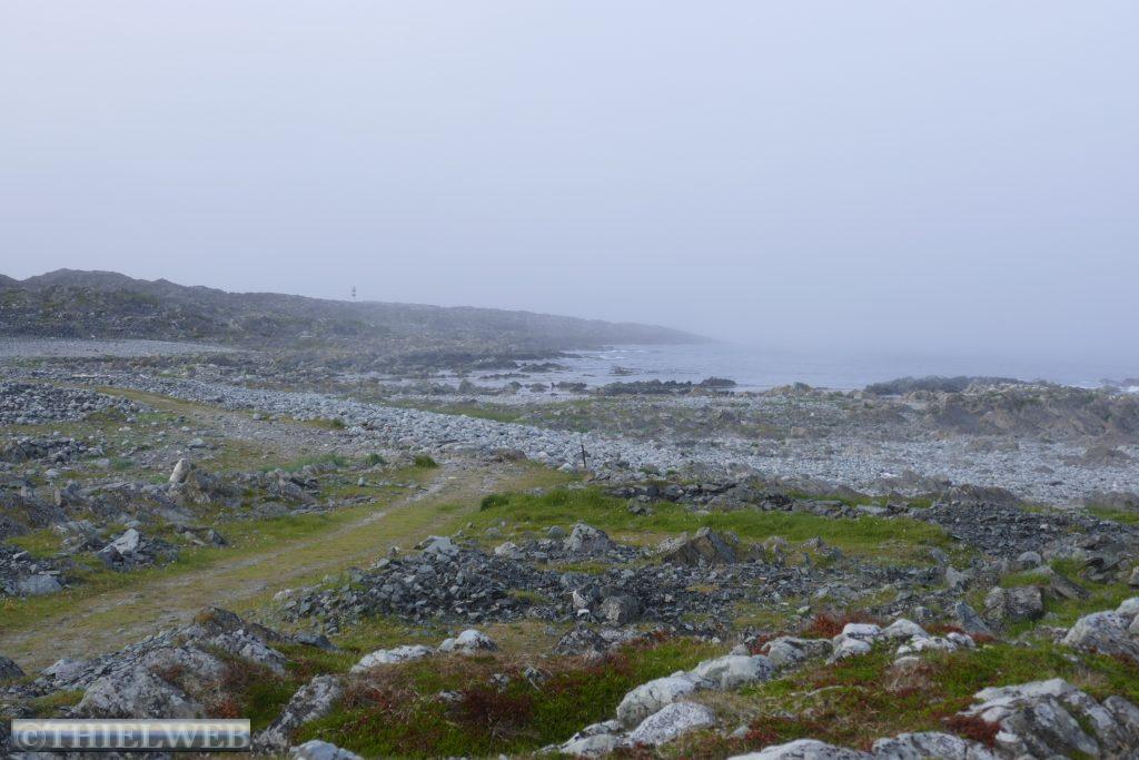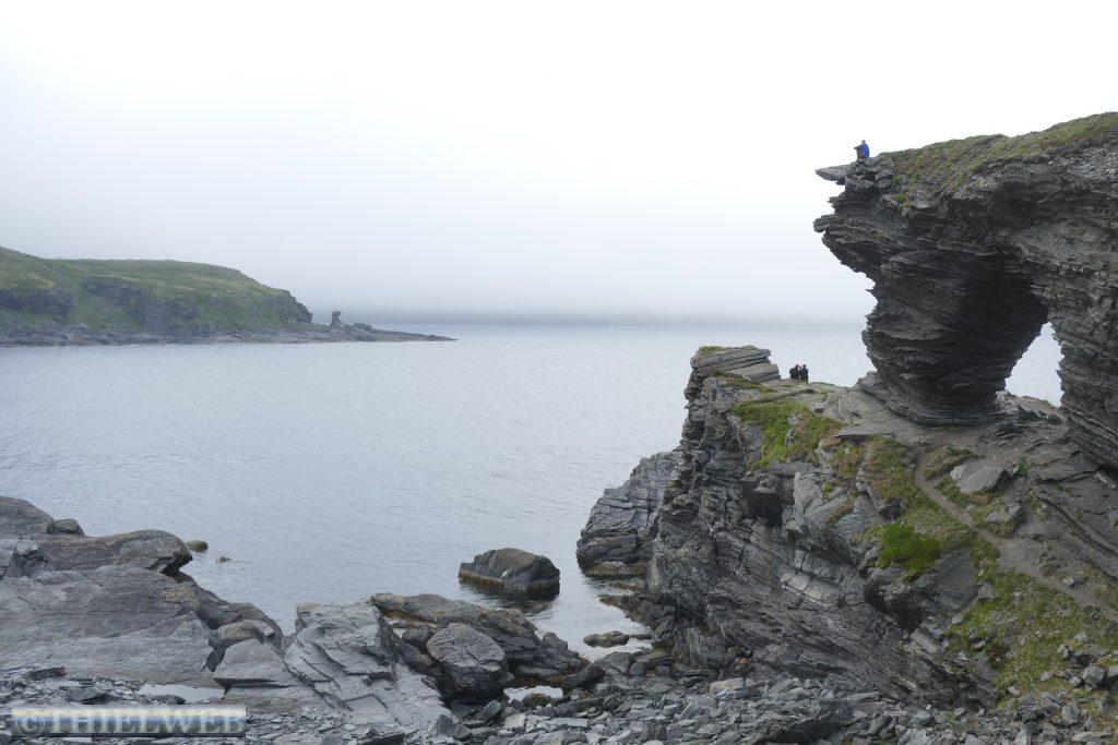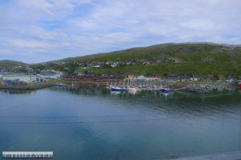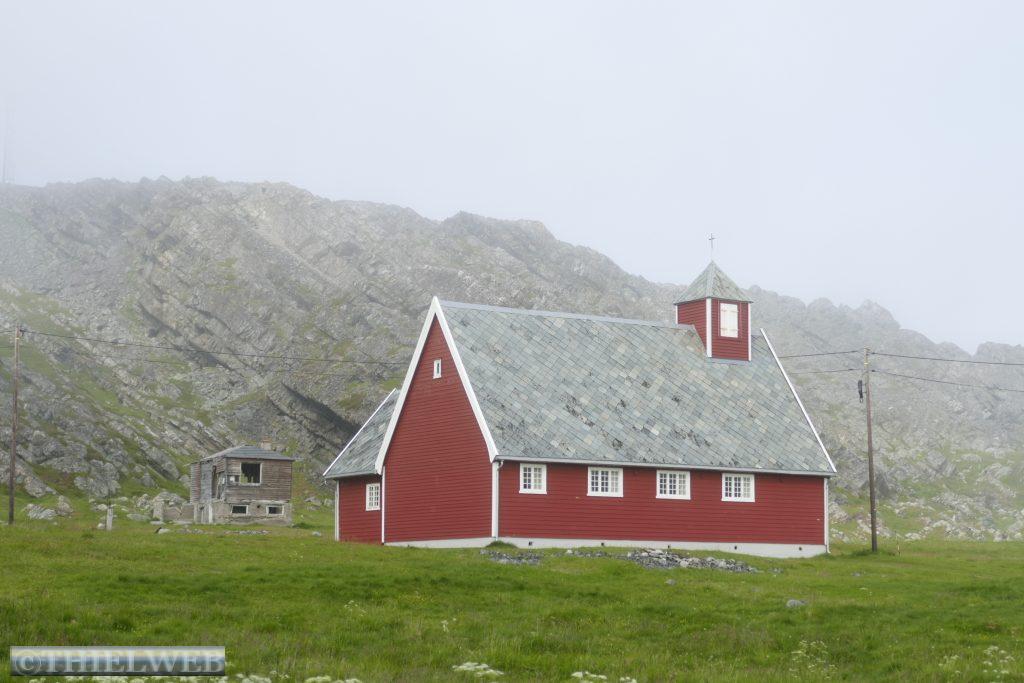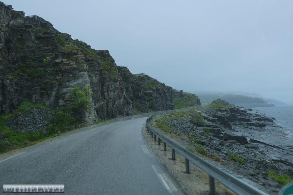 Dann folgen wir auf der E69 zur Nordkap-Insel Magerøya, der Heimat des Nordkaps. Nach ca. 115 km erreichen wir den Nordkaptunnel, mit einer Steigung von 9 % liegt er an der tiefsten Stelle 212 m unter dem Meeresspiegel und ist mit einer Länge von 6.875 m der drittlängste Unterwassertunnel Europas. In Honningsvag sehen wir uns den zentralen Anlaufhafen der Hurtigruten an. Schließlich fahren wir noch ein Stück nordwärts und parken in Skarsvåg, wo hinter der kleinen weißen Kirche der 2,5 km lange Wanderweg zu den spektakulären Felsformationen Kirkeporten beginnt, dem Felsen mit dem riesigen Loch. Bei klarem Wetter kann man durch die mehrere Meter breite Öffnung das Nordkap-Horn sehen, aber leider nicht heute bei dem Nebel.