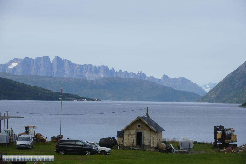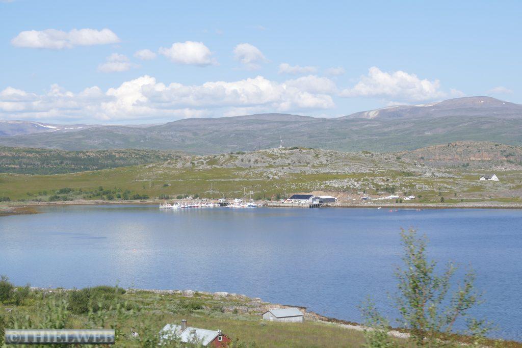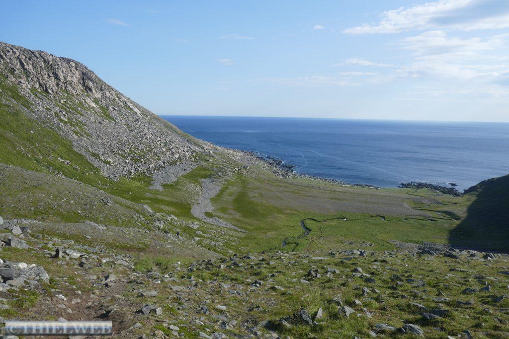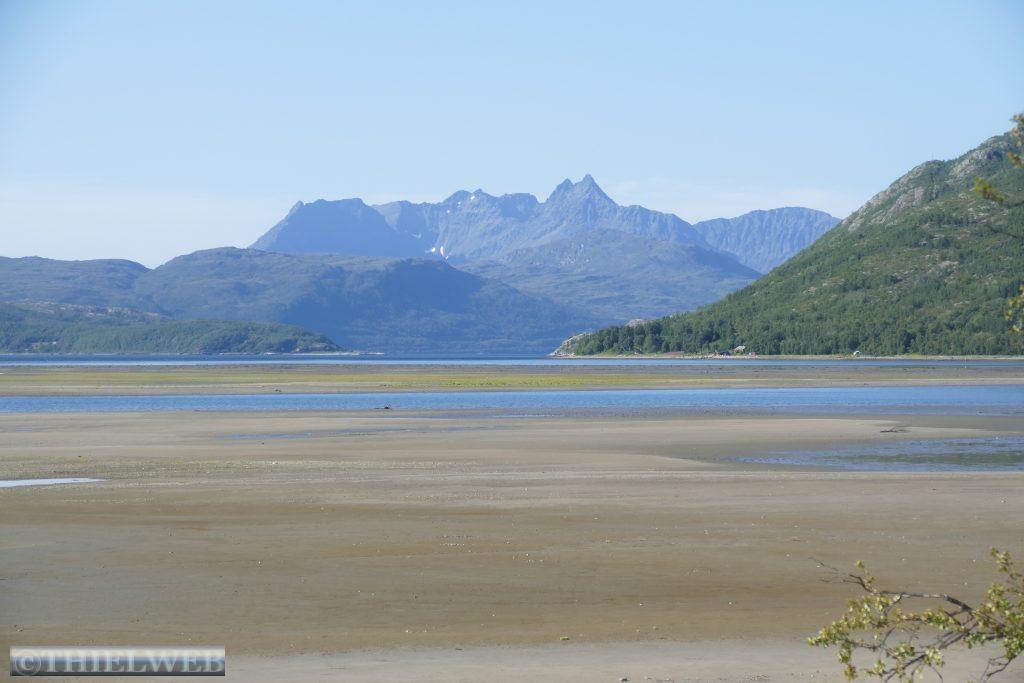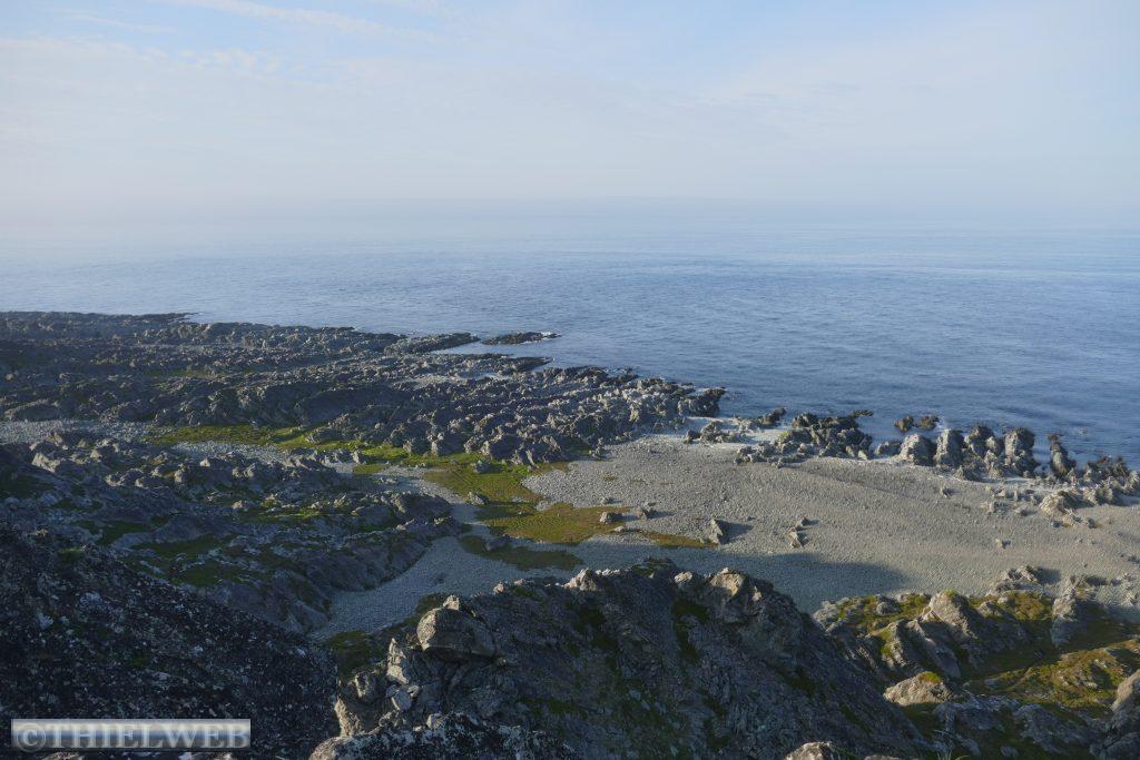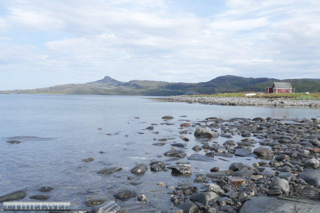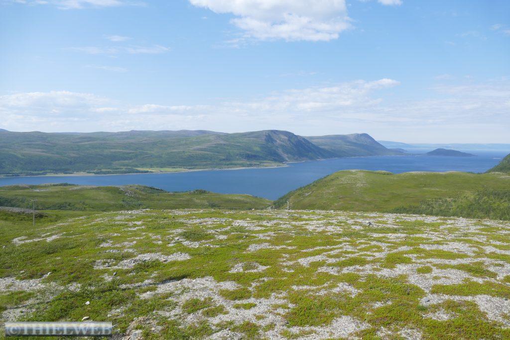 Am Morgen tanken wir noch einmal voll und besorgen frische Lebensmittel. Dann fahren wir auf der Varanger Halbinsel in Richtung Norden auf der Eismeer-Straße (890) nach Berlevåg. Bevor wir die Hochebene Juladalen überqueren, führt die Straße am Fjordufer und der Mündung des Tanaelva mit riesigen Sandbänken entlang. Ab Kongsfjord folgen wir der Küstenlinie, mächtige Berge mit bizarren Felsformationen, auf der anderen Seite blicken wir auf das Meer. Bevor wir Berlevåg erreichen, kommen wir am Leuchtturm Kjølnes Fyr vorbei, der den Seefahrern den Weg durch die berühmt-berüchtigte tückische Barentssee weist. Zuerst wollen wir jedoch die populäre Rundwanderung entlang der Küste hinauf zum Tanahorn unternehmen. Oben angekommen stehen wir vor dem alten samischen Opferplatz auf 266 m Höhe und haben einen umwerfenden Blick auf die Eismeer-Küste von Nordnorwegen und den Tanafjord. Der Wind weht kräftig, doch ist es bei 28° C recht angenehm. Wir fahren wieder ein Stück zurück zum Kongsfjord und suchen uns einen schönen Platz mit Blick zum Fjord für die Nacht. Als wir für unseren Kaffee Wasser nehmen wollen, kommt keines – oh Schreck. Zum Glück hatte sich nur die Wasserpumpe gelöst.