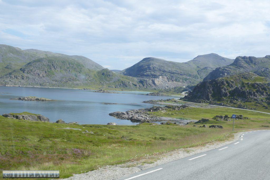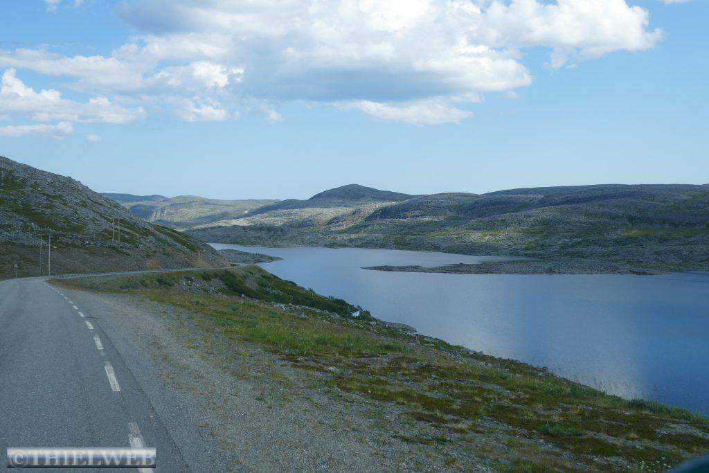 Heute wollen wir zum wirklich nördlichsten Punkt der Insel Magerøya wandern. Der Name der Landzunge ist Knivskjellodden und sie liegt 4,18 km westlich des Nordkaps und 1.400 m weiter nördlich. Da sie im Gegensatz zum Nordkap flach ins Meer hinausragt, ist sie weniger spektakulär. Der Weg ist flach, doch es geht immer weiter bergab. Der steinige Untergrund erfordert die volle Konzentration, obwohl der Blick in die Weite mit kleinen Seen und das Nordmeer schweifen will. Steinmännchen markieren den Weg. Der nördlichste Punkt ist durch eine Markierung gekennzeichnet. Wir können bis zur Nordkap-Kugel blicken. Dann tragen wir uns noch in das kleine Büchlein ein, bevor es nun immer bergan zurückgeht. Nach ca. 5 Stunden sind wir zurück am Parkplatz und fahren wieder Richtung Süden, wieder durch den Nordkaptunnel und weiter bis zum Stellplatz Skarvbergvika.