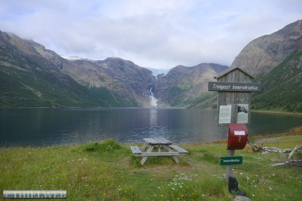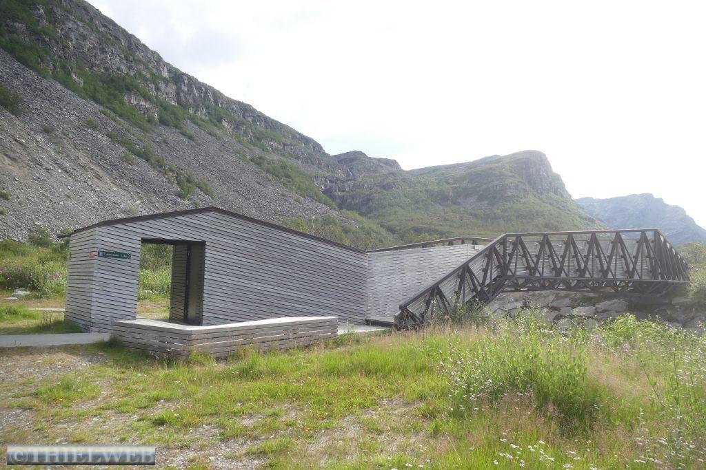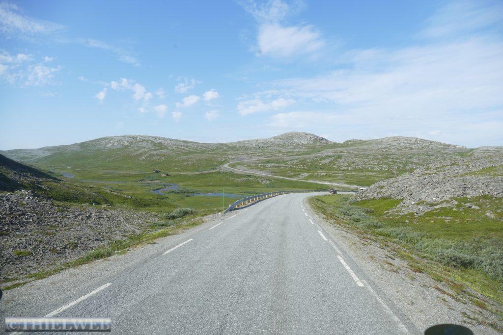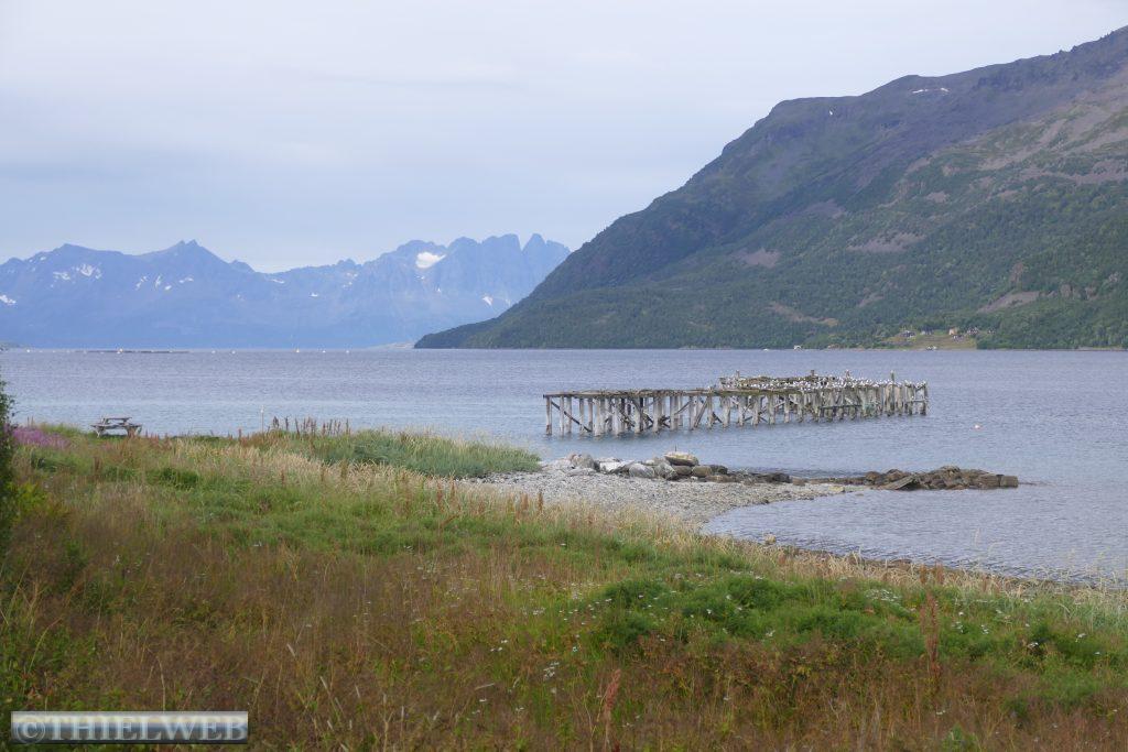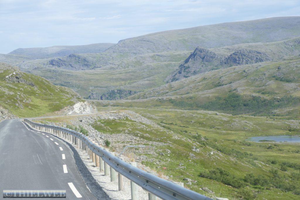 Nach ca. 20 km auf der E69 biegen wir bei Smørfjordauf auf die 889 ab. Unser Ziel ist heute die Landschaftsroute Havøysund. Der erste Rastplatz Storberget liegt idyllisch oberhalb des Flusses Russelva. Hier erreichen wir den Fjord und den Arktischen Ozean. Nach einer kurzen Pause fahren wir bis zum Ende des Fjordarms und gleichzeitig der Hälfte der Landschaftsroute zum Rastplatz Lilleford. An der Fußgängerbrücke über den Fosseelva beginnt ein Wanderweg, der am Fluss entlang führt. Wir nutzen die kurze Wanderung bis zum Wasserfall. Anschließend fahren wir weiter bis zur Stelle, wo der Snefjordelva in den Snefjord mündet. Die Straße wird landseitig flankiert von bizarren Felsformationen, gegenüber blicken wir auf das Eismeer. Dann erreichen wir den höchsten Punkt mit 220 m. Am Ufer von Selvika befindet sich die geschützte Sandbukra mit einladendem Sandstrand. Ein Weg schlängelt sich zum Grillplatz am Strand hinunter. Wir lassen den letzten Rastplatz mit der Kunstinstallation erst einmal links liegen und fahren zu unserem Stellplatz in Havøysund. Von hier aus wandern wir hinauf zum Windpark und weiter bis zum Arctic View, der sich über einer 200 m hohen Klippe mit Blick gegen den Nordpol befindet. Der Himmel hat sich binnen kurzer Zeit verdunkelt und wir hören ein Brummeln. Schnell machen wir uns auf den 5 km langen Rückweg. Der Himmel wird immer bedrohlicher und taucht die Landschaft in ein unwirkliches Licht. Erste Blitze zucken am Himmel. Da kommt ein Auto, dass auf unser Winken anhält und uns bis zum Parkplatz mit zurücknimmt. Kaum sind wir im Wohnmobil beginnt es kräftig zu regnen. Die Temperatur fällt auf 14° C, welch ein Glück wir hatten.
