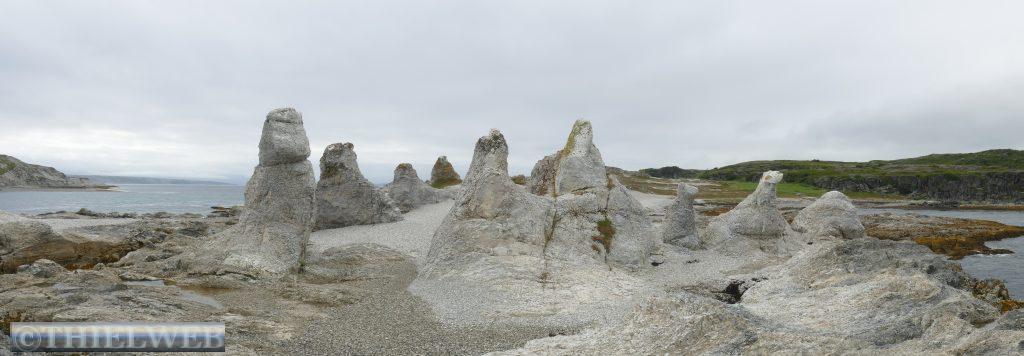 Eine Gruppe Trolle wanderte nachts über die Finnmarksvidda, um in Porsanger eine Schatzkiste zu vergraben. Sie wurden jedoch beobachtet und zogen weiter zum nahegelegenen Fjord. Doch die aufgehende Sonne ließ sie zu Stein erstarren und so stehen sie noch heute als Steinformationen am Fjordufer von Trollholmsund in der Region am Eismeer. Wir wandern vom Parkplatz in Trollholmsund über die Klippen hinunter zu den bizarren halbkreisförmigen weißen Dolomit Formationen der versteinerten Trolle der alten samischen Sage. An die abrupten kühleren Temperaturen von 13° C und dazu Wind müssen wir uns erst gewöhnen.