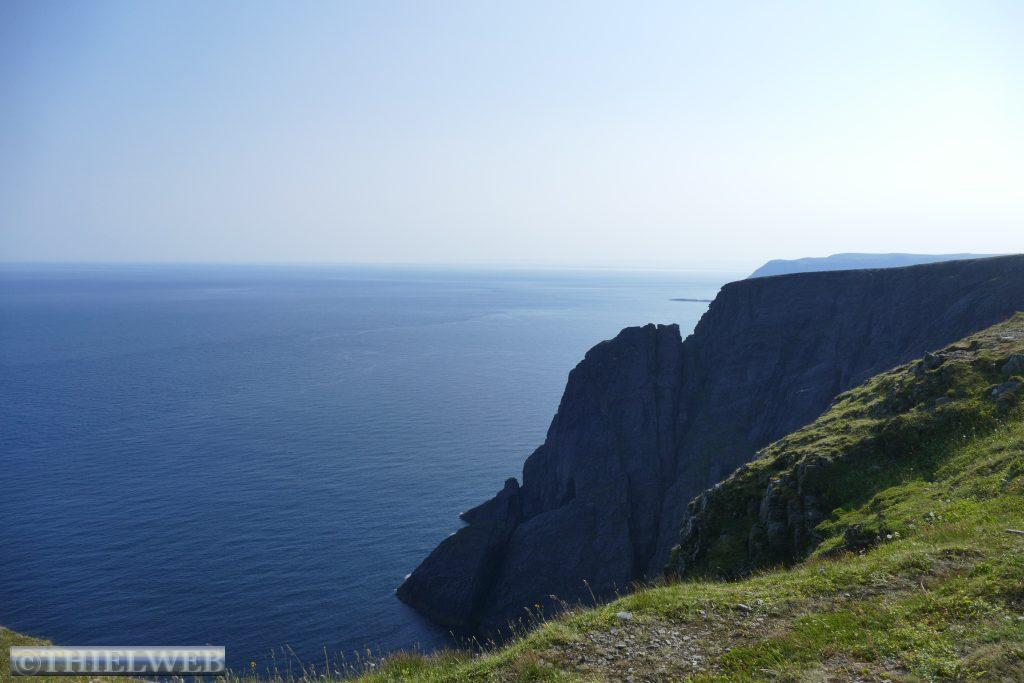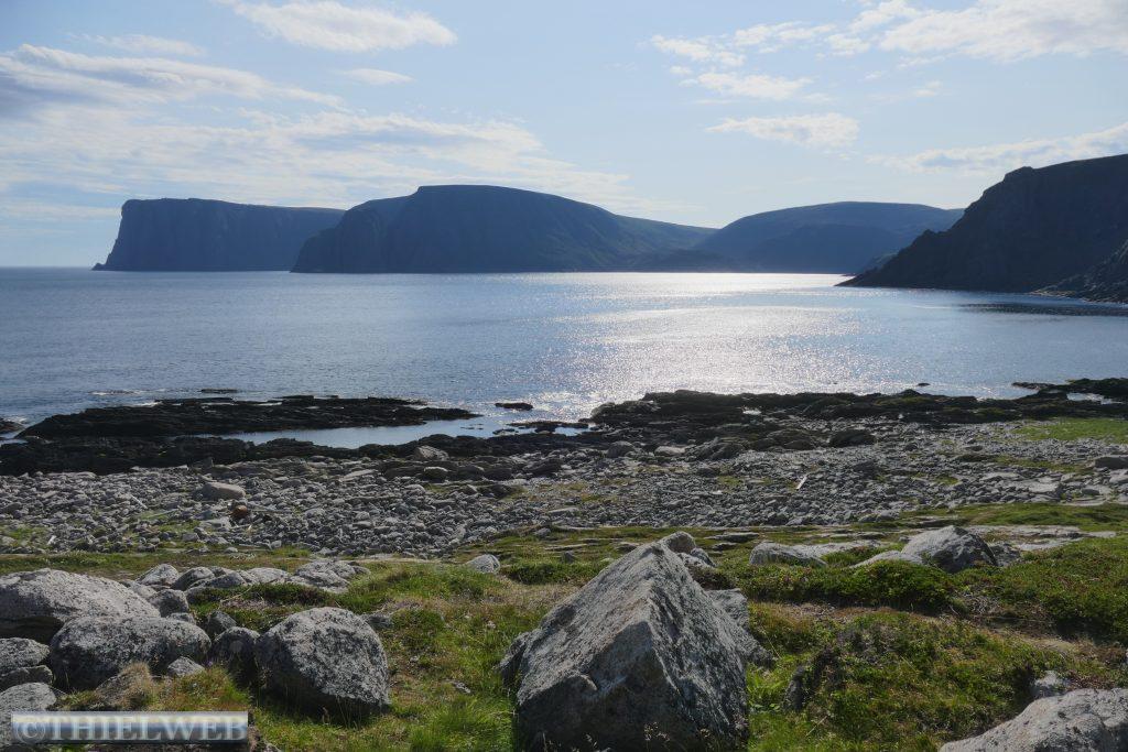 Eine tropische Nacht liegt hinter uns mit 20° C! Wir fahren auf der 890 zurück bis Tana. Erledigen die gewohnten Dinge und machen uns auf die Fahrt auf die nächste Halbinsel in Richtung Norden. Bis Kalak verläuft die Straße entlang der Küstenlinie, bevor wir auf die Slettfjellet Hochebene kommen. Die Straße schraubt sich auf 300 Höhenmeter. Kein Baum, kein Strauch, unendliche Weiten voller Steine, kleine und große Seen, dazwischen ein wenig grün. Eine unwirkliche Landschaft. In Mehamn erreichen wir die Küste. Nun sind es noch ca. 20 km bis zum nördlichsten Leuchtturm des europäischen Festlandes, den Slettnes Fyr in Gamvik inmitten eines imposanten Naturreservates. Der Leuchtturm wurde 1905 erbaut, 1944 zerstört und in den Jahren 1945 bis 1948 wieder aufgebaut. Das Wetter bleibt beständig bei 29° C, mit einer guten Brise, die die Mücken fernhält. So machen wir uns auf eine kleine schöne Wanderung auf einem markierten Weg durch das Naturreservat. In der Ferne erkennen wir die Küstenlinie des „wahren Nordkap“ sowie dahinter das Nordkap Horn.