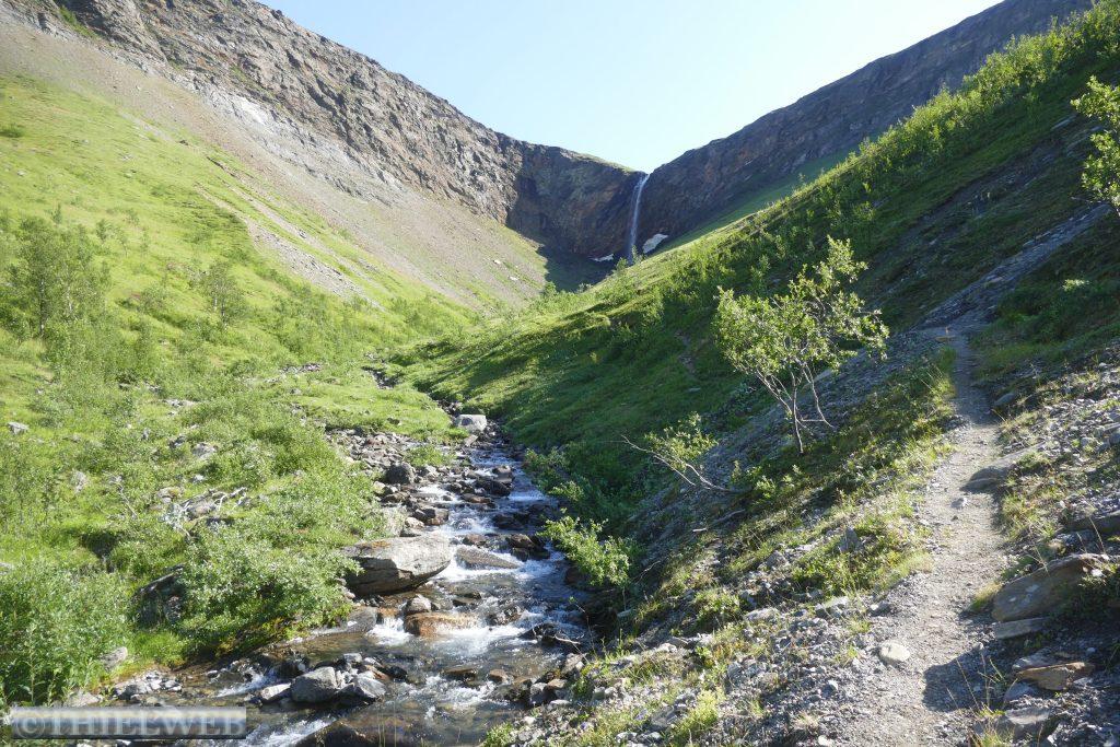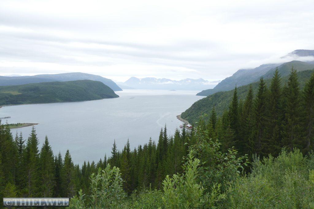 Der heutige Tag steht unter dem Motto der drei Wasserfälle. Erster Anlaufpunkt ist der Navitfossen dessen Wassermassen sich circa 15 Meter tief direkt in den Kvænangenbotn ergießen. Hier parken wir und machen uns zu einer ca. 1 km langen Wanderung auf einem schönen Waldweg hinauf zum Røykfossen. Schon von weitem hören wir das Tosen der Wassermassen, die sich etwa 30 m herabstürzen. Eine Wasserwolke hängt über dem spektakulären Wasserfall, die ihm seinen Namen Rauchwasserfall gibt. Danach fahren wir weiter auf der E6 bis zum Hinweisschild auf den Fosselvfossen. Ein sehr steiler Wanderweg bringt uns immer weiter hinauf, begleitet von dem Rauschen des Baches. Unterwegs verliert sich unser Pfad, doch zum Glück kommt eine norwegische Familie, die uns die Richtung zeigt. Dann stehen wir oberhalb der Baumgrenze auf 230 Höhenmetern und nach ca. 1,6 km vor dem Wasserfall, der sich 64 Meter in die Tiefe stürzt. Schneereste liegen in geschützten Stellen. Der Blick auf den Straumfjord begleitet uns auf dem Weg hinunter zum Parkplatz. Danach suchen wir uns einen schönen Wanderparkplatz kurz vor Storslett im Reisautløpet Naturreservat.