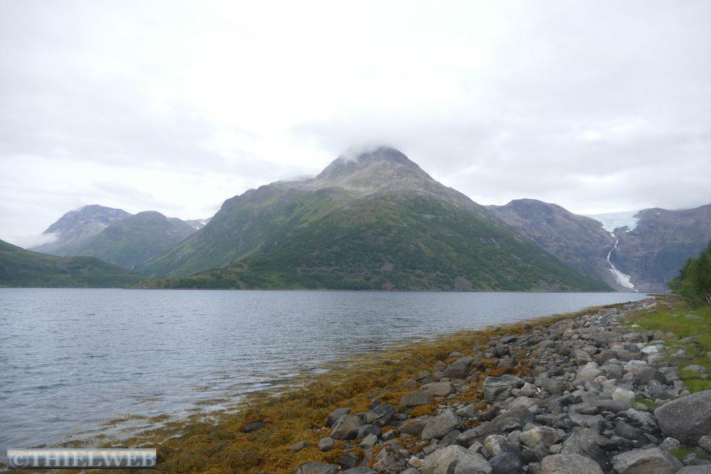 Eigentlich sollte heute der Alta Canyon und der Orvvosfossen Wasserfall unser Ziel sein. Gestern haben wir noch einmal ausgiebig recherchiert. Die Anfahrt ist etwas abenteuerlich, für unser Wohnmobil und die Wanderung offenbar sehr nass, mit Flussüberquerungen und sumpfigem Gelände. Da es nun auch noch geregnet hat, ändern wir unseren Plan und fahren zu den Bubbelen ca. 70 km nordwestlich von Alta in Langfjordbotn. Er liegt am Ende des von dramatischen Bergen umgebenen Langfjords. Hier zweigen wir nach Süden ab, und gelangen in ein wunderschönes Tal. Nach ein paar Kilometern finden wir einen Parkplatz an einer Holzbrücke. Wir machen uns auf den steil ansteigenden Weg. Dann stehen wir vor der unterirdischen Spring-Quelle, die an einer unvermuteten Stelle aus dem Berg heraus blubbert. Ein faszinierendes Naturschauspiel, wie viel Wasser da mit einem Mal herauskommt. Auf dem Rückweg sehen wir überall die Hinterlassenschaften von Elchen. Nur der Verursacher lässt sich nicht blicken. Dann kehren wir wieder auf die E6 zurück und fahren eine kleine Straße nach Jøkelfjord am Isfjorden. Am Ende der Straße parken wir und wandern ca. eine Stunde einen schmalen Pfad entlang des Fjords bis zu einem Rastplatz gegenüber dem imposanten Gletscher Isfjordjøkelen, der Teil des Øksfjordjøkelen, dem neuntgrößten Gletscher des norwegischen Festlandes ist. Wir beschließen auf unserem Parkplatz mit atemberaubendem Blick auf die Bergsilhouette zu bleiben.