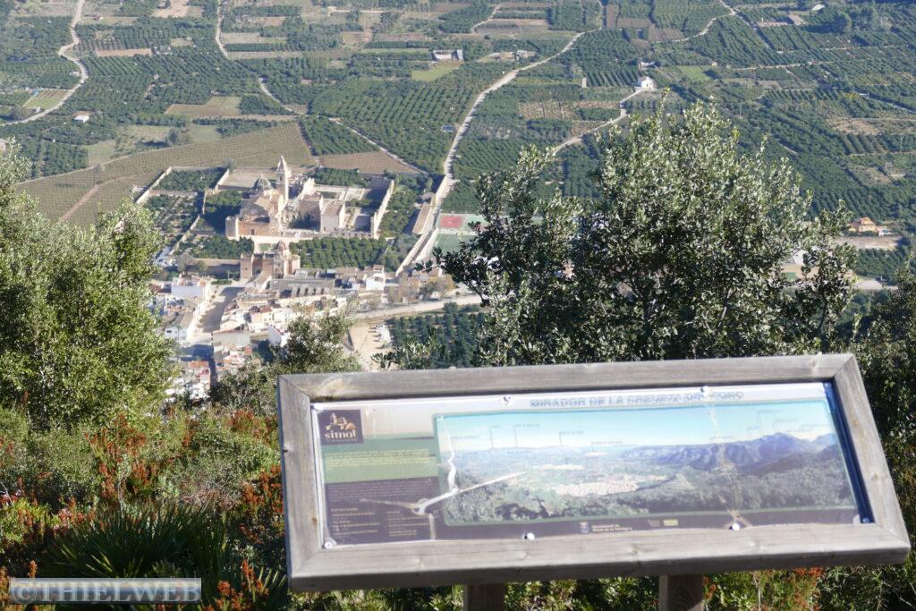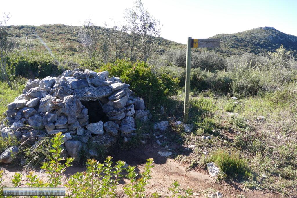 Da der windige Morgen mit 10°C noch recht frisch ist, gehen wir erst einmal einkaufen, über den Wochenmarkt und zur Esglesia de Sant Miguel, die leider nicht besichtigt werden kann. Nachdem wir den Einstieg zur Wanderung „Pujada al Toro“ gefunden haben, führt ein schmaler, sehr steiler Weg hinauf auf den 435 m hohen Simat del Toro. Wir müssen eher klettern um hinauf zu gelangen, immer wieder Ausschau haltend nach der nächsten Wegmarkierung. Wir erreichen ein fast baumloses nur mit niedrigen Büsche bewachsene Plateau der Serra del Toro. Ein weiterer Anstieg und wir sind am la Creueta mit 494 m mit tollem Ausblick bis zum Meer. Der höchste Punkt unserer Wanderung folgt kurz danach, ein Mirrador mit Betonpfeiler auf 575 m. Ein fantastischer Panoramablick entlohnt für die Mühen, doch der kalte Wind, lässt uns nur kurz verweilen. Nun geht es sanft bergab zum Pouet del Tio Pasqualo, einer mit Steinen eingehausten Quelle. Am Wendepunkt unserer Wanderung sind wir wieder auf 395 m. Richtung Simat de la Valldigna kommen wir an mehreren Forn de Calc vorbei. Wir nehmen an, dass hier früher Kalk gebrannt wurde. Ein letzter Höhepunkt der Wanderung ist die Cova de Patricio zu der ein letzter Anstieg uns herausfordert.